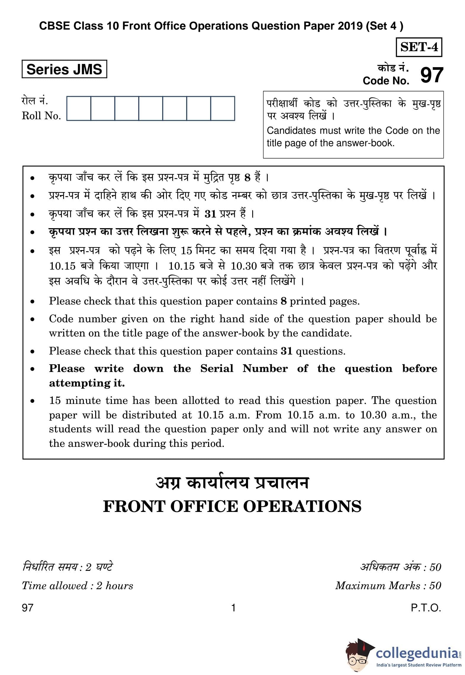 CBSE Class 10 Front Office Operations Question Paper 2019 with Answer Key is available for download. The exam was conducted by the Central Board of Secondary Education on February 27, 2019 in the Morning Session 10:30 AM to 12:30 PM. The medium of paper was English and Hindi. The question paper comprised a total of 31 questions divided among 2 sections.