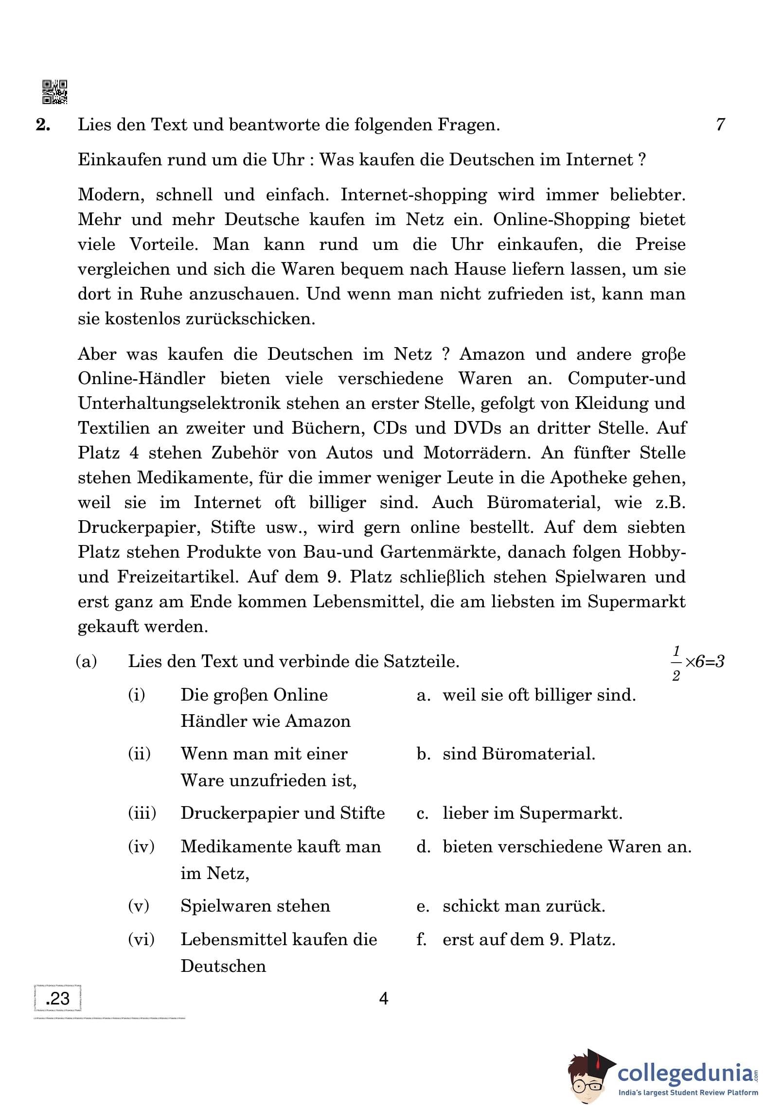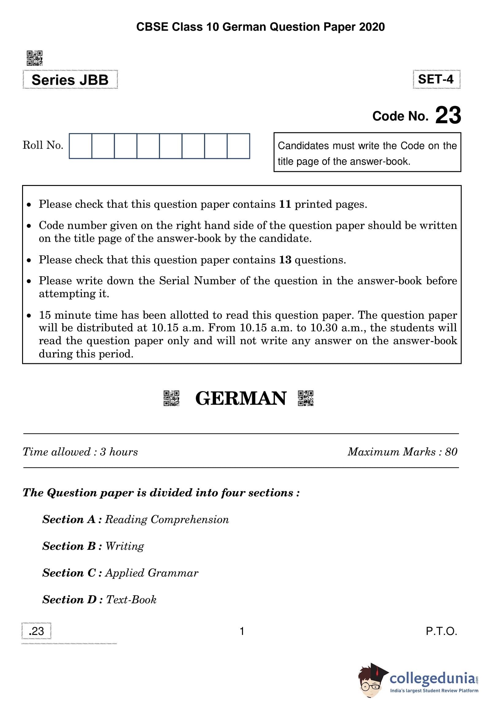 CBSE Class 10 German Question Paper 2020 with Answer Key Set 4 is available for download. The exam was conducted by the Central Board of Secondary Education on February 22, 2020 in the Morning Session 10:30 AM to 1:30 PM. The medium of paper was German. The question paper comprised a total of 13 questions divided among 4 sections.