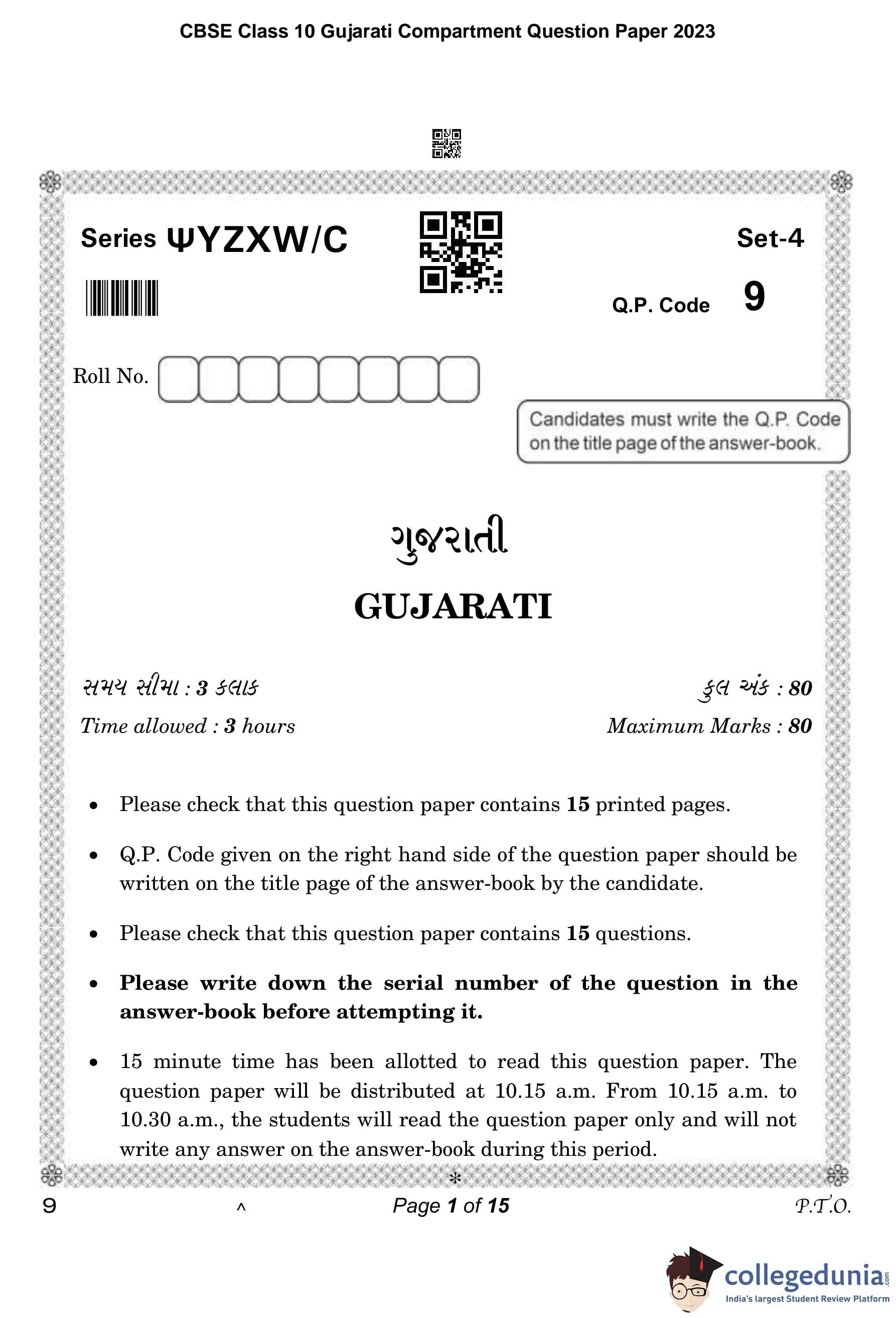 CBSE Class 10 Gujarati Compartment Question Paper 2023 with Answer Key pdf is available for download here. The exam was conducted by Central Board of Secondary Education on July 21, 2023 in the Morning Session 10:30 AM to 1:30 PM. The question paper comprised a total of 15 questions divided among 2 sections.