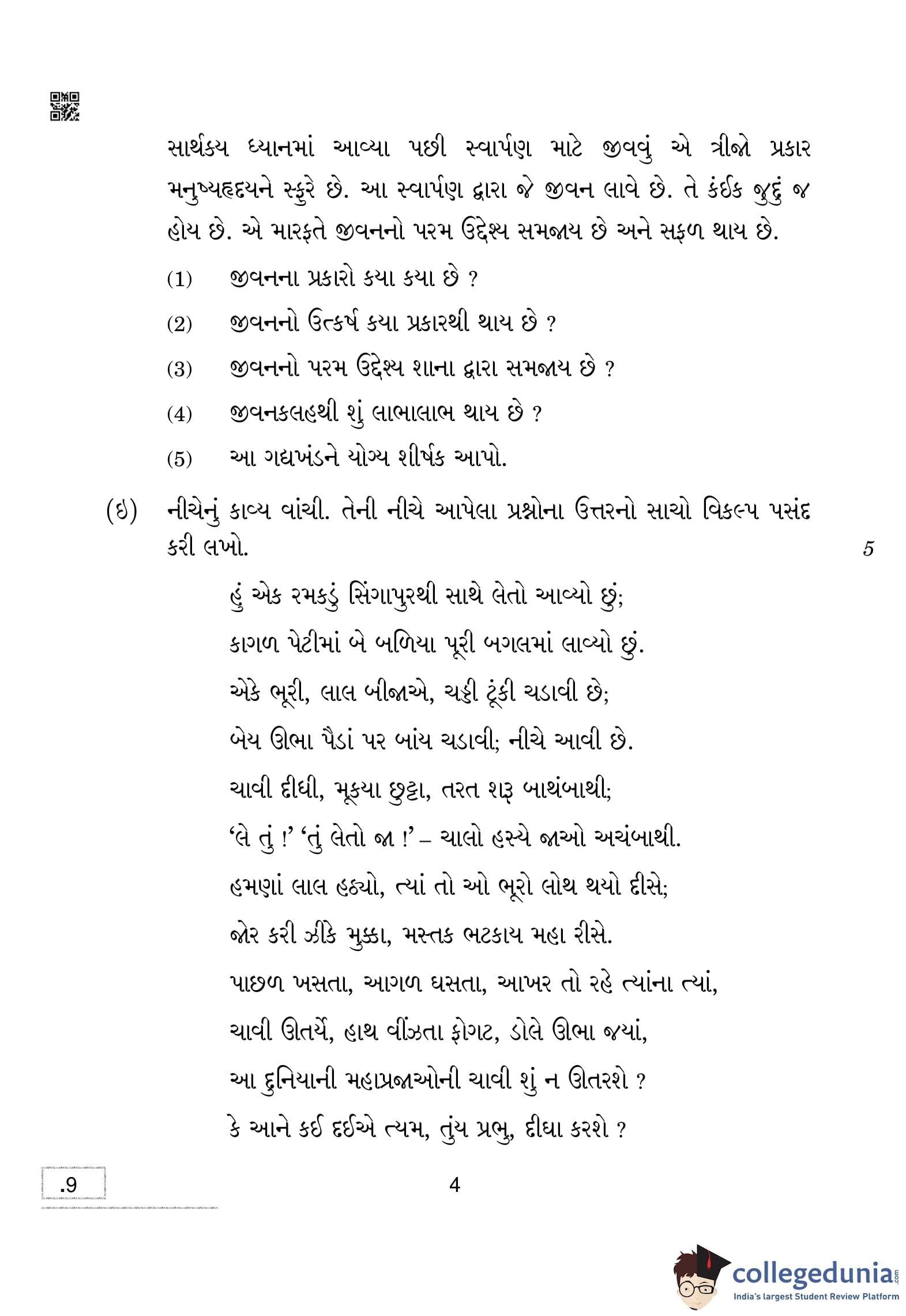 CBSE Class 10 Gujarati Question Paper 2020 with Answer Key Set 4 is available for download. The exam was conducted by the Central Board of Secondary Education on February 24, 2020 in the Morning Session 10:30 AM to 1:30 PM. The medium of paper was Gujarati. The question paper comprised a total of 5 questions divided among 4 sections.
