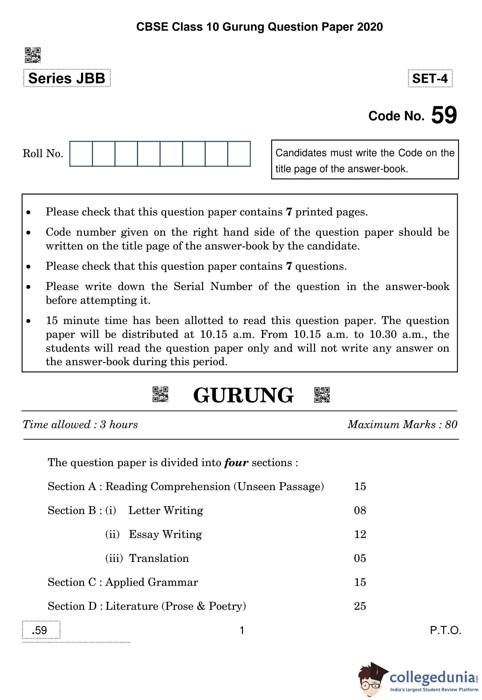 CBSE Class 10 Gurung Question Paper 2020 with Answer Key Set 4 is available for download. The exam was conducted by the Central Board of Secondary Education on February 22, 2020 in the Morning Session 10:30 AM to 1:30 PM. The medium of paper was Gurung. The question paper comprised a total of 7 questions divided among 4 sections.