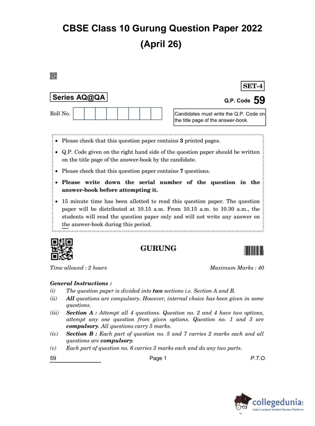 CBSE Class 10 Gurung Question Paper 2022 with Answer Key (April 26)