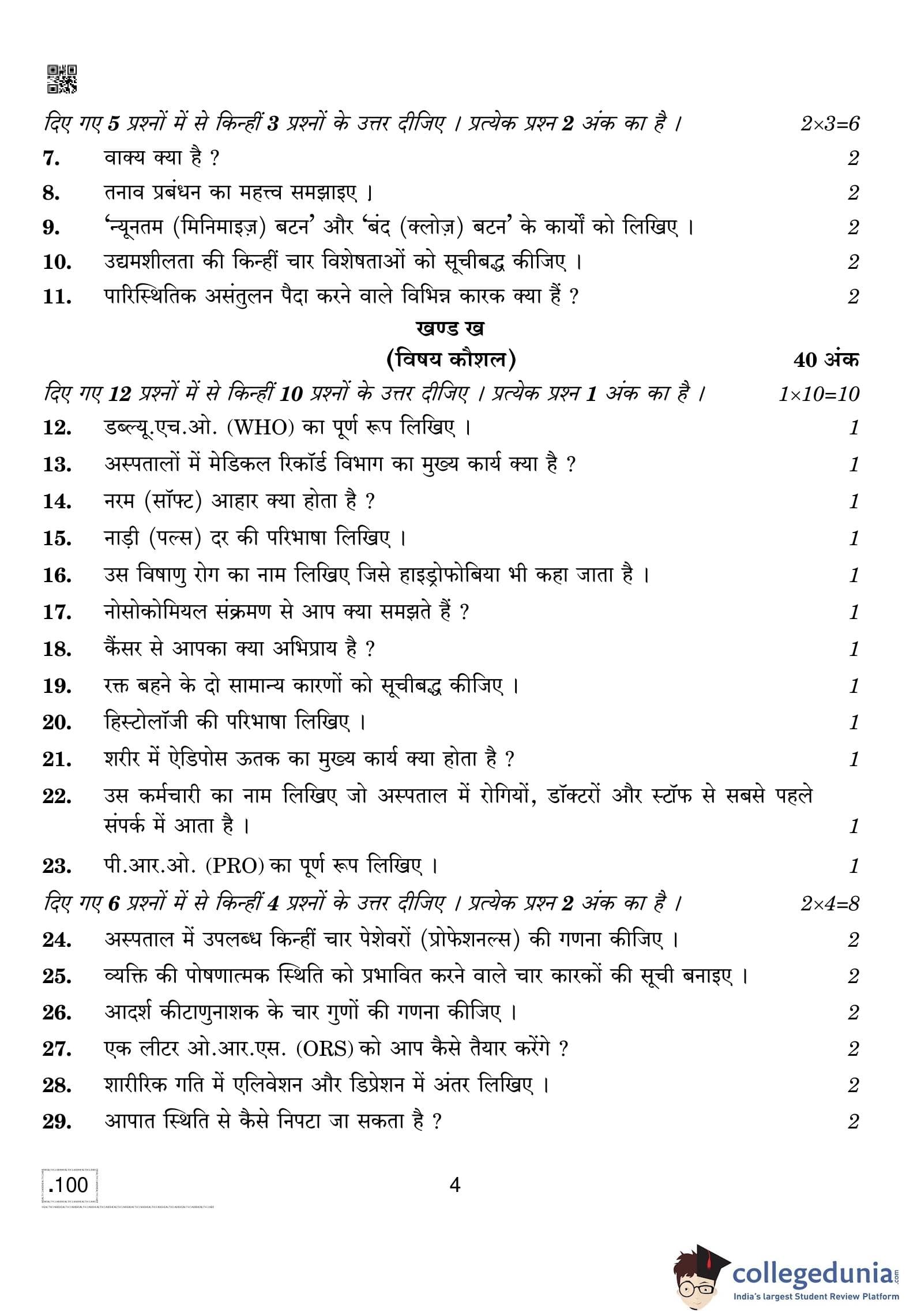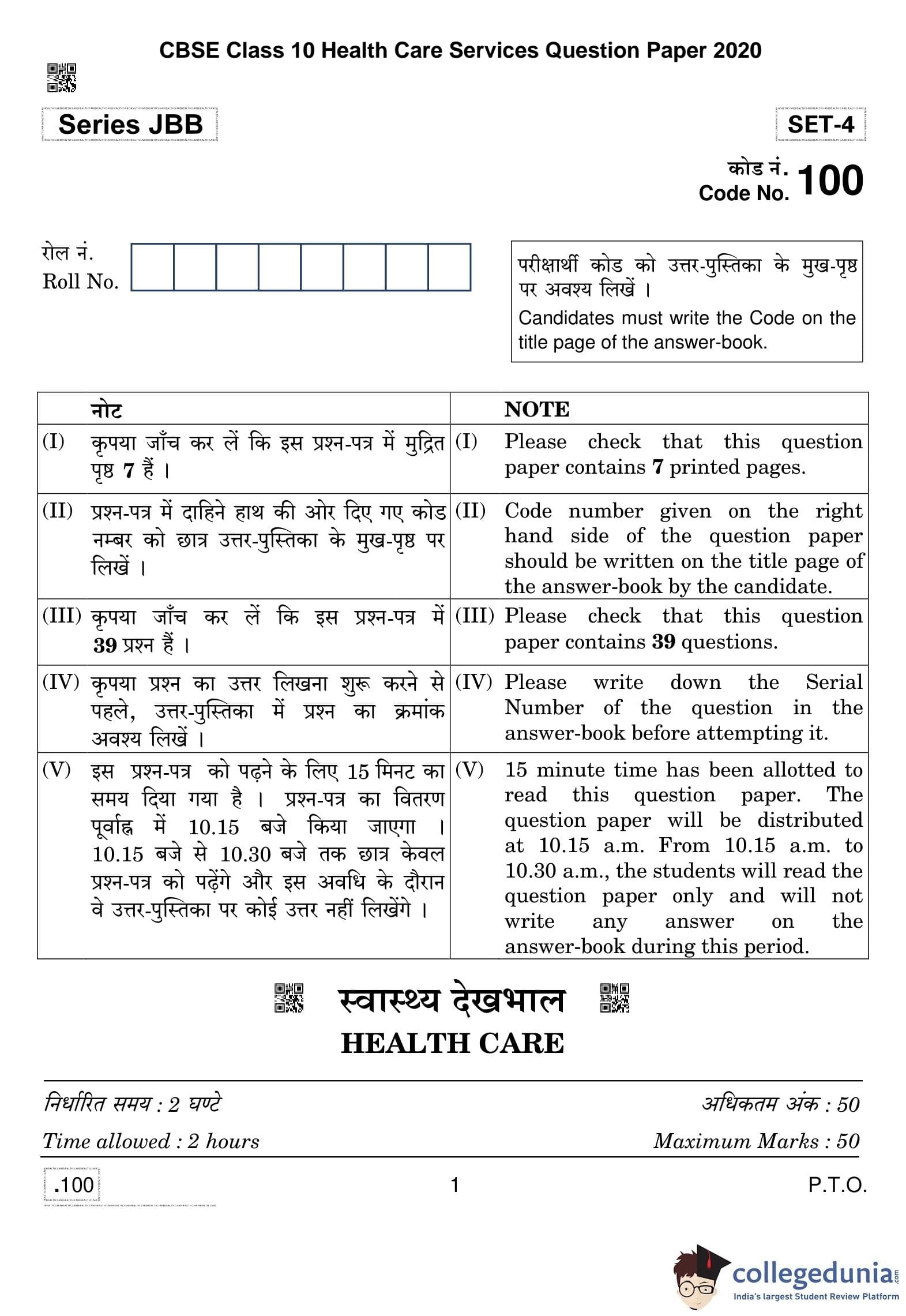 CBSE Class 10 Health Care Services Question Paper 2020 with Answer Key Set 4 is available for download. The exam was conducted by the Central Board of Secondary Education on February 15, 2020 in the Morning Session 10:30 AM to 12:30 PM. The medium of paper was English and Hindi. The question paper comprised a total of 39 questions divided among 2 sections.