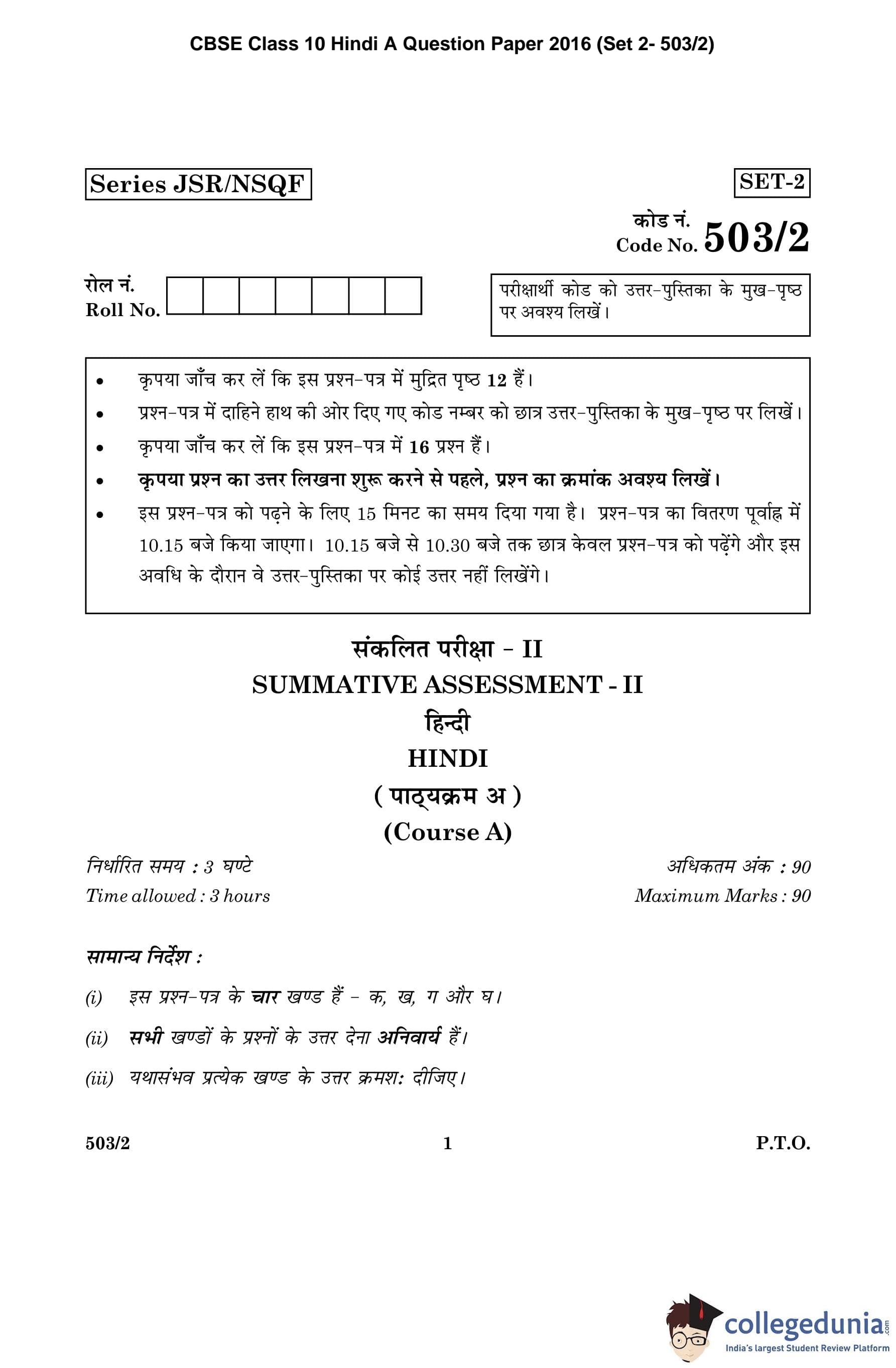 CBSE Class 10 Hindi A Question Paper 2016 with Answer Key Set 2- 503/2 is available for download. The exam was conducted by the Central Board of Secondary Education on March 8, 2016 in the Morning Session 10:30 AM to 1:30 PM. The medium of paper was Hindi. The question paper comprised a total of 16 questions divided among 4 sections.