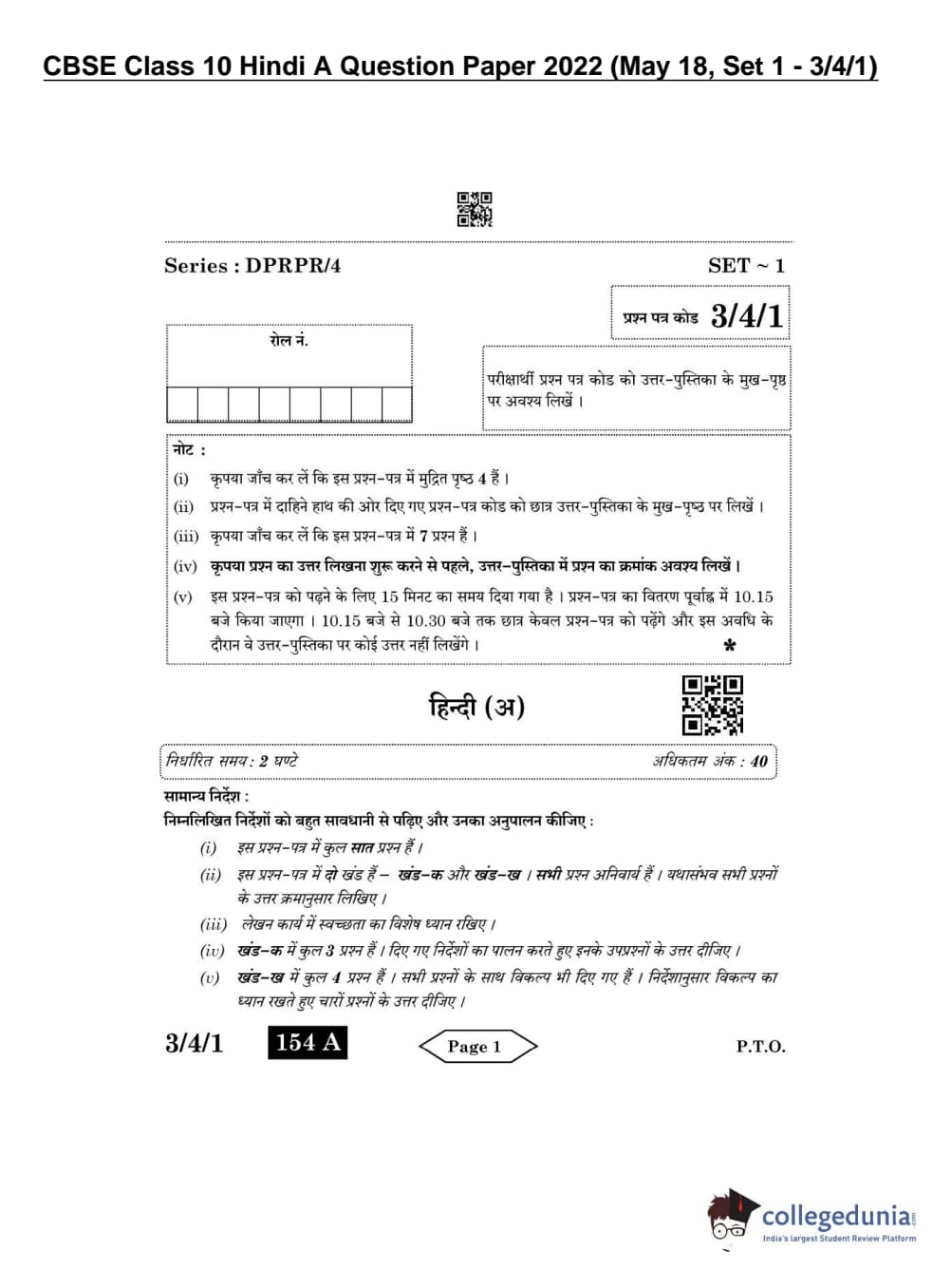 CBSE Class 10 Hindi A Question Paper 2022 with Answer Key Set 1 - 3/4/1 is available for download. The exam was conducted by the Central Board of Secondary Education on May 18, 2022 in the Morning Session 10:30 AM to 12:30 PM. The medium of paper was Hindi. The question paper comprised a total of 7 questions divided among 2 sections.