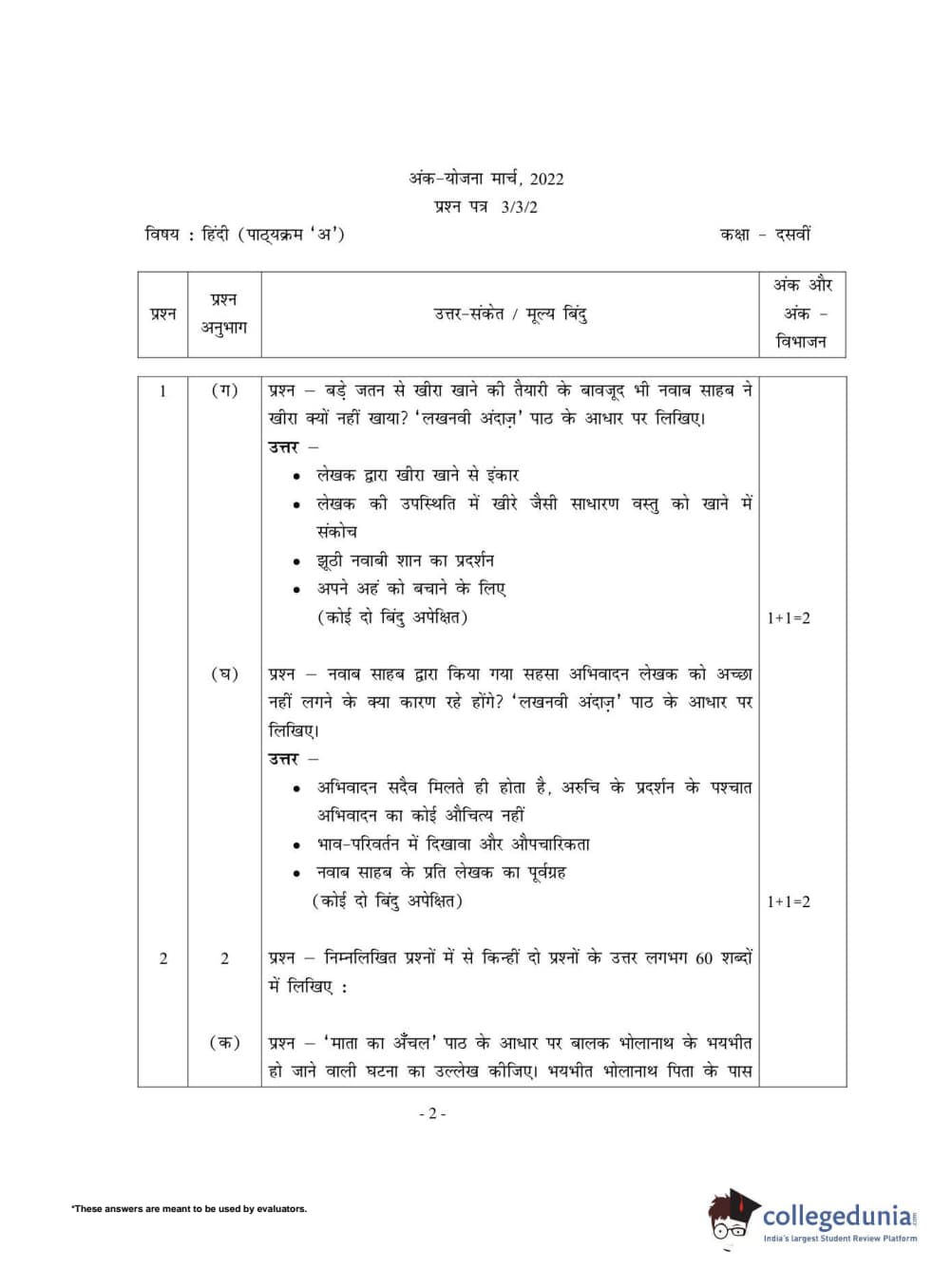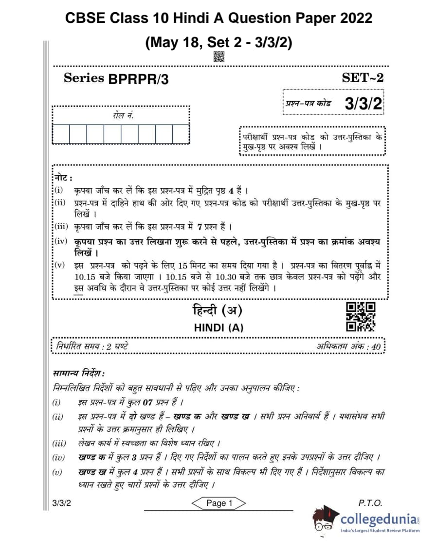 CBSE Class 10 Hindi A Set 2 - 3/3/2 Question Paper 2022 with Answer Key (May 18)