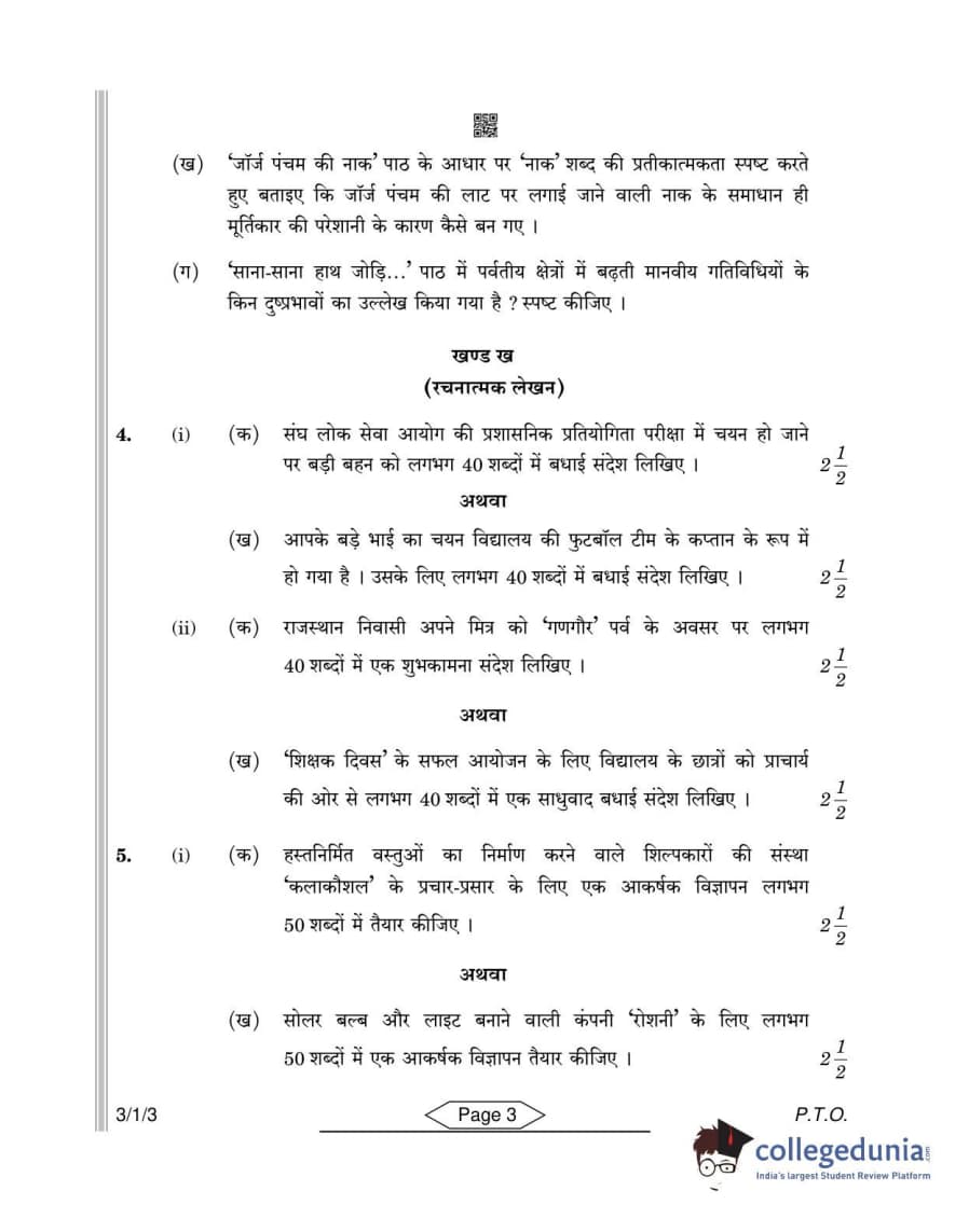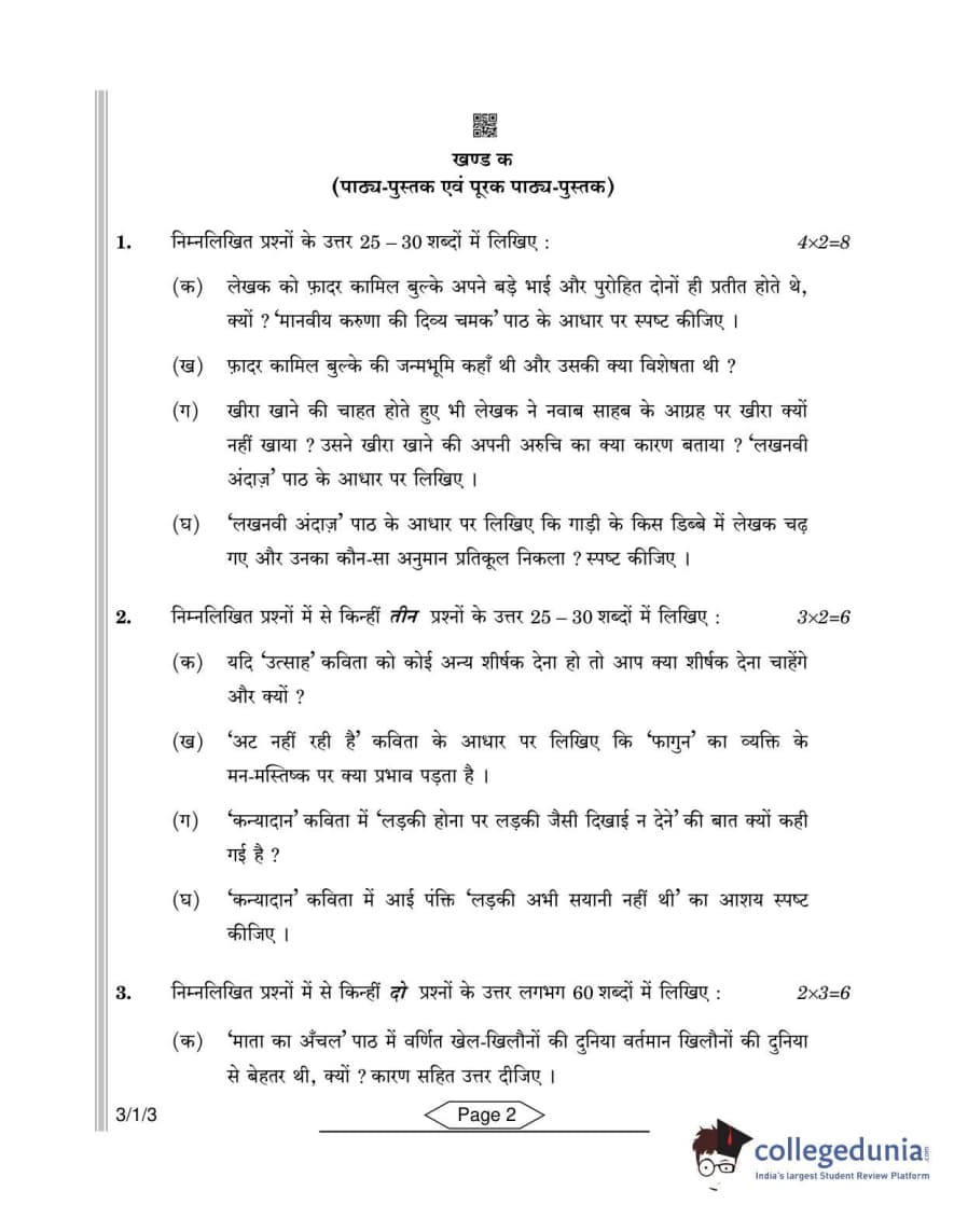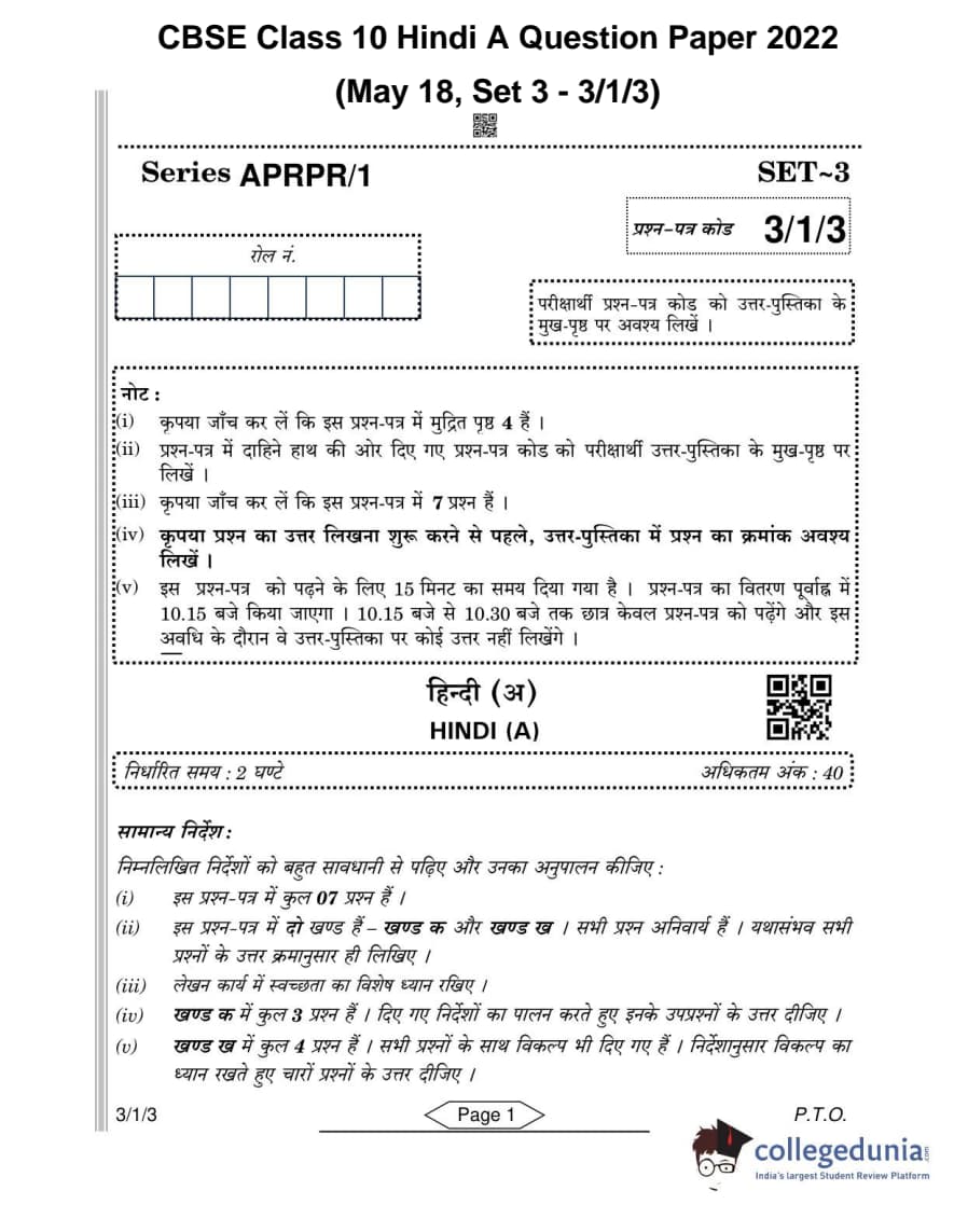 CBSE Class 10 Hindi A Question Paper 2022 with Answer Key Set 3 - 3/1/3 is available for download. The exam was conducted by the Central Board of Secondary Education on May 18, 2022 in the Morning Session 10:30 AM to 12:30 PM. The medium of paper was Hindi. The question paper comprised a total of 7 questions divided among 2 sections.