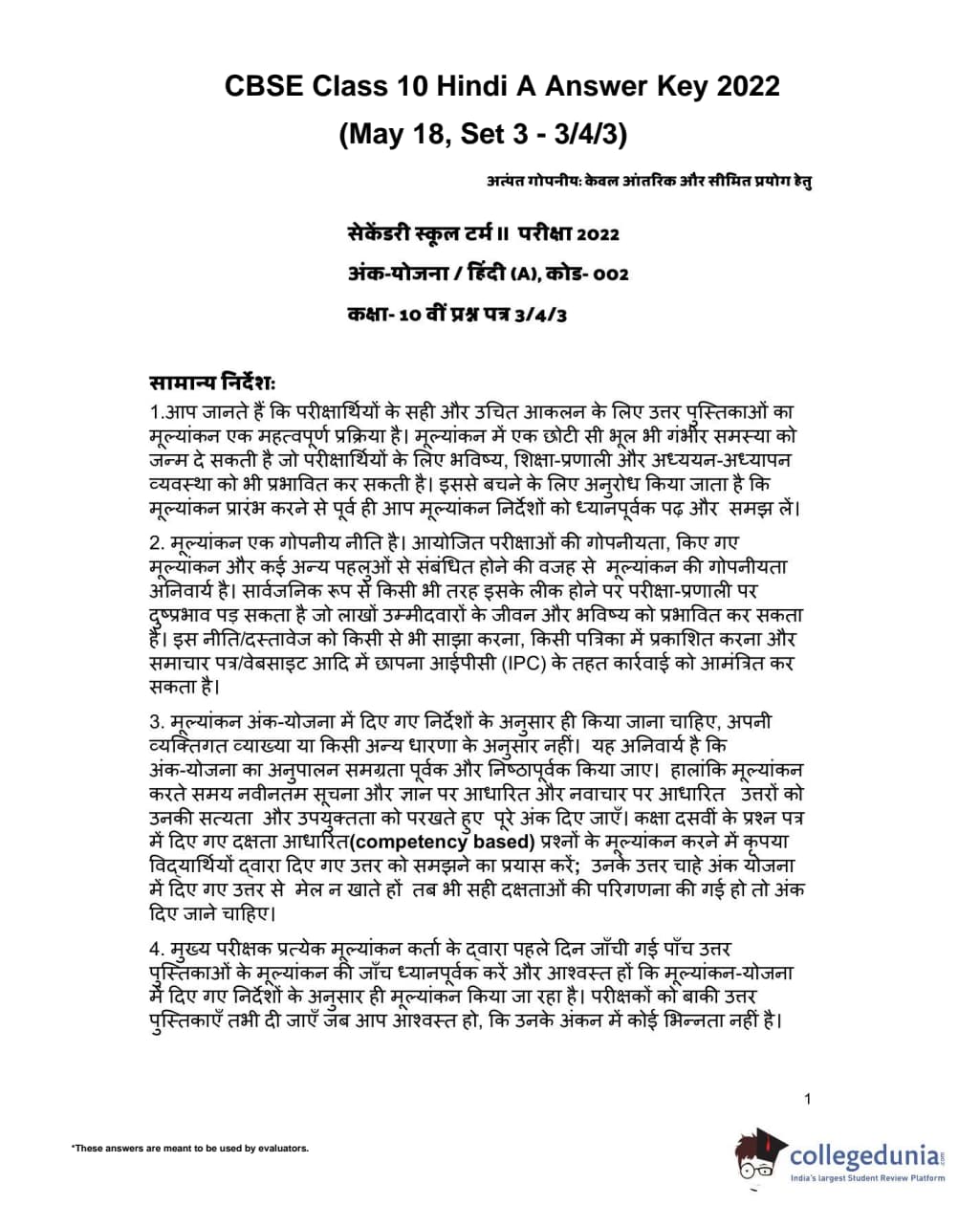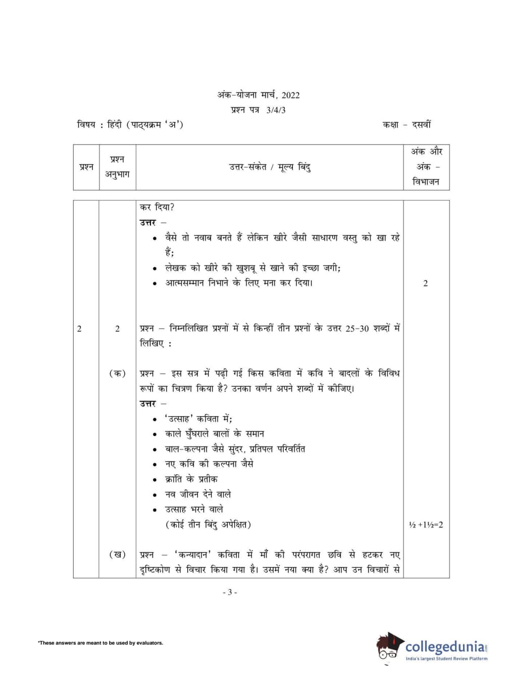 CBSE Class 10 Hindi A Set 3 - 3/4/3 Question Paper 2022 with Answer Key (May 18)
