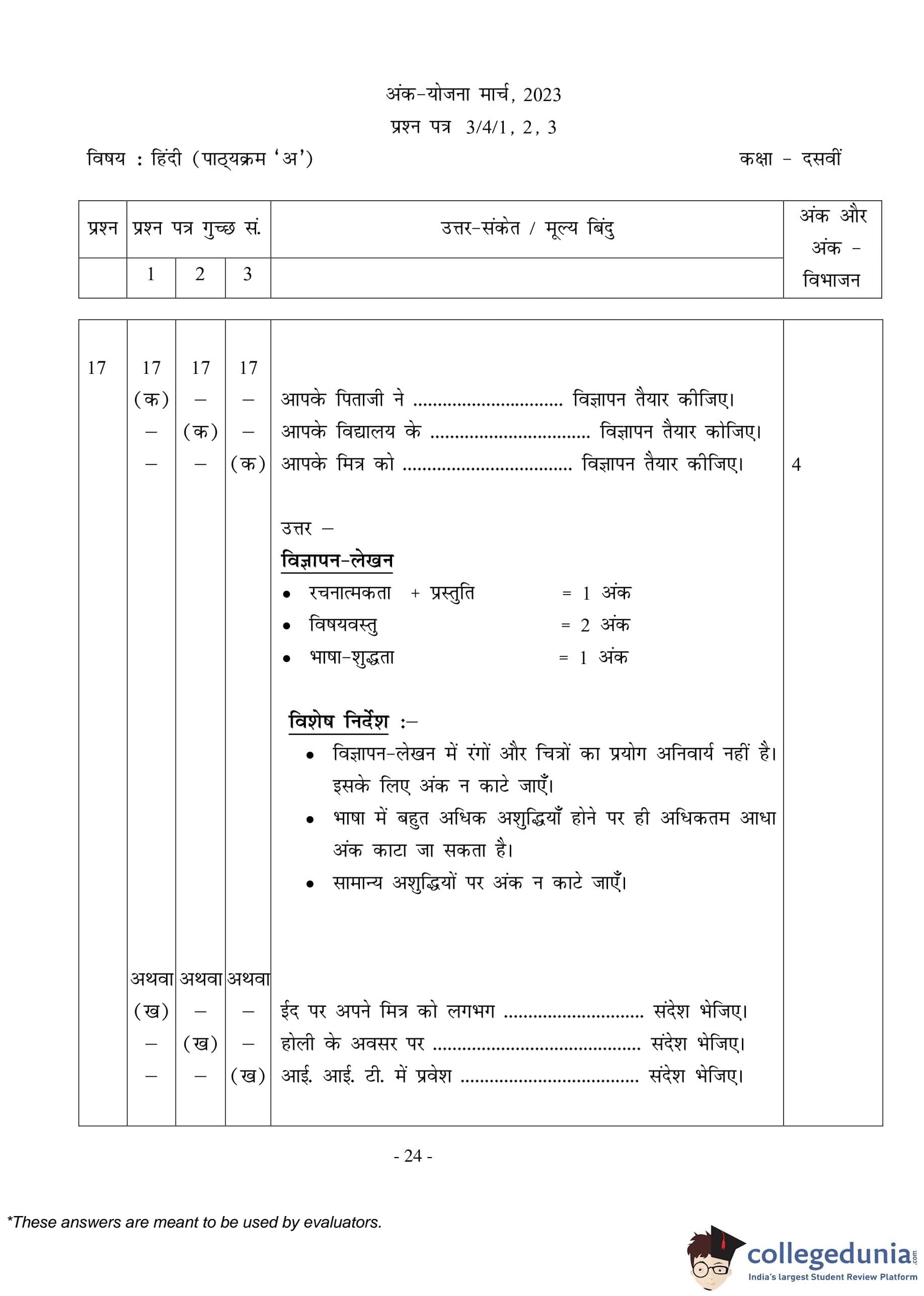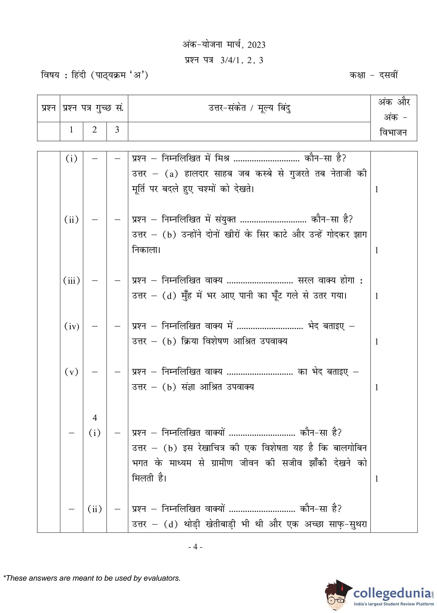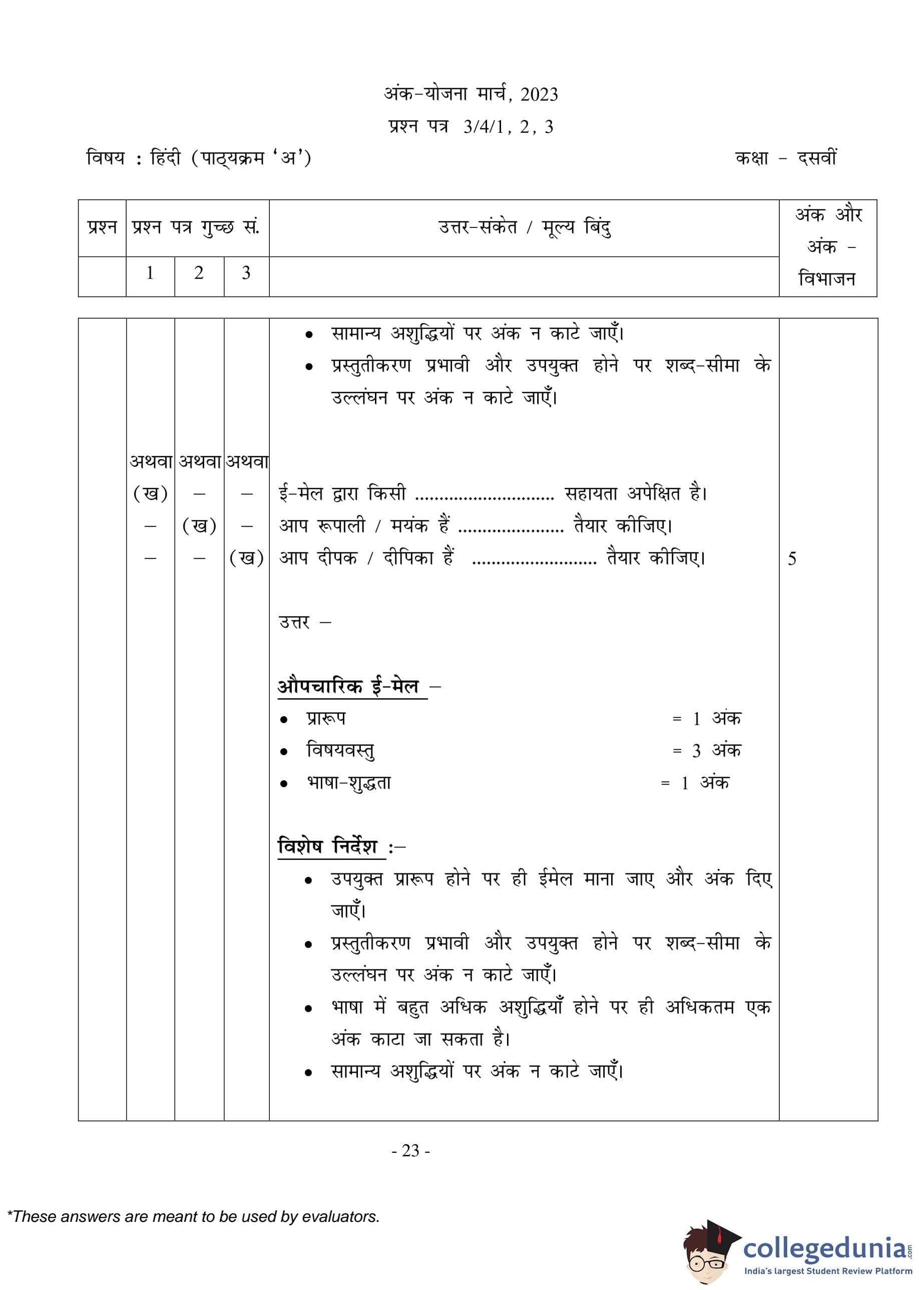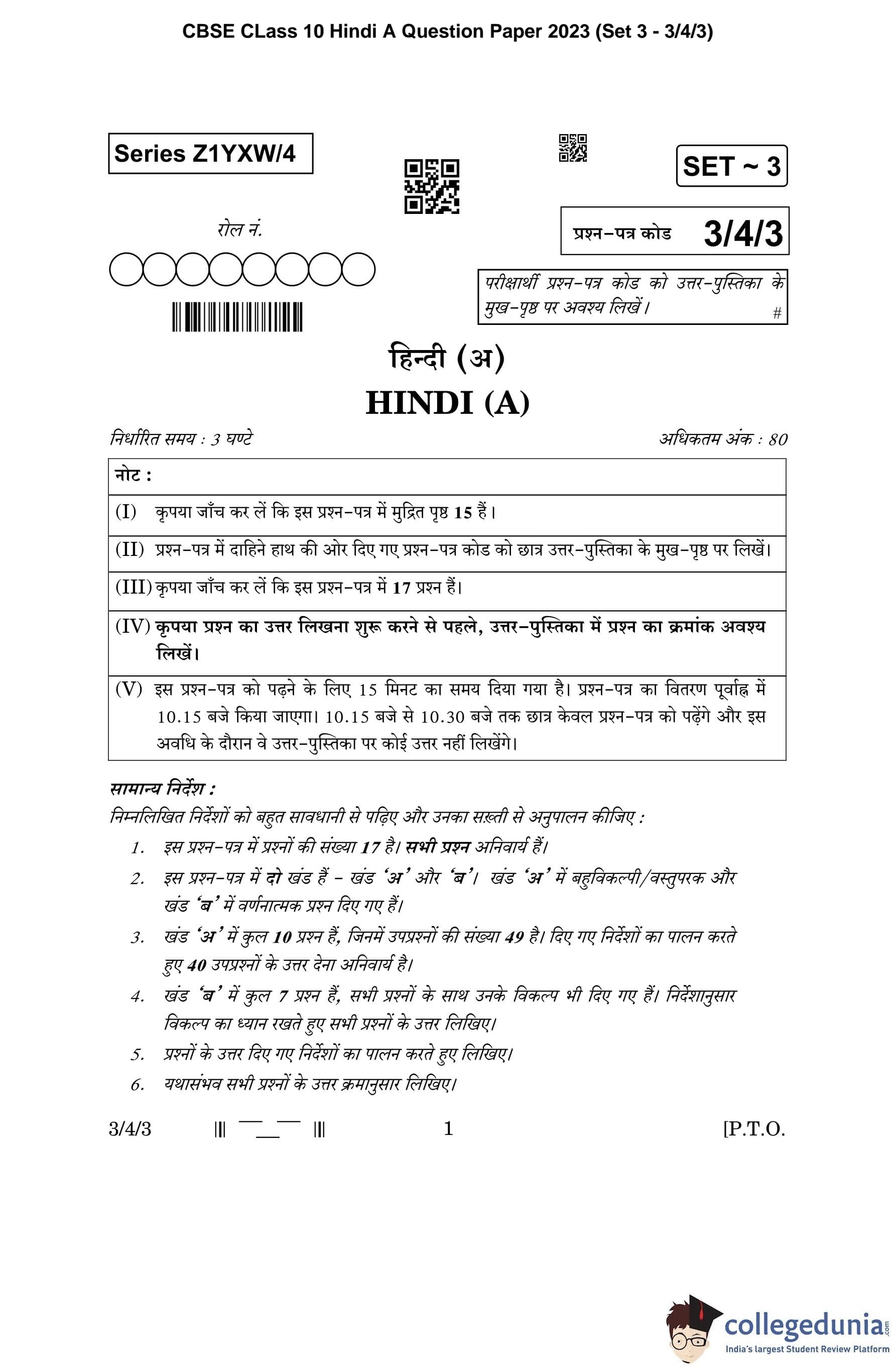 CBSE Class 10 Hindi A (Set 3- 3/4/3) Question Paper 2023 with Answer Key (March 17)