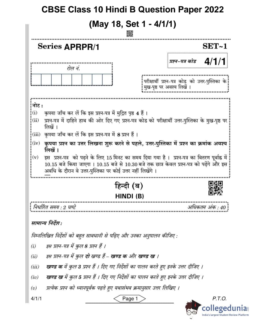 CBSE Class 10 Hindi B Question Paper 2022 with Answer Key Set 1 - 4/1/1 is available for download. The exam was conducted by the Central Board of Secondary Education on May 18, 2022 in the Morning Session 10:30 AM to 12:30 PM. The medium of paper was Hindi. The question paper comprised a total of 8 questions divided among 2 sections.