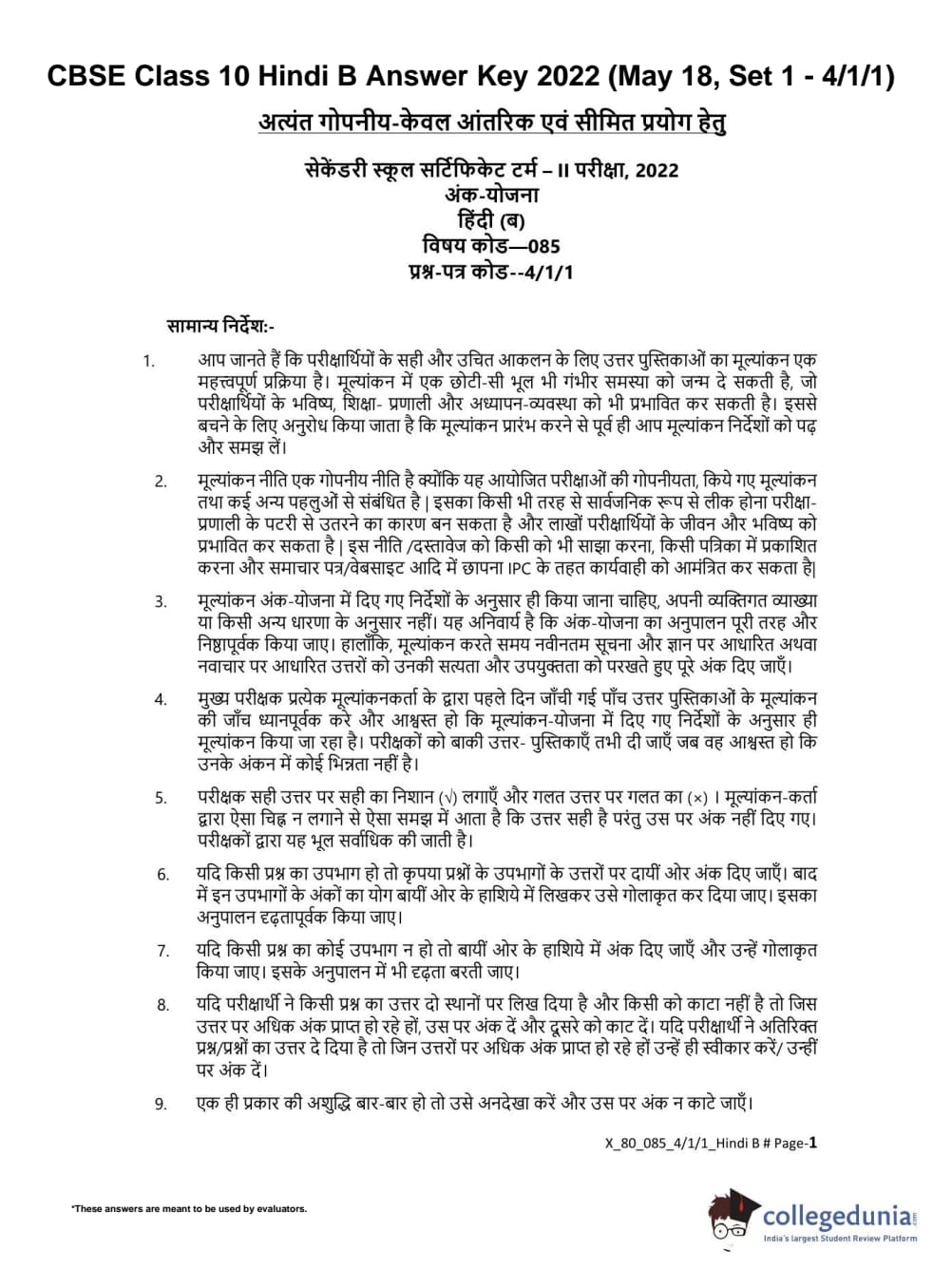 CBSE Class 10 Hindi B Set 1 - 4/1/1 Question Paper 2022 with Answer Key (May 18)