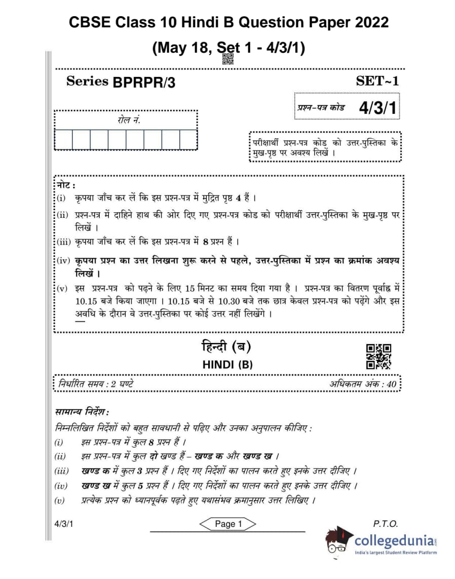 CBSE Class 10 Hindi B Set 1 - 4/3/1 Question Paper 2022 with Answer Key (May 18)