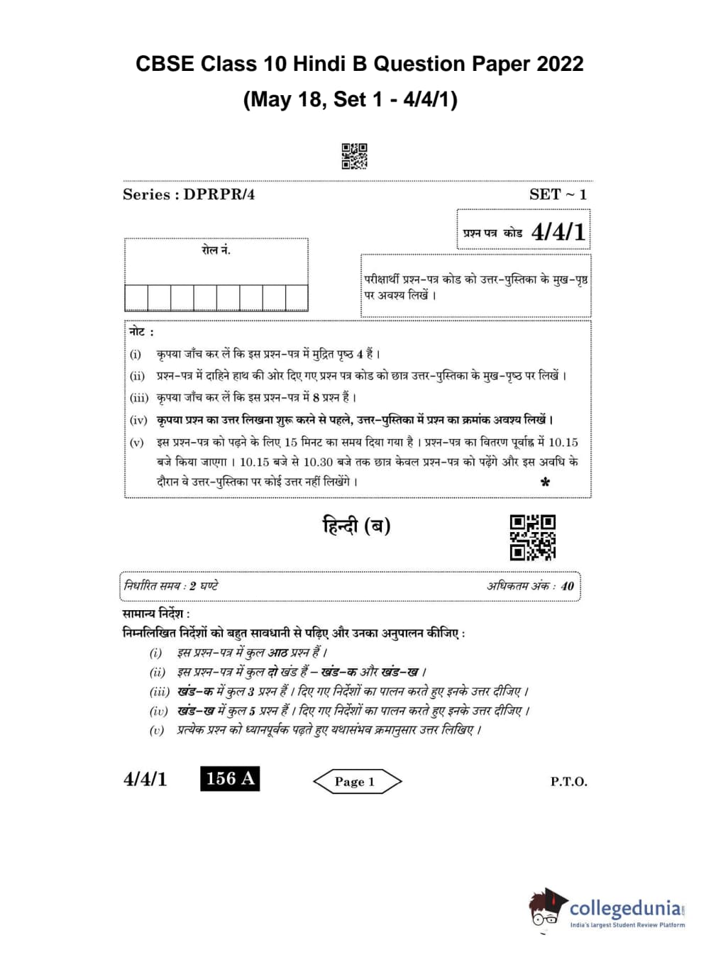 CBSE Class 10 Hindi B Set 1 - 4/4/1 Question Paper 2022 with Answer Key (May 18)