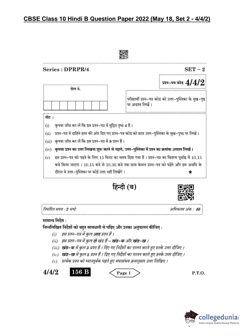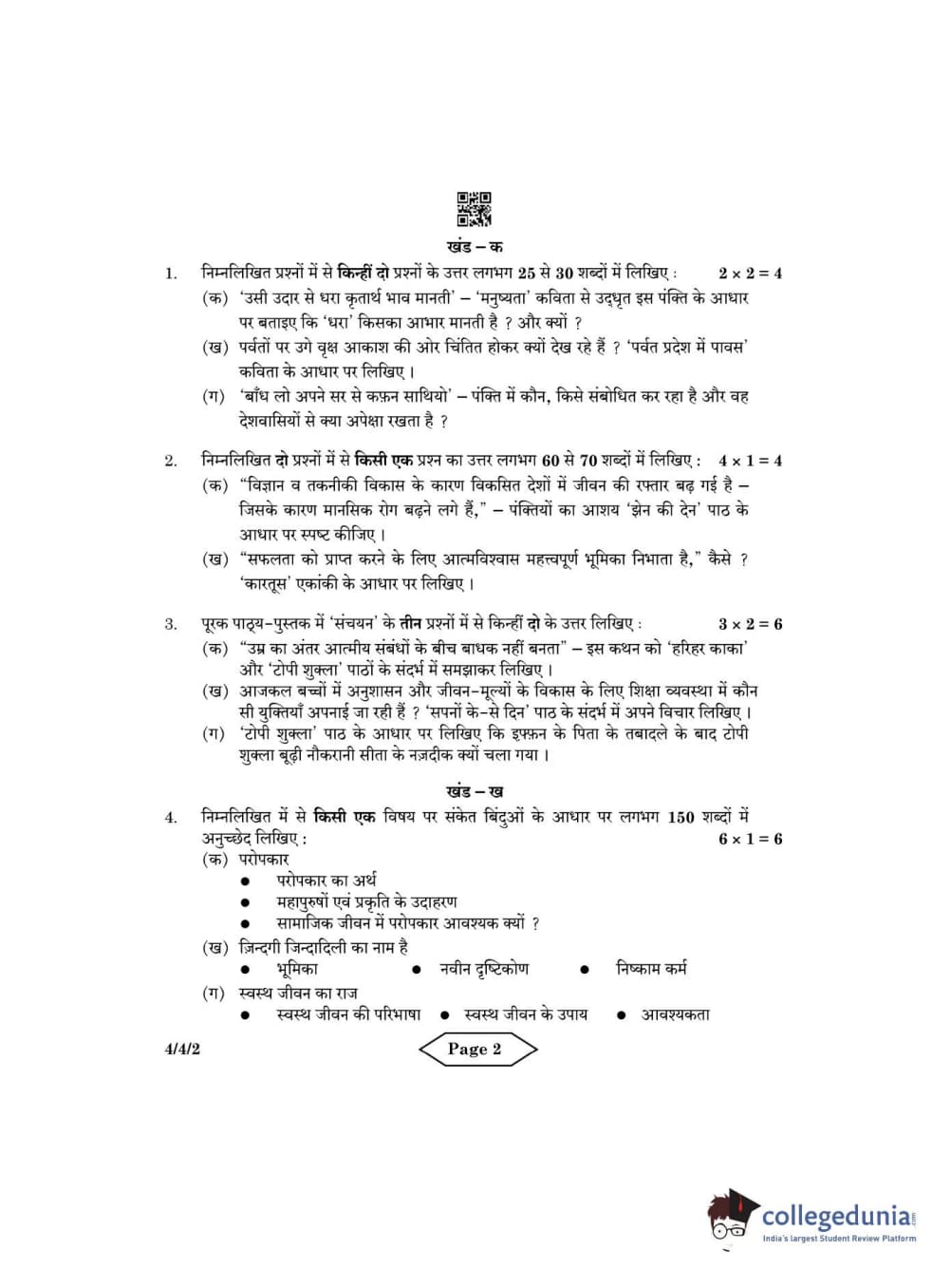 CBSE Class 10 Hindi B Question Paper 2022 with Answer Key Set 2 - 4/4/2 is available for download. The exam was conducted by the Central Board of Secondary Education on May 18, 2022 in the Morning Session 10:30 AM to 12:30 PM. The medium of paper was Hindi. The question paper comprised a total of 8 questions divided among 2 sections.