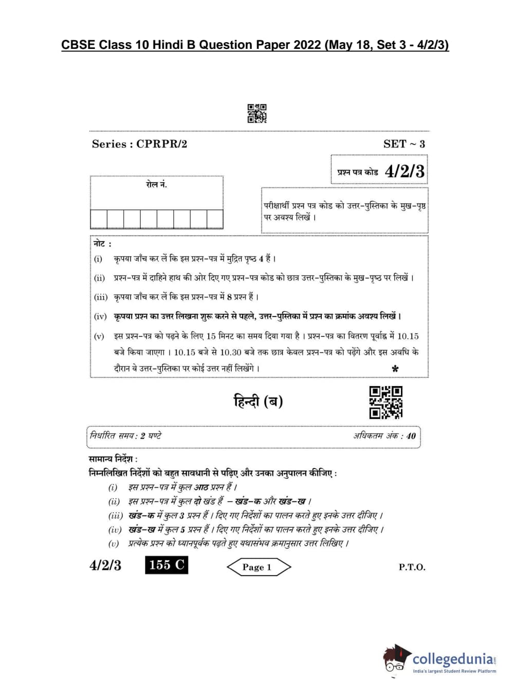 CBSE Class 10 Hindi B Set 3 - 4/2/3 Question Paper 2022 with Answer Key (May 18)
