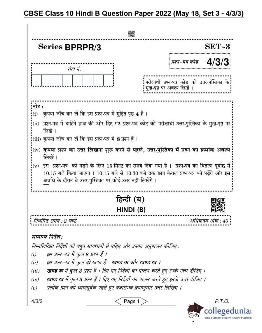 CBSE Class 10 Hindi B Question Paper 2022 with Answer Key Set 3 - 4/3/3 is available for download. The exam was conducted by the Central Board of Secondary Education on May 18, 2022 in the Morning Session 10:30 AM to 12:30 PM. The medium of paper was Hindi. The question paper comprised a total of 8 questions divided among 2 sections.