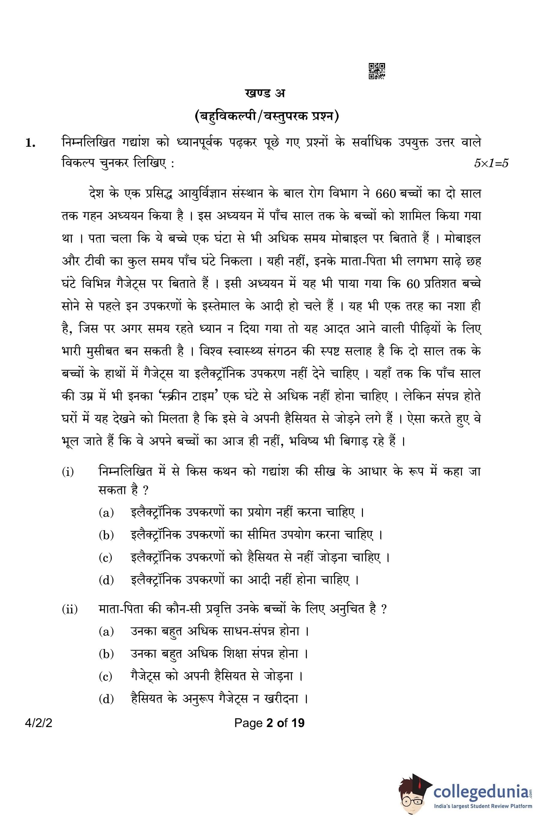 CBSE Class 10 Hindi B Question Paper 2023 with Answer Key (Set 2- 4/2/2) is available for download here. The exam was conducted by the Central Board of Secondary Education on March 17, 2023 in the Morning Session 10:30 AM to 1:30 PM. According to initial student reaction, the CBSE Class 10 Hindi B Paper was rated as Easy in difficulty level. The question paper comprised a total of 17 questions divided among 2 sections.