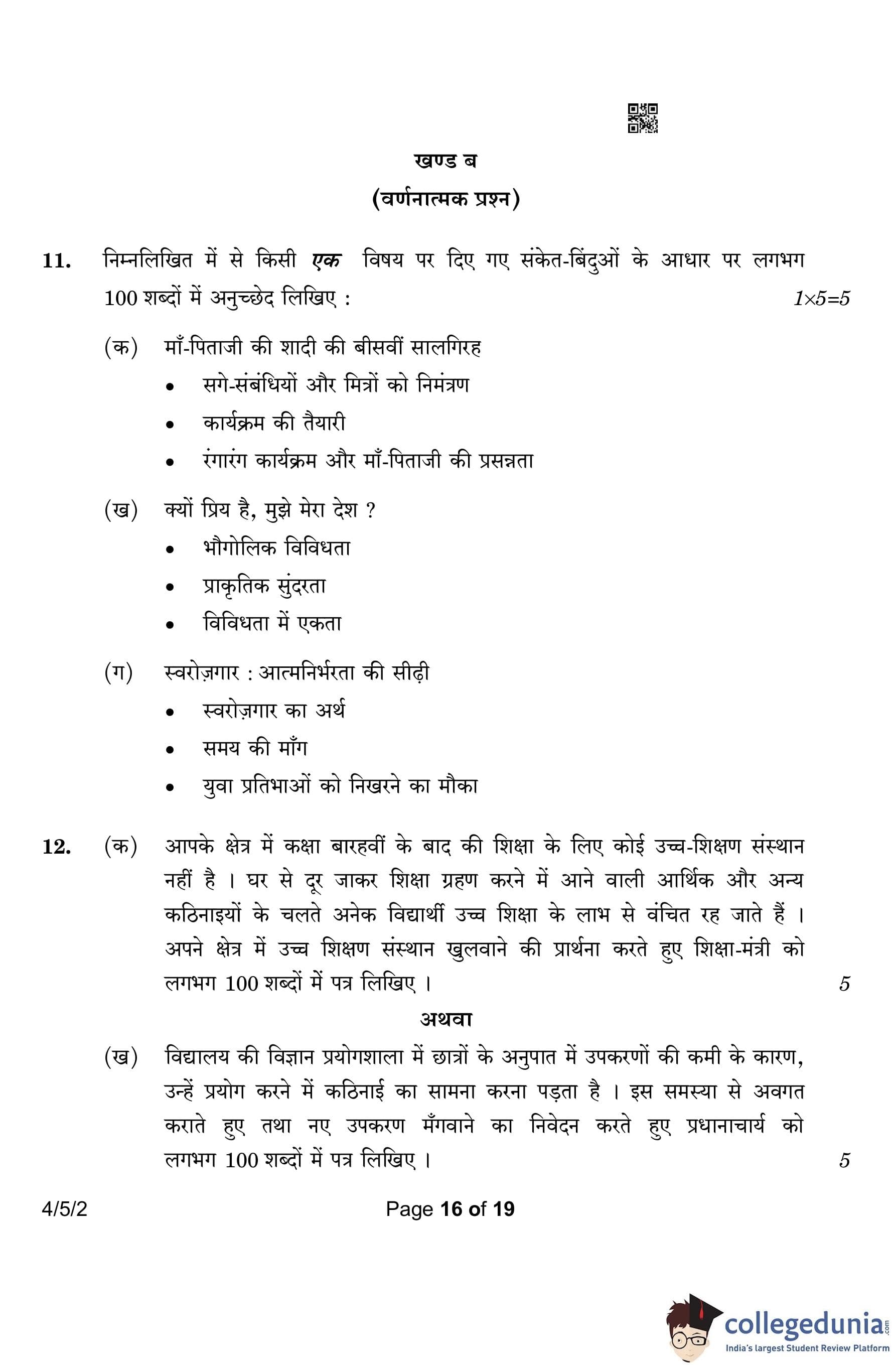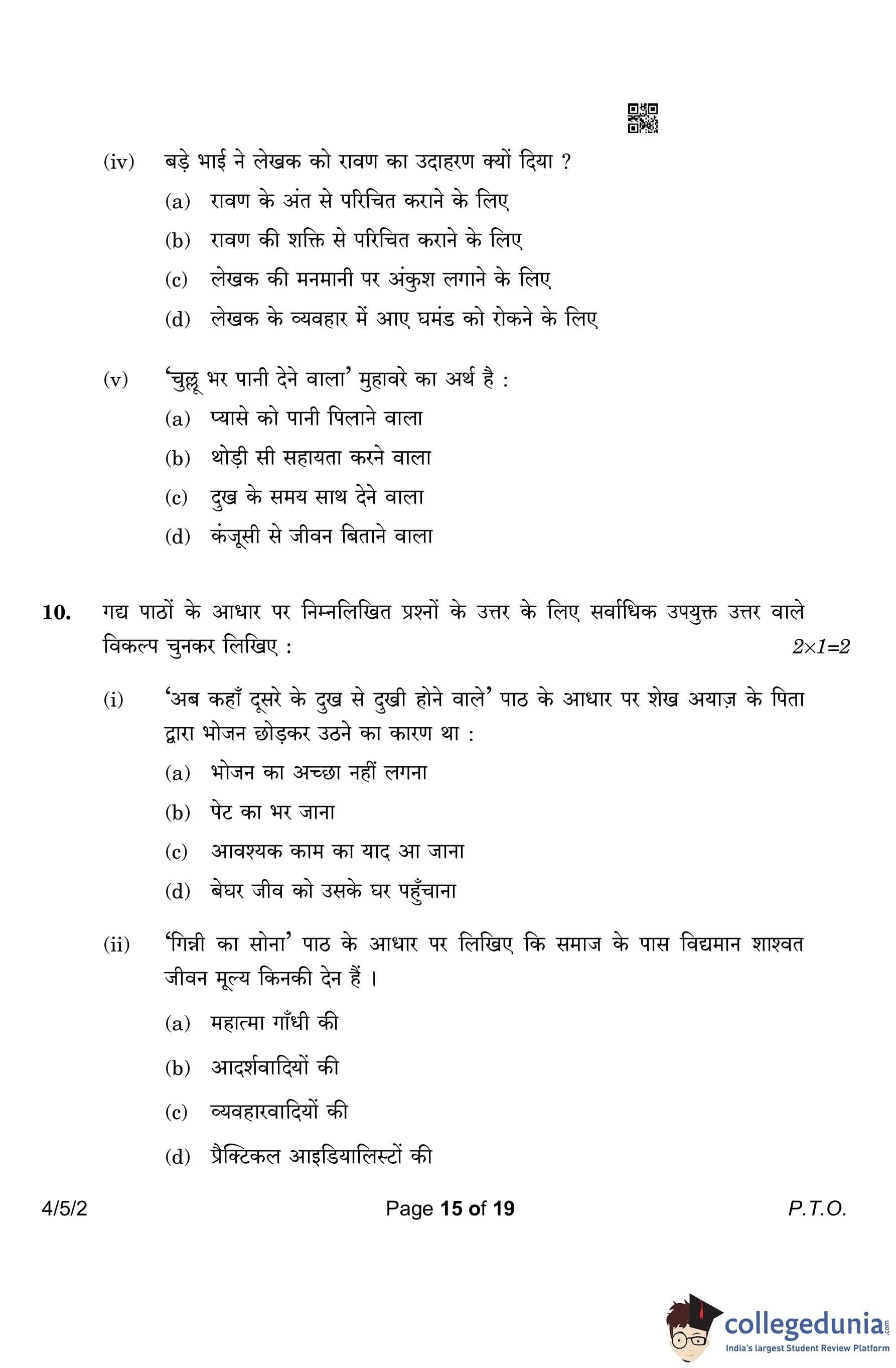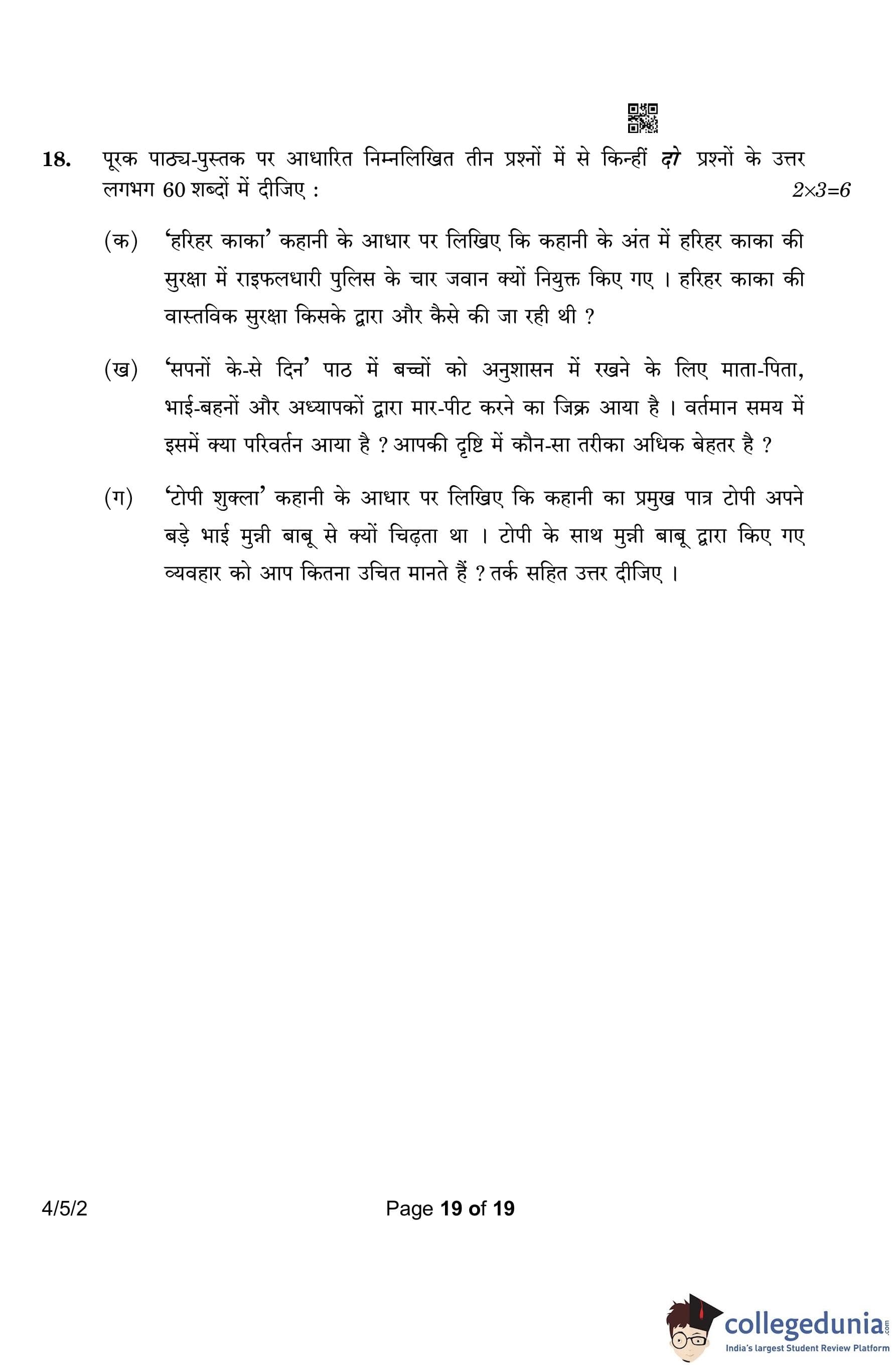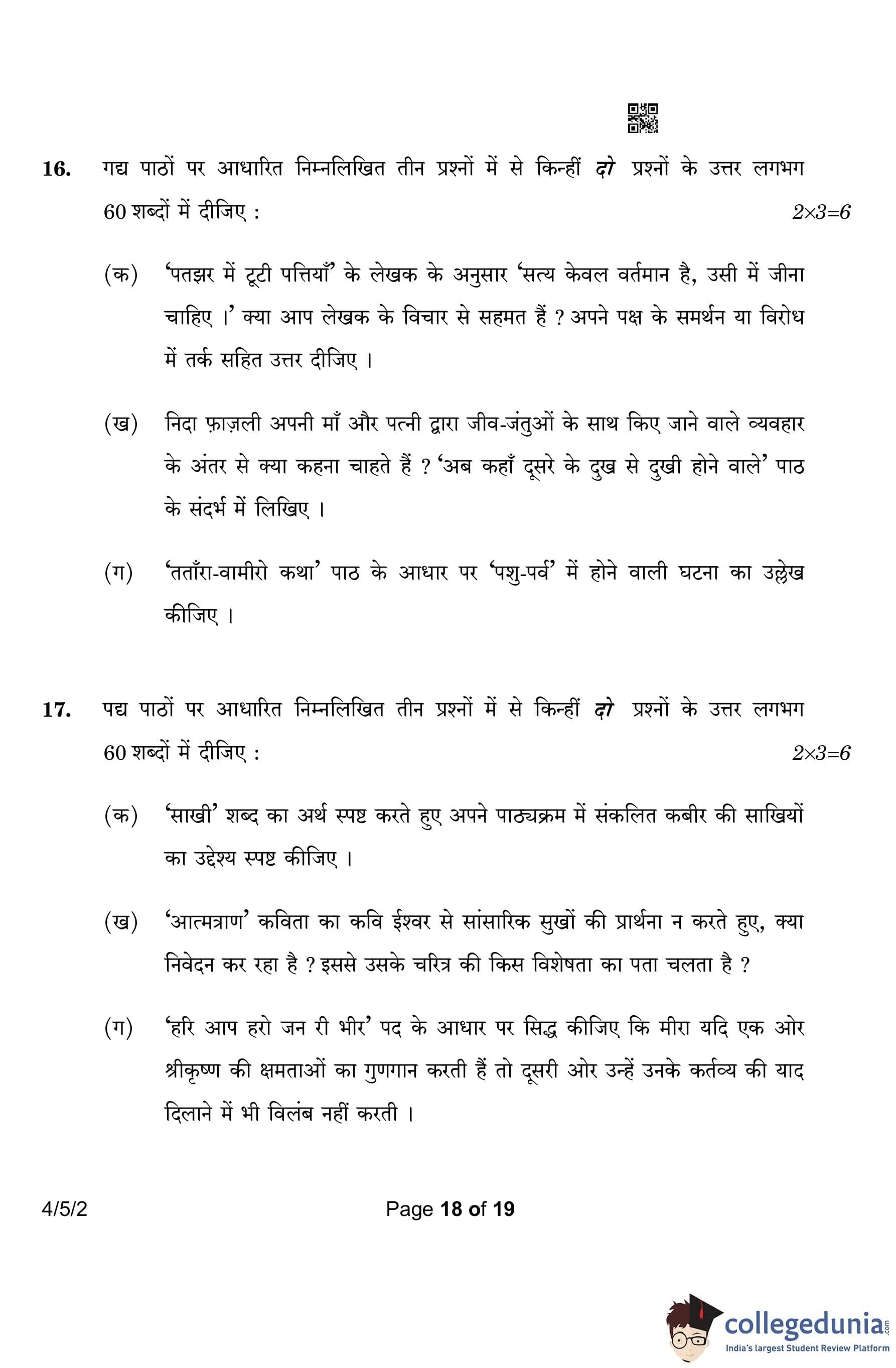 CBSE Class 10 Hindi B Question Paper 2023 with Answer Key (Set 2- 4/5/2) is available for download here. The exam was conducted by the Central Board of Secondary Education on March 17, 2023 in the Morning Session 10:30 AM to 1:30 PM. According to initial student reaction, the CBSE Class 10 Hindi B Paper was rated as Easy in difficulty level. The question paper comprised a total of 17 questions divided among 2 sections.