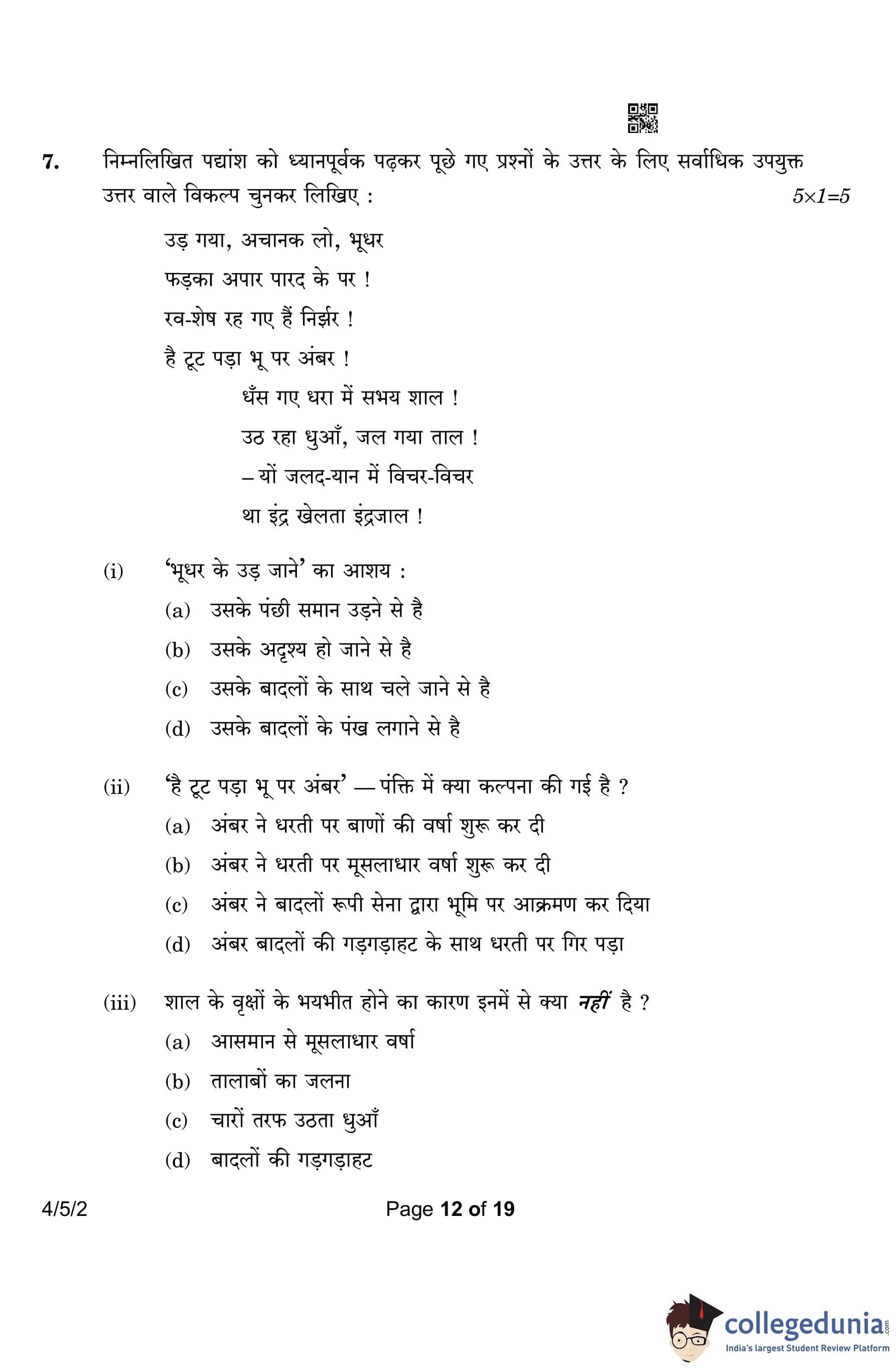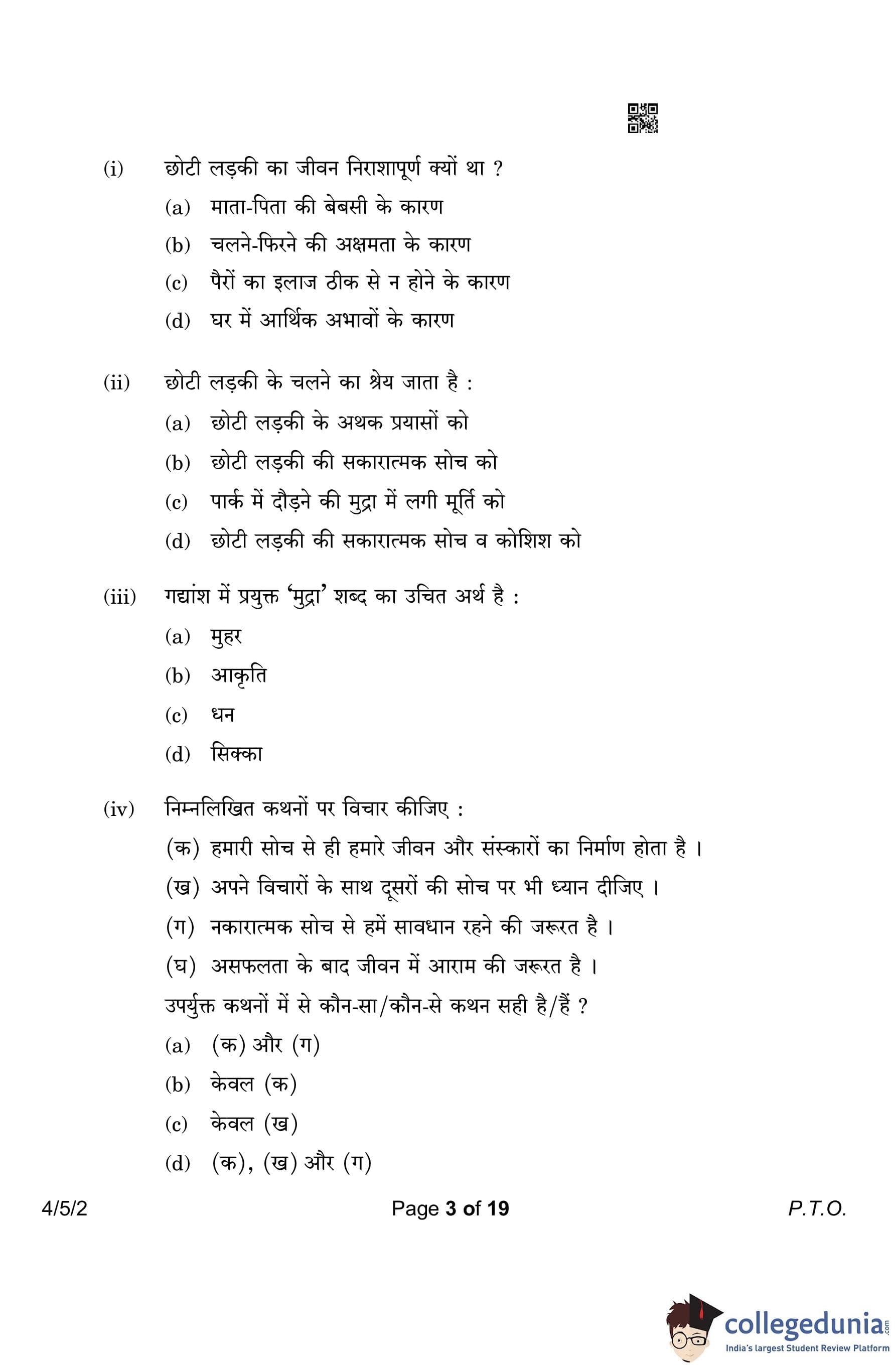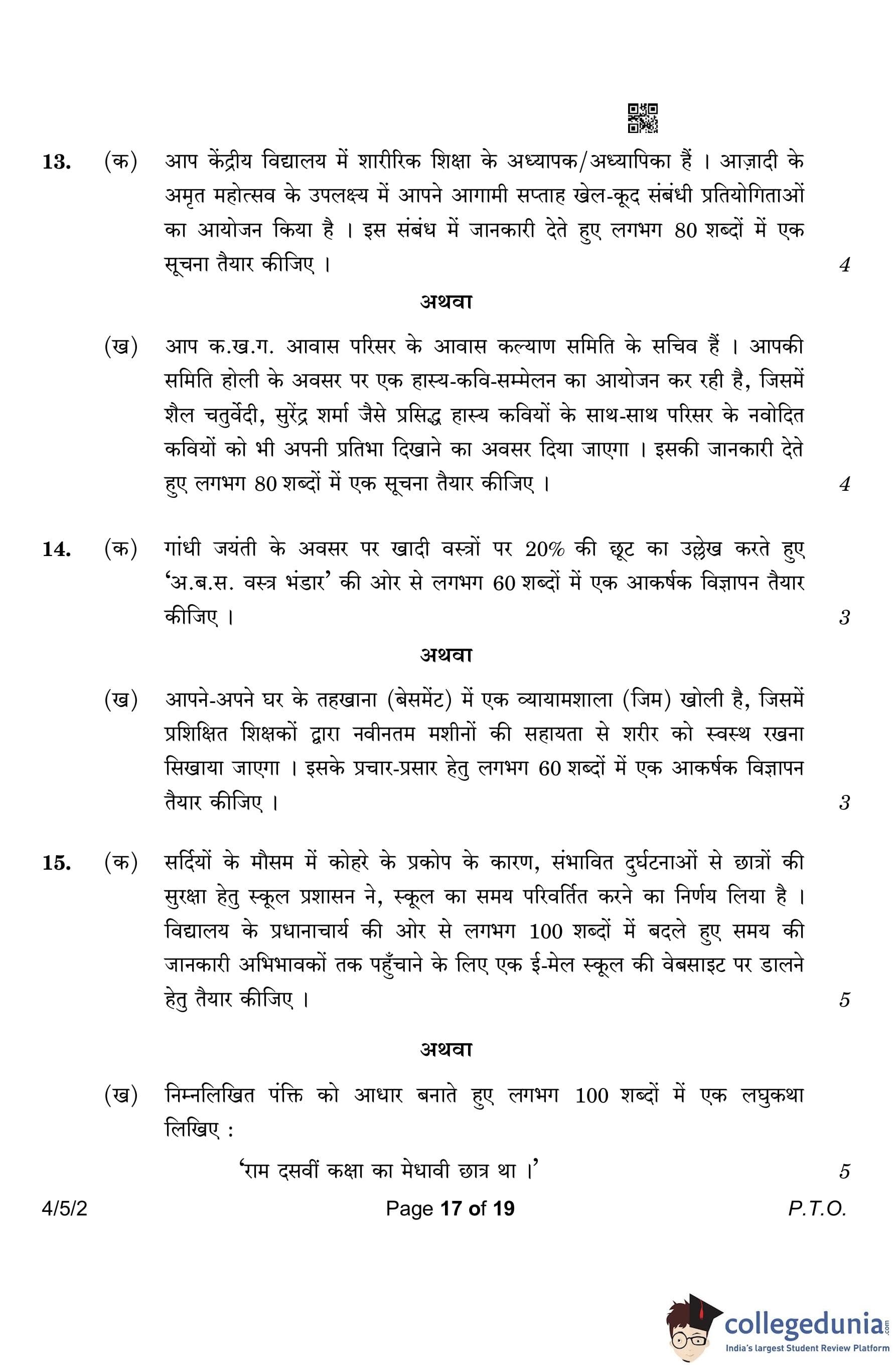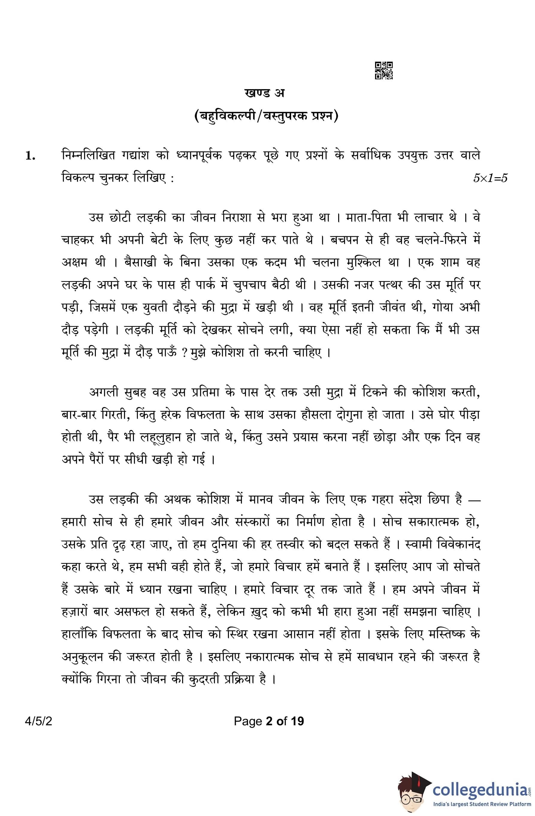 CBSE Class 10 Hindi B Question Paper 2023 with Answer Key (Set 2- 4/5/2) is available for download here. The exam was conducted by the Central Board of Secondary Education on March 17, 2023 in the Morning Session 10:30 AM to 1:30 PM. According to initial student reaction, the CBSE Class 10 Hindi B Paper was rated as Easy in difficulty level. The question paper comprised a total of 17 questions divided among 2 sections.
