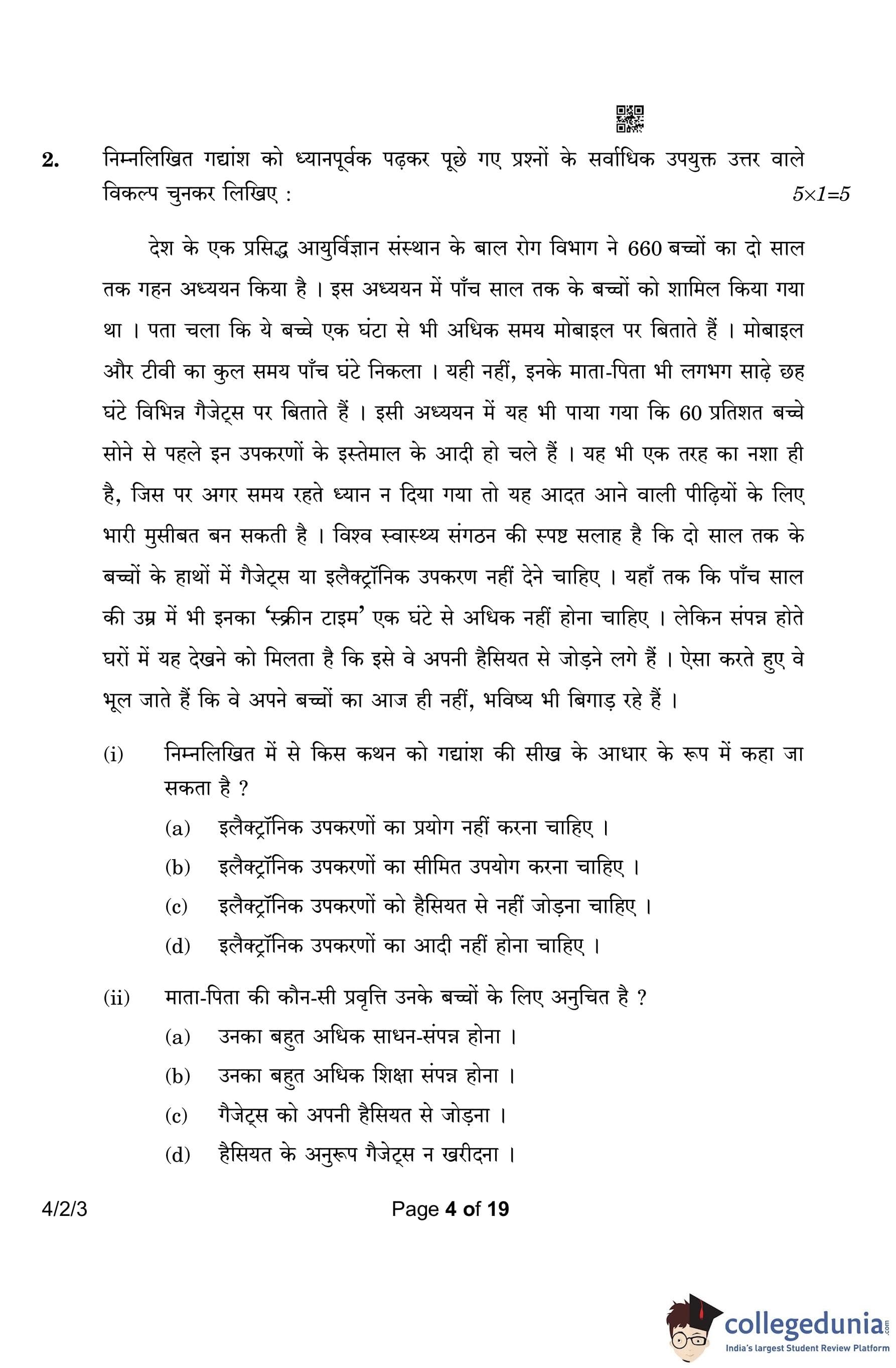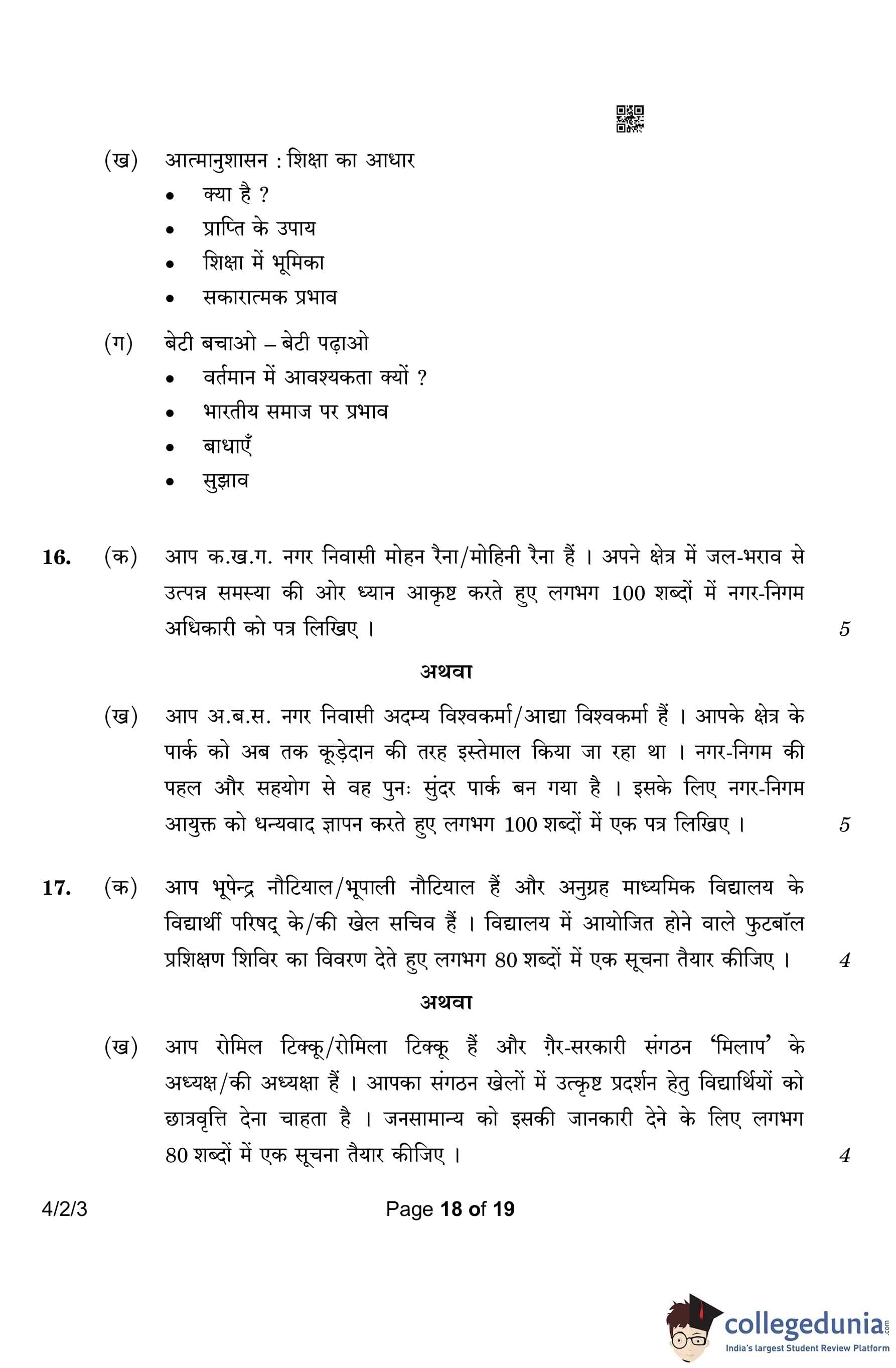 CBSE Class 10 Hindi B Question Paper 2023 with Answer Key (Set 3- 4/2/3) is available for download here. The exam was conducted by the Central Board of Secondary Education on March 17, 2023 in the Morning Session 10:30 AM to 1:30 PM. According to initial student reaction, the CBSE Class 10 Hindi B Paper was rated as Easy in difficulty level. The question paper comprised a total of 17 questions divided among 2 sections.