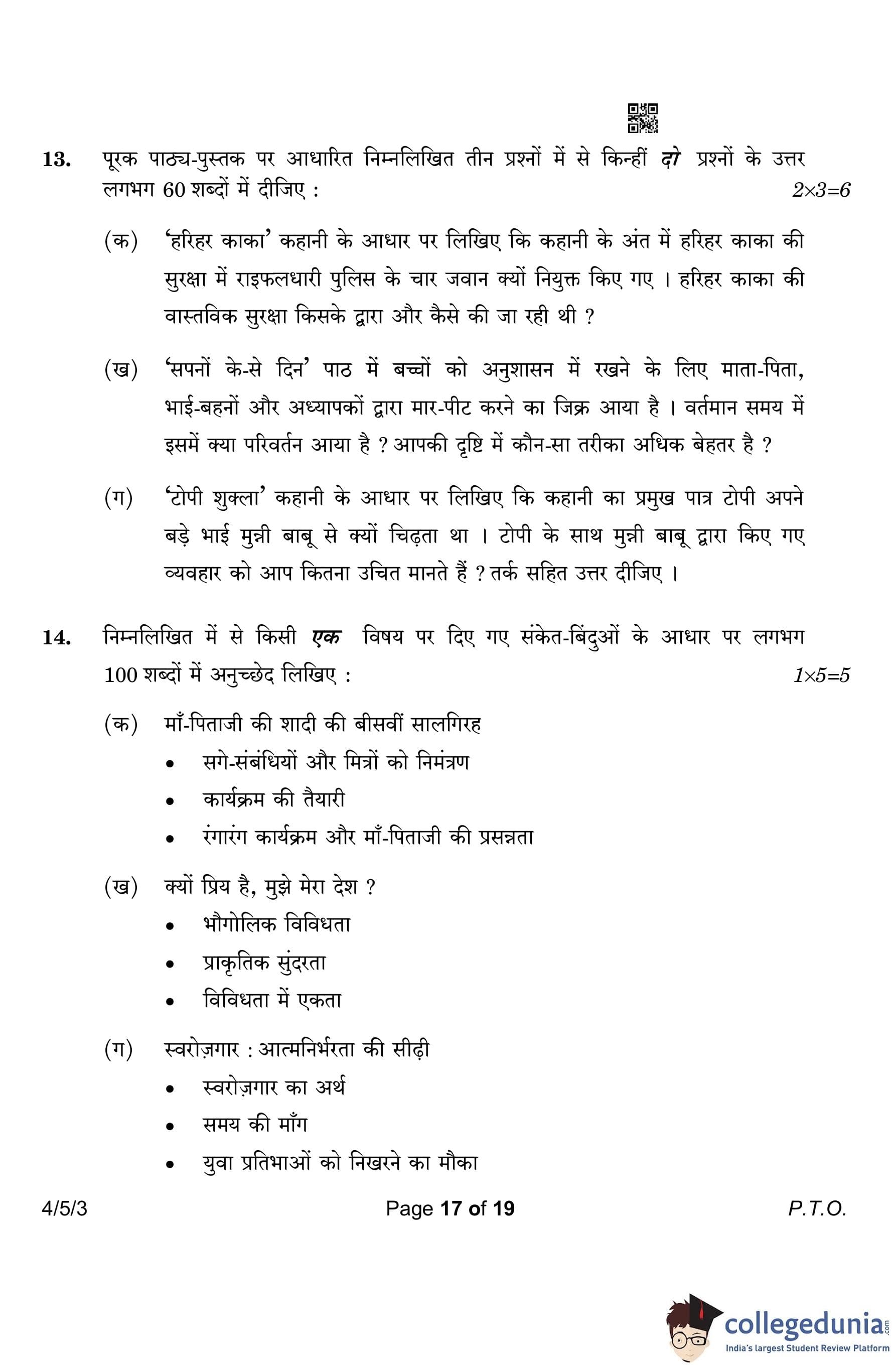 CBSE Class 10 Hindi B Question Paper 2023 with Answer Key (Set 3- 4/5/3) is available for download here. The exam was conducted by the Central Board of Secondary Education on March 17, 2023 in the Morning Session 10:30 AM to 1:30 PM. According to initial student reaction, the CBSE Class 10 Hindi B Paper was rated as Easy in difficulty level. The question paper comprised a total of 17 questions divided among 2 sections.