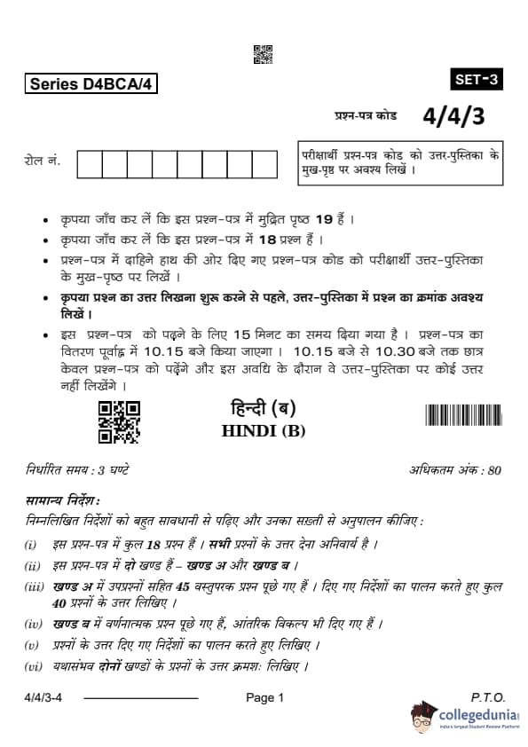 CBSE Class 10 Hindi B Question Paper 2024 PDF (Set 3- 4/4/3) is available for download here. CBSE conducted the Hindi B exam on February 21, 2024 from 10:30 AM to 1:30 PM. The total marks for the theory paper are 80. The question paper contains 20% MCQ-based questions, 40% competency-based questions, and 40% short and long answer type questions.