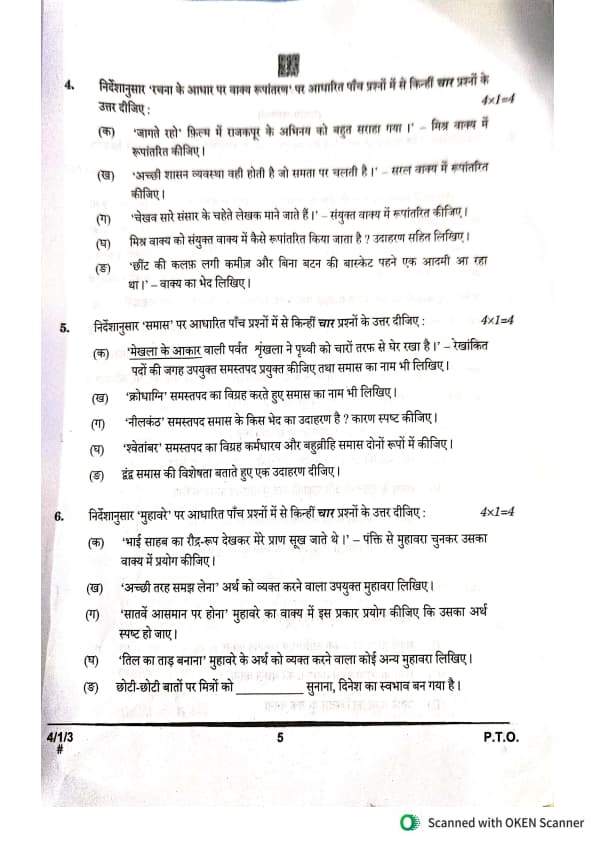 निर्देशानुसार 'रचना के आधार परवाक्य रूपांतरण' पर आधारित पाँच प्रश्नों में से किन्हीं चार प्रश्नों के उत्तर दीजिए: