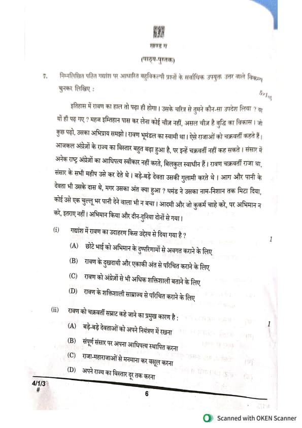 निम्नलिखित पठित गद्यांश पर आधारित बहुविकल्पी प्रश्नों के सर्वाधिक उपयुक्त उत्तर वाले विकल्प चुनकर लिखिए : 5x15 इतिहास में रावण का हाल तो पढ़ा हीहोगा। उसके चरित्र से तुमने कौन-सा उपदेश लिया ? या यों ही पढ़ गए ? महज इम्तिहान पास कर लेना कोई चीज़ नहीं, असल चीज़ है बुद्धि का विकास । जो कुछ पढ़ो, उसका अभिप्राय समझो ।रावण भूमंडल का स्वामी था।ऐसे राजाओं को चक्रवर्ती कहते हैं। आजकल अंग्रेज़ों के राज्य का विस्तार बहुत बढ़ा हुआ है,पर इन्हें चक्रवर्ती नहीं कह सकते । संसार में अनेक राष्ट्र अंग्रेज़ों का आधिपत्य स्वीकार नहीं करते, बिलकुल स्वाधीन हैं ।रावण चक्रवर्ती राजाथा, संसार के सभी महीप उसे कर देते थे। बड़े-बड़े देवता उसकी गुलामी करते थे। आग और पानी के देवता भी उसके दास थे, मगर उसका अंत क्या हुआ ? घमंड ने उसका नाम-निशान तक मिटा दिया, कोई उसे एक चुल्लू भर पानी देने वाला भी न बचा। आदमी और जो कुकर्म चाहे करे, पर अभिमान न करे, इतराए नहीं। अभिमान किया और दीन-दुनिया दोनों से गया।