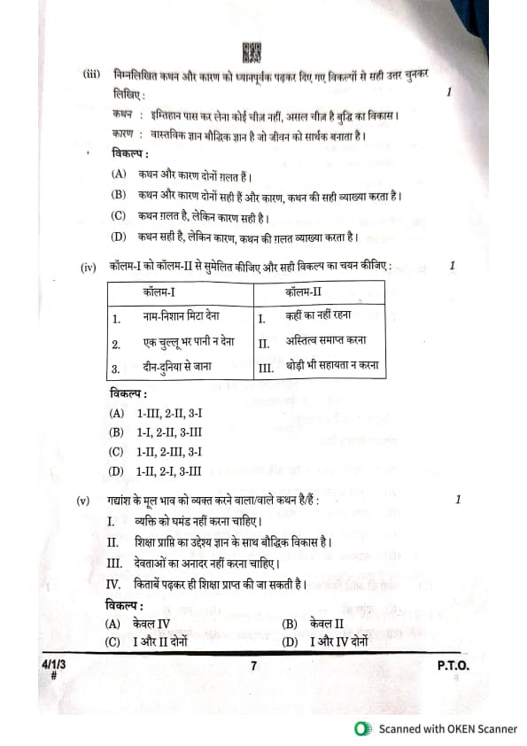 (iii) निम्नलिखित कथन और कारण को ध्यानपूर्वक पढ़कर दिए गए विकल्पों में से सही उत्तर चुनकर लिखिए: