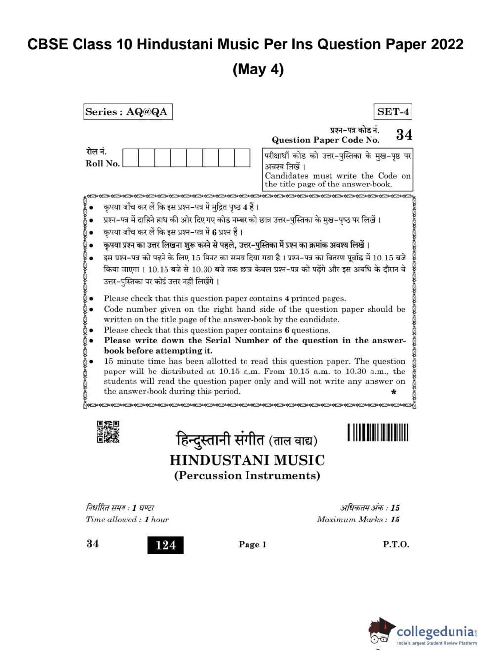 CBSE Class 10 Hindustani Music Per Ins Question Paper 2022 with Answer Key Set 4 is available for download. The exam was conducted by the Central Board of Secondary Education on May 4, 2022 in the Morning Session 10:30 AM to 11:30 AM. The medium of paper was English & Hindi. The question paper comprised a total of 6 questions.