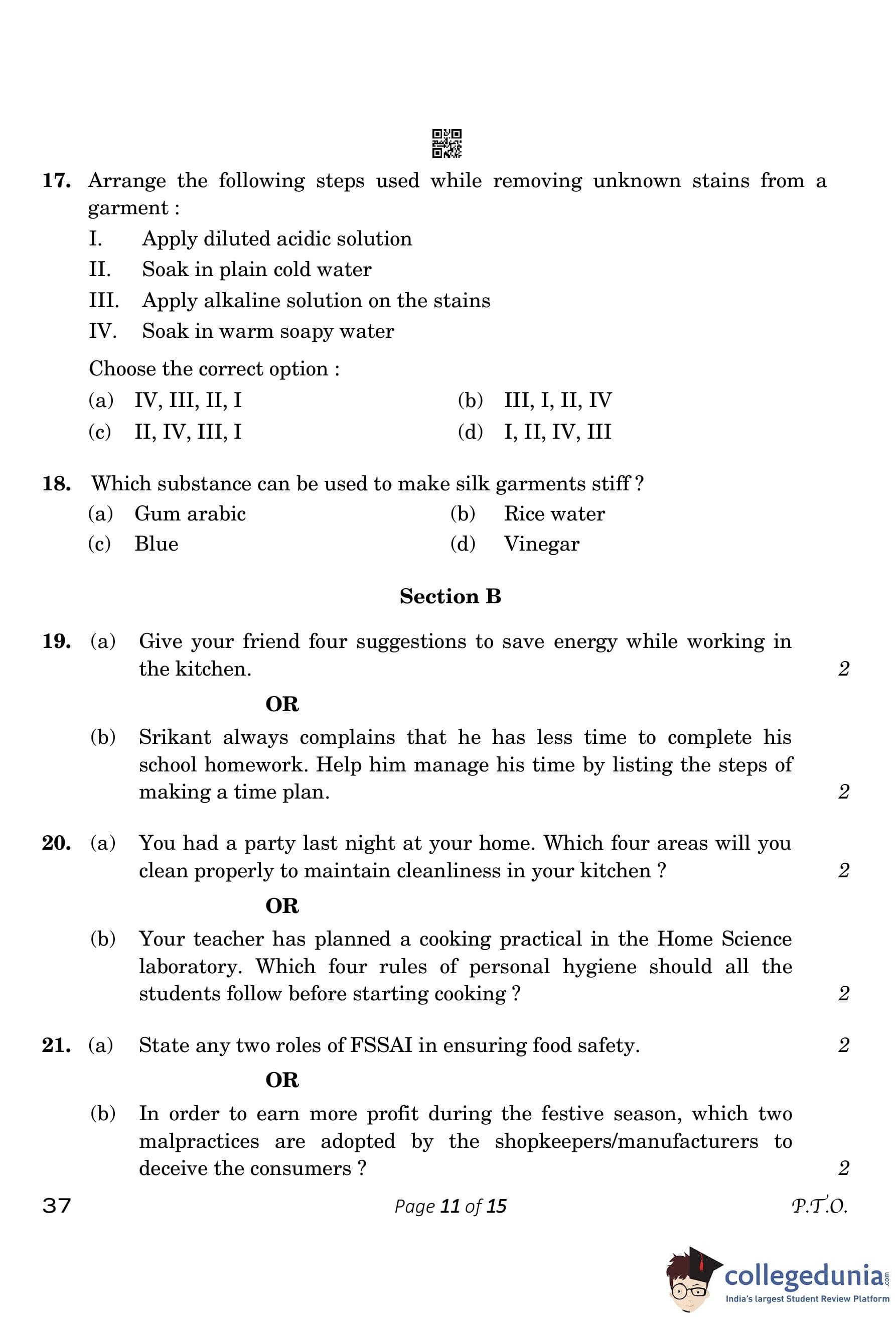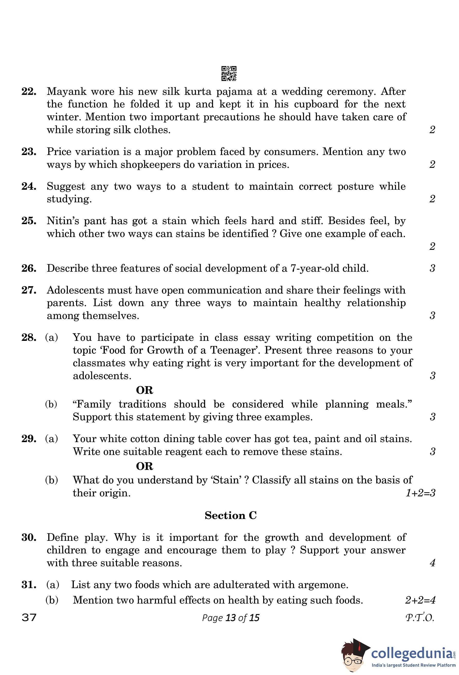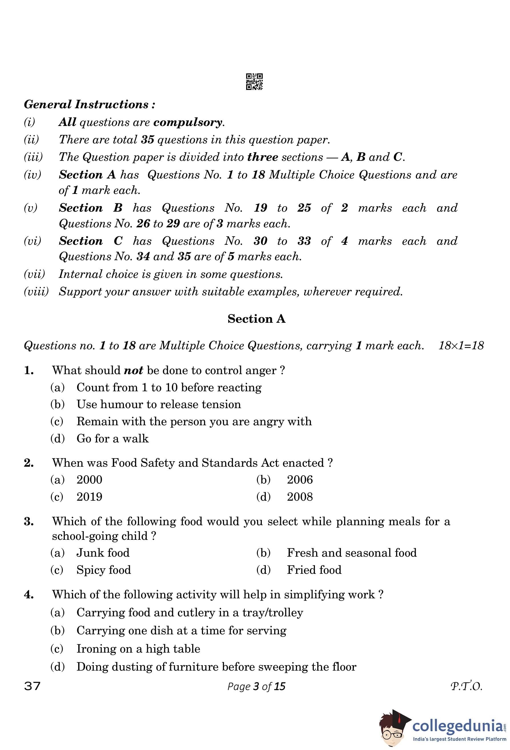 CBSE Class 10 Home Science Compartment Question Paper 2023 with Answer Key pdf is available for download here. The exam was conducted by Central Board of Secondary Education on July 21, 2023 in the Morning Session 10:30 AM to 1:30 PM. The question paper comprised a total of 35 questions divided among 3 sections.