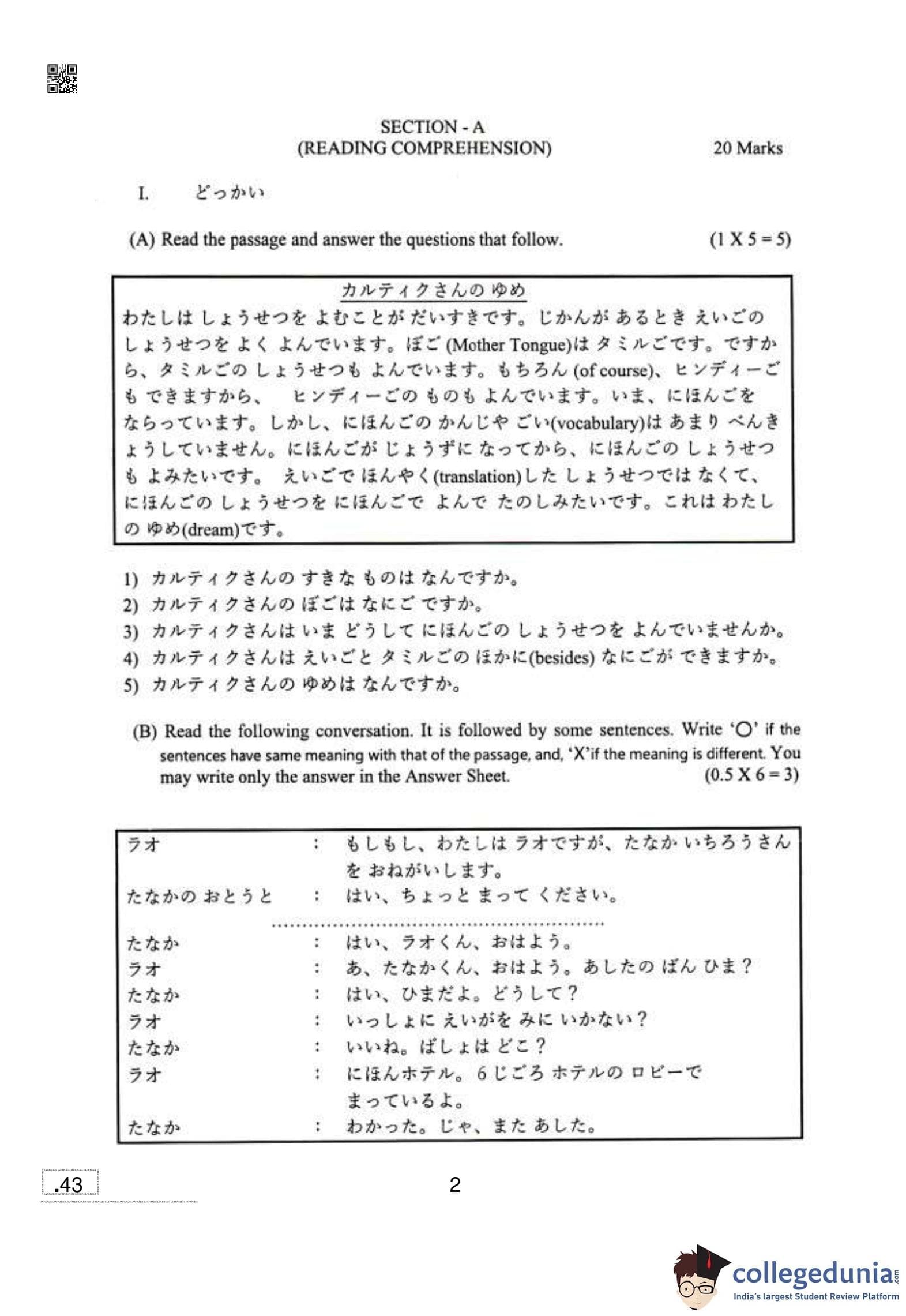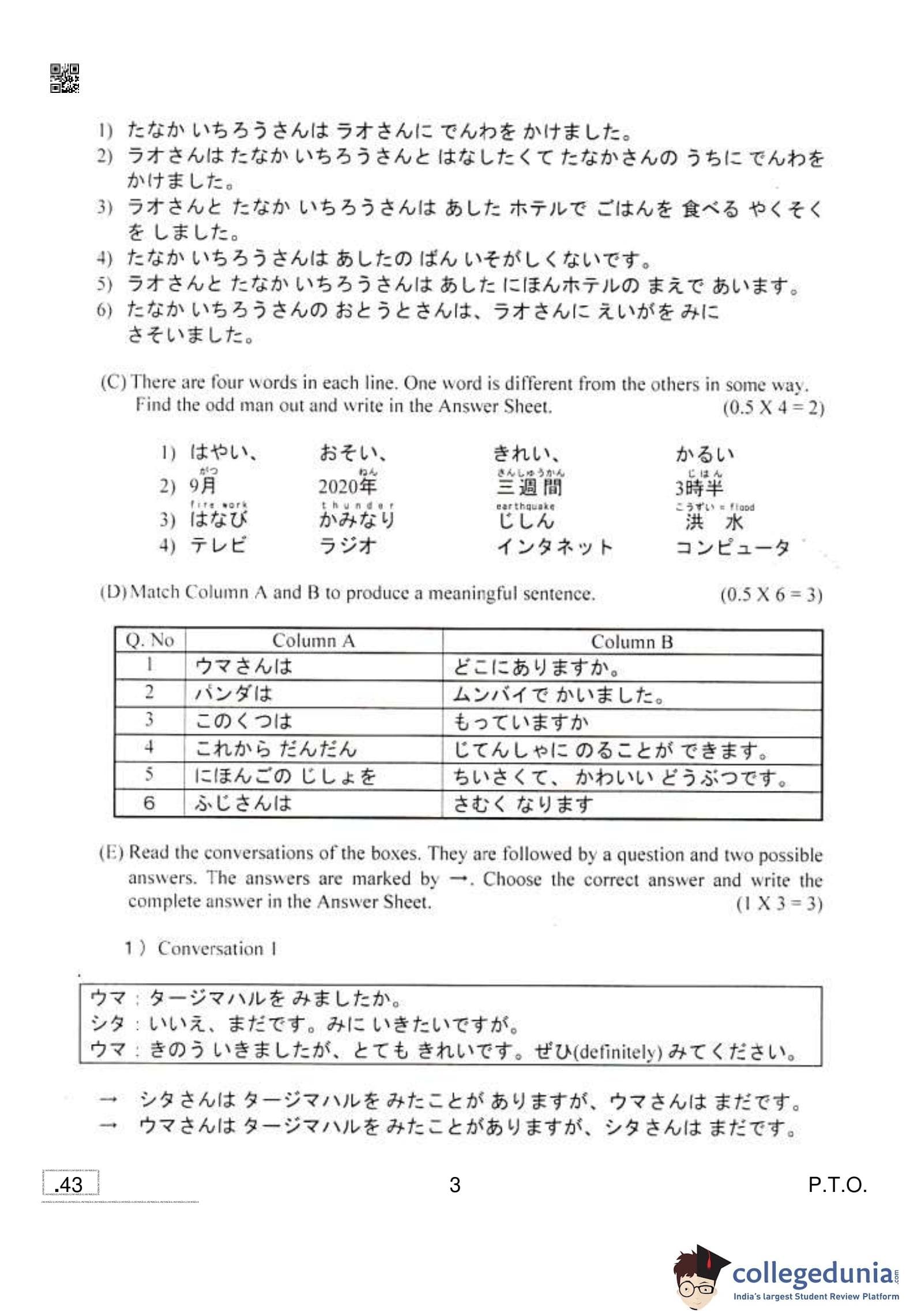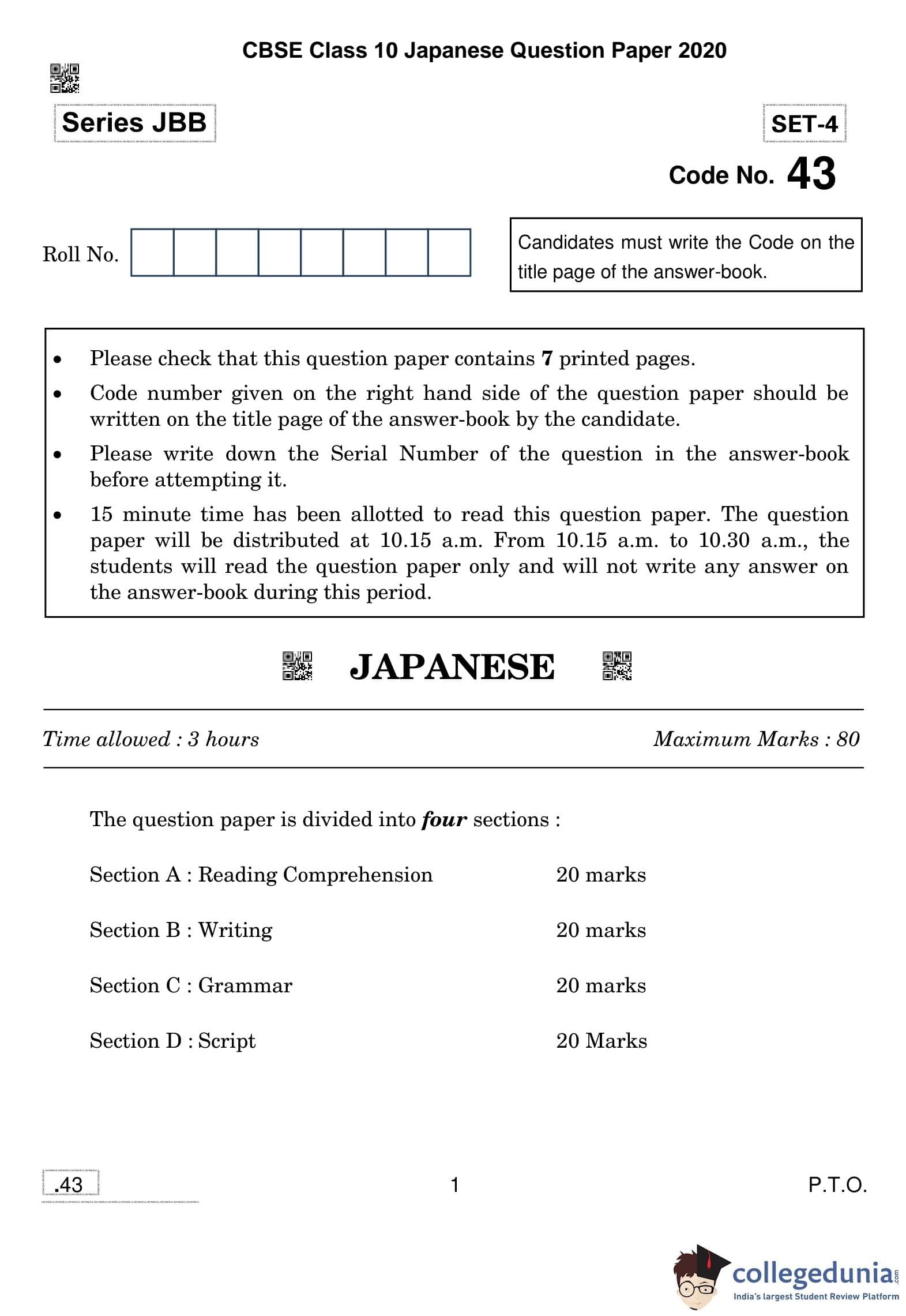 CBSE Class 10 Japanese Question Paper 2020 with Answer Key (February 22)