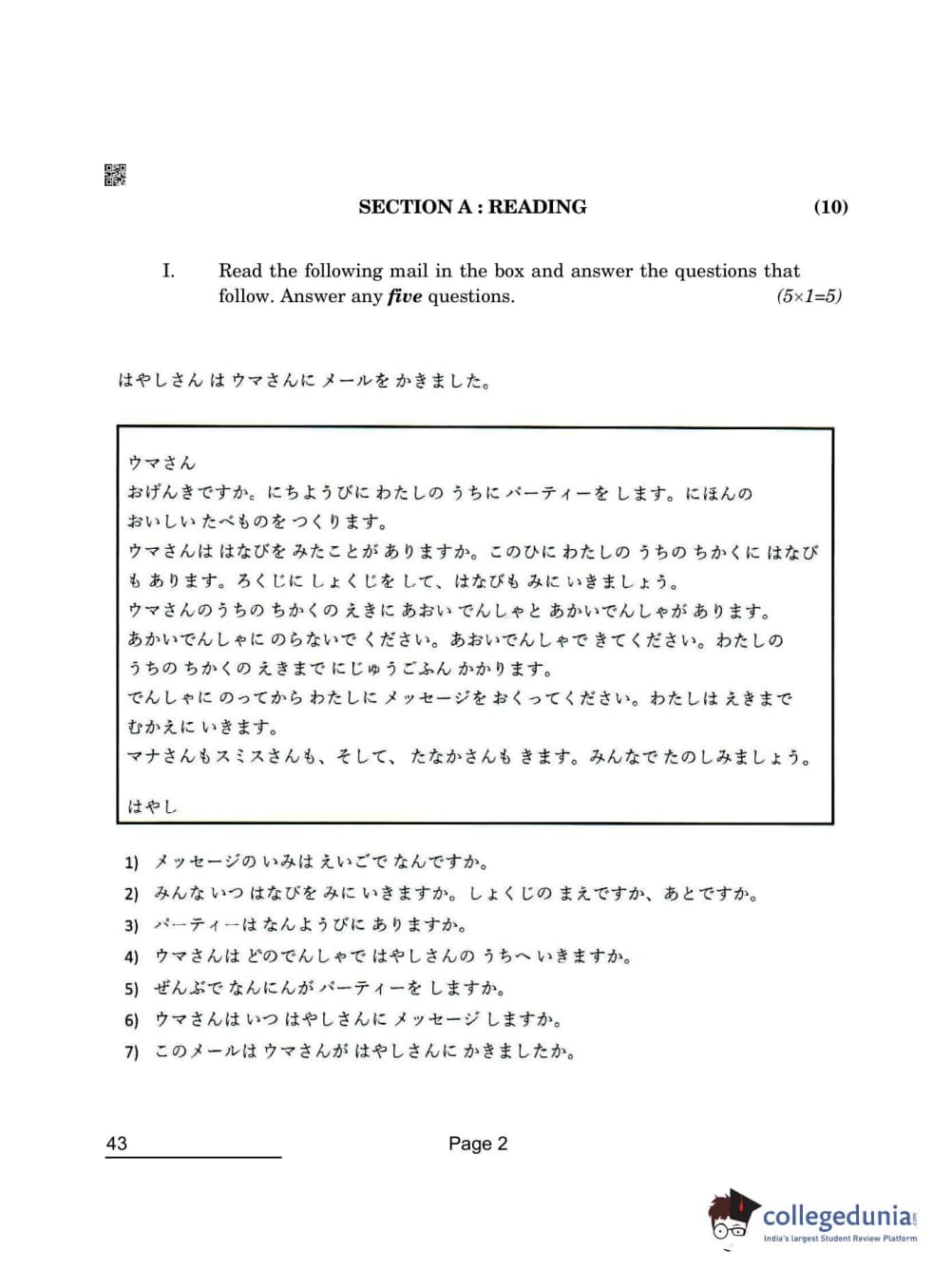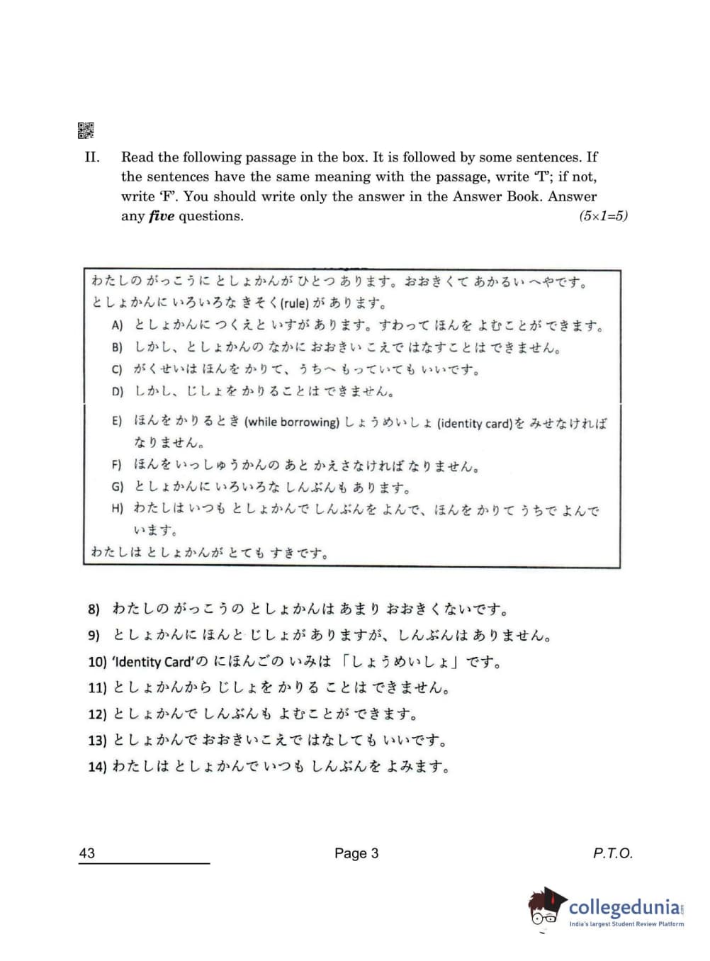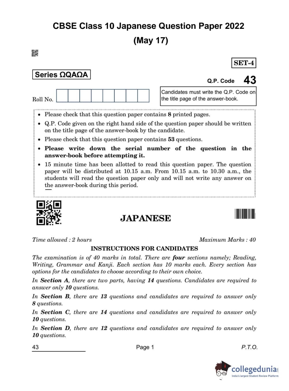 CBSE Class 10 Japanese Question Paper 2022 with Answer Key (May 17)