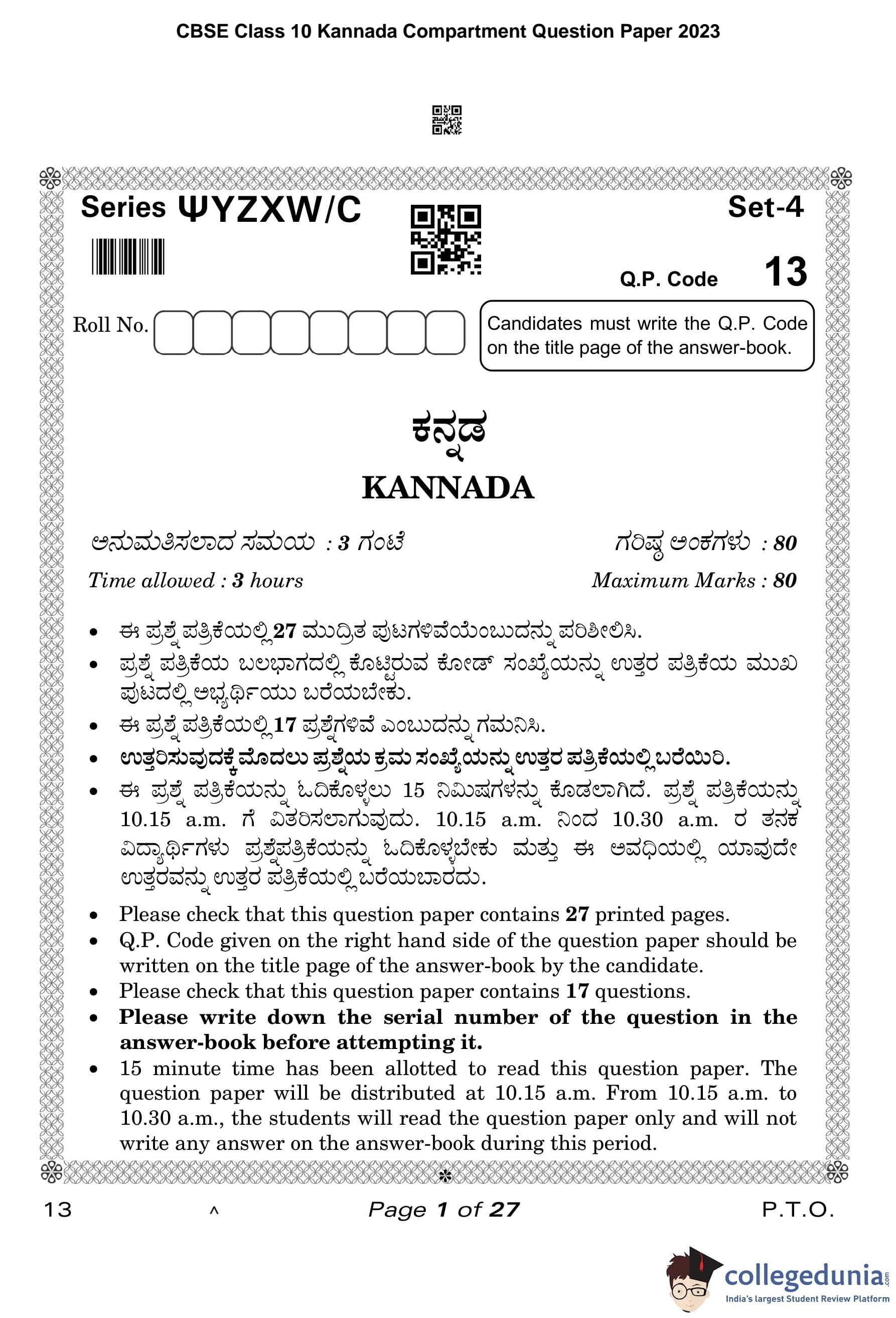 CBSE Class 10 Kannada Compartment Question Paper 2023 with Answer Key