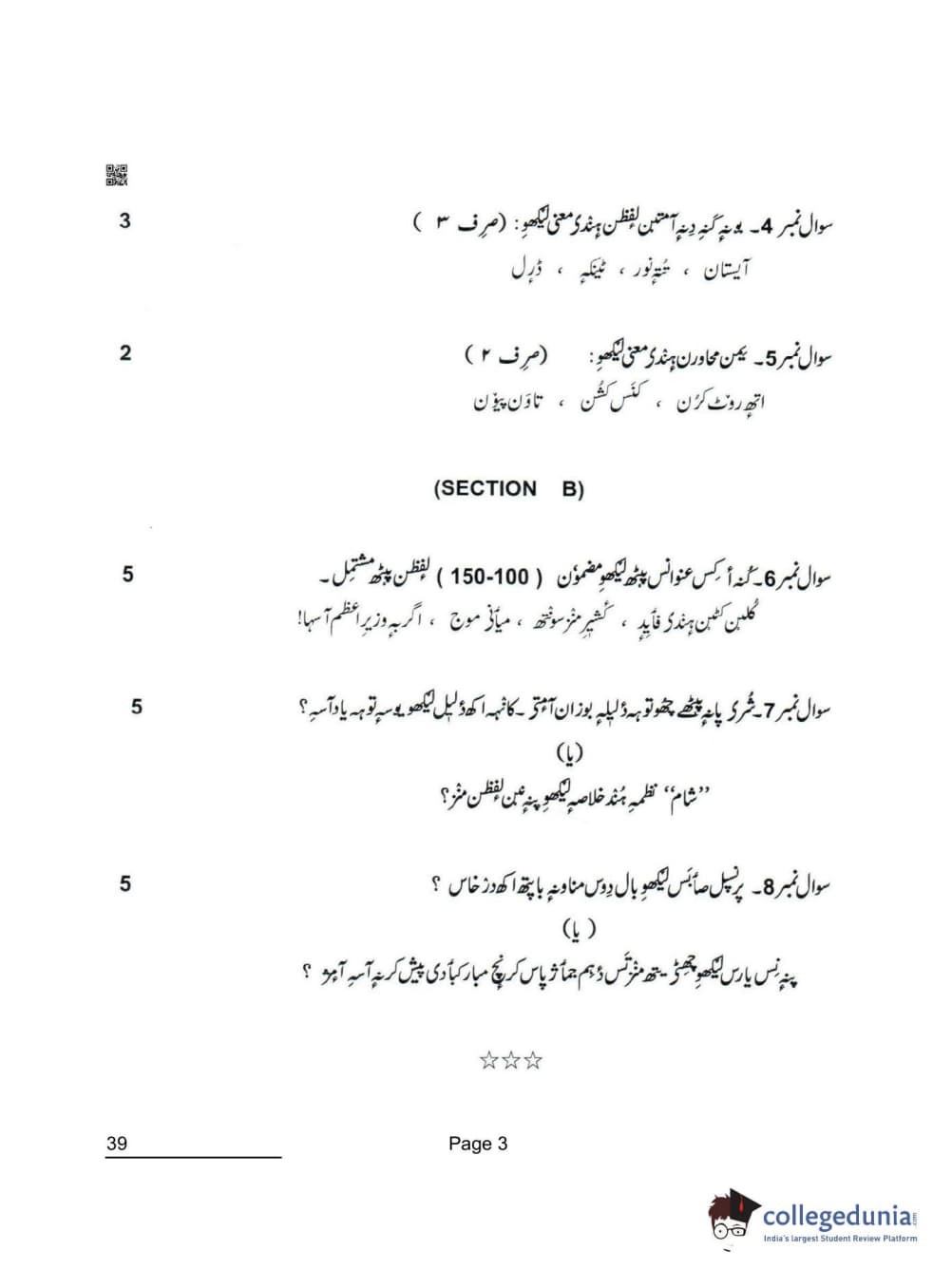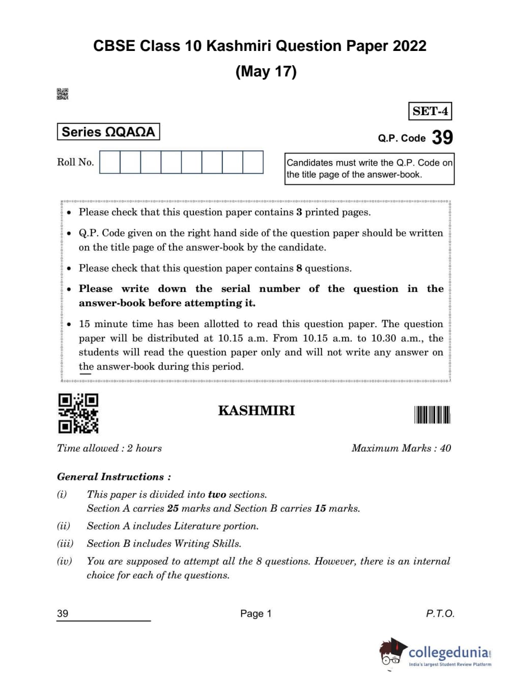 CBSE Class 10 Kashmiri Question Paper 2022 with Answer Key (May 17)