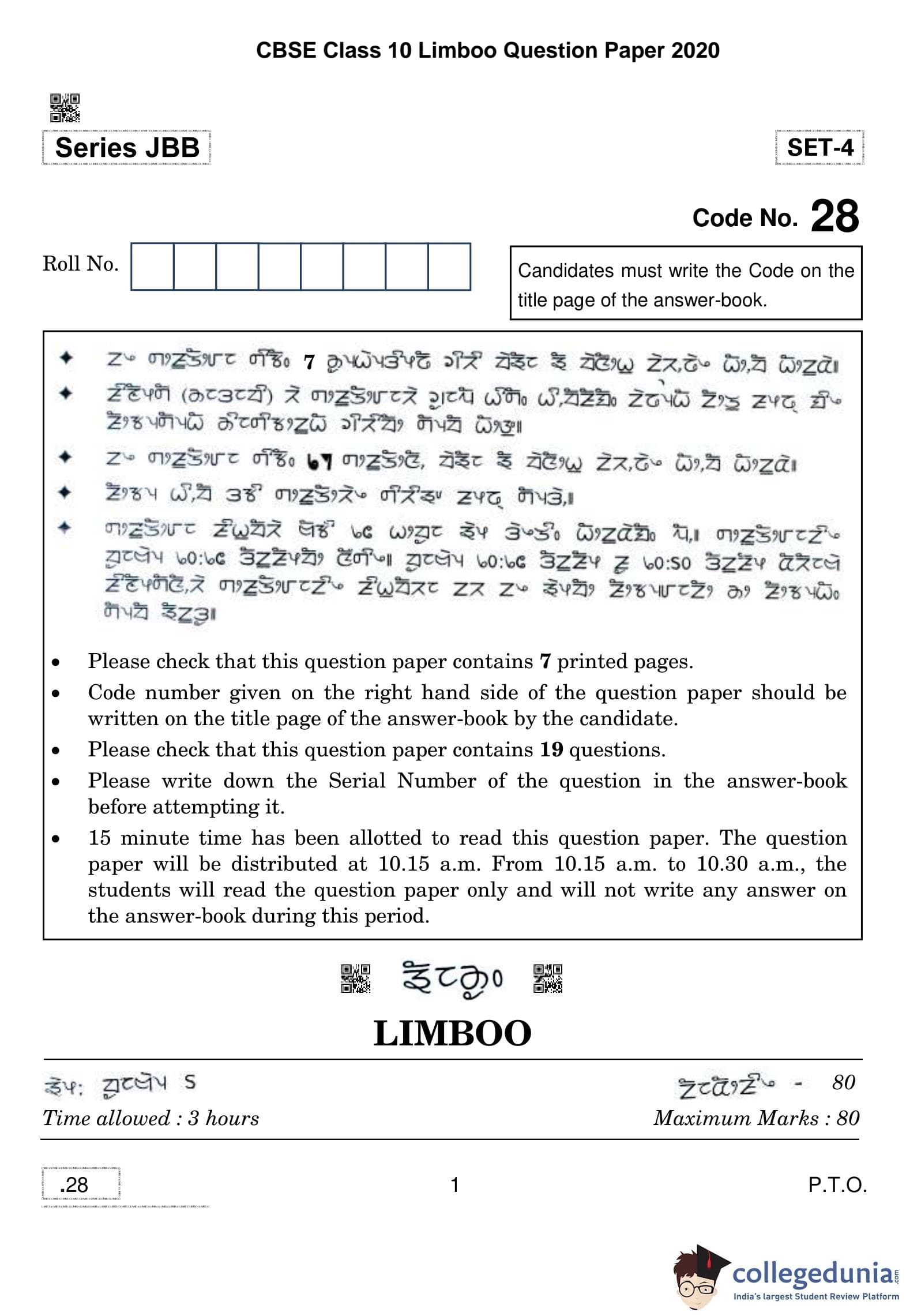 CBSE Class 10 Limboo Question Paper 2020 with Answer Key (February 24)