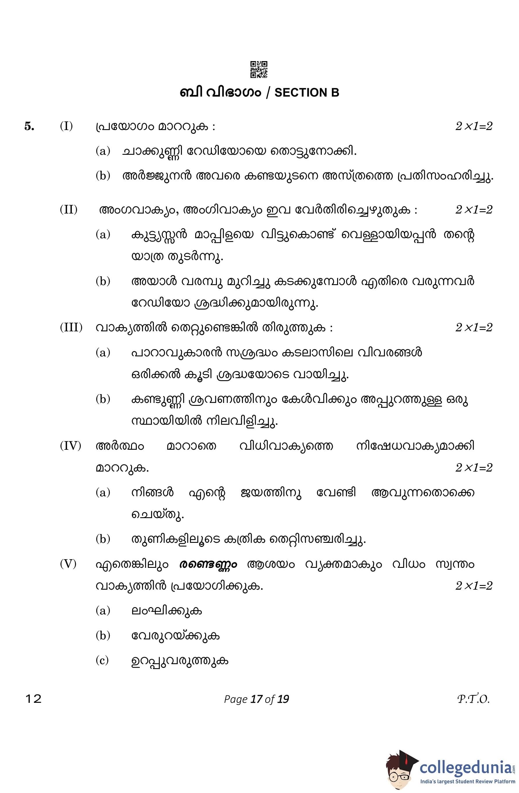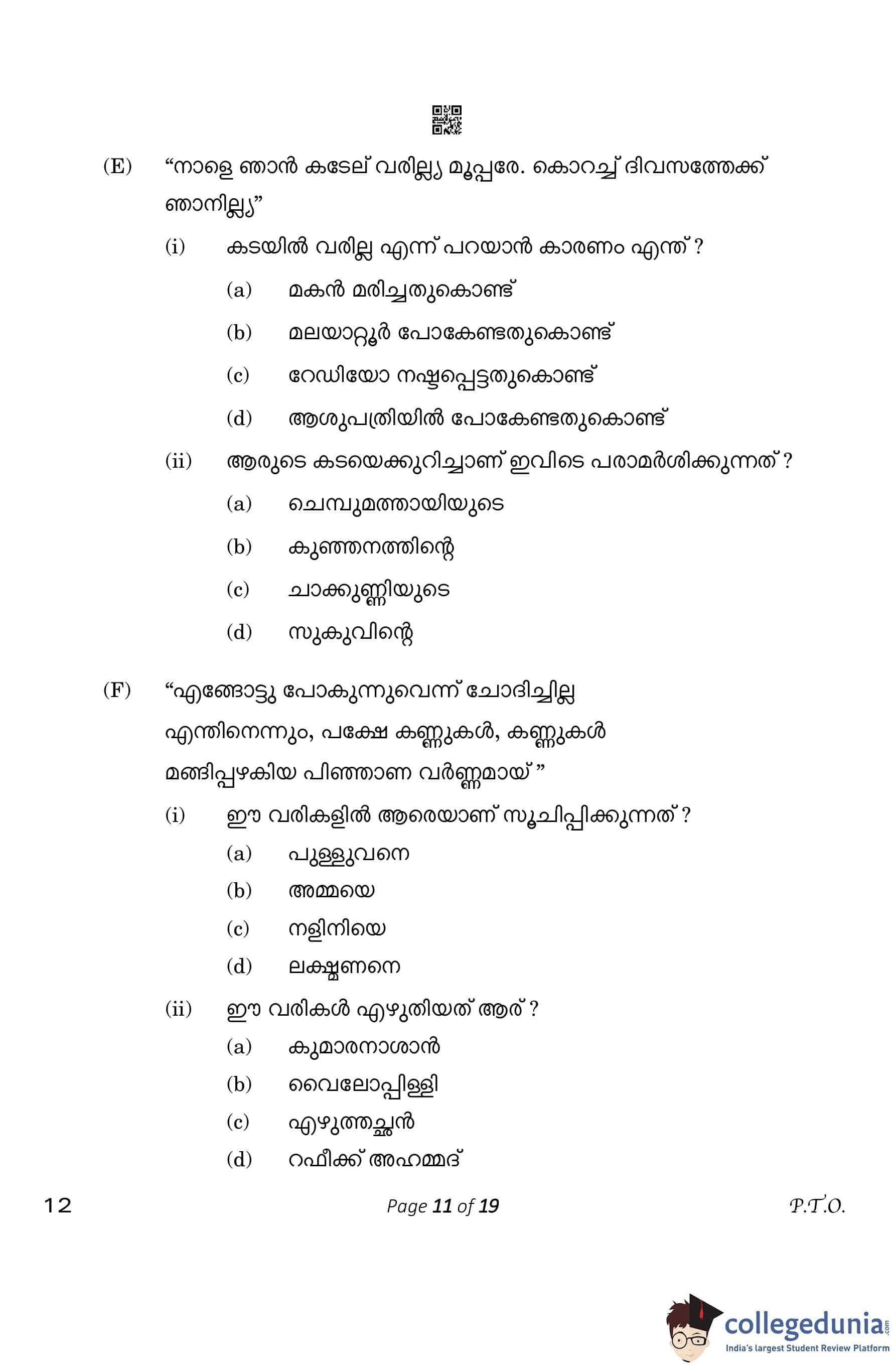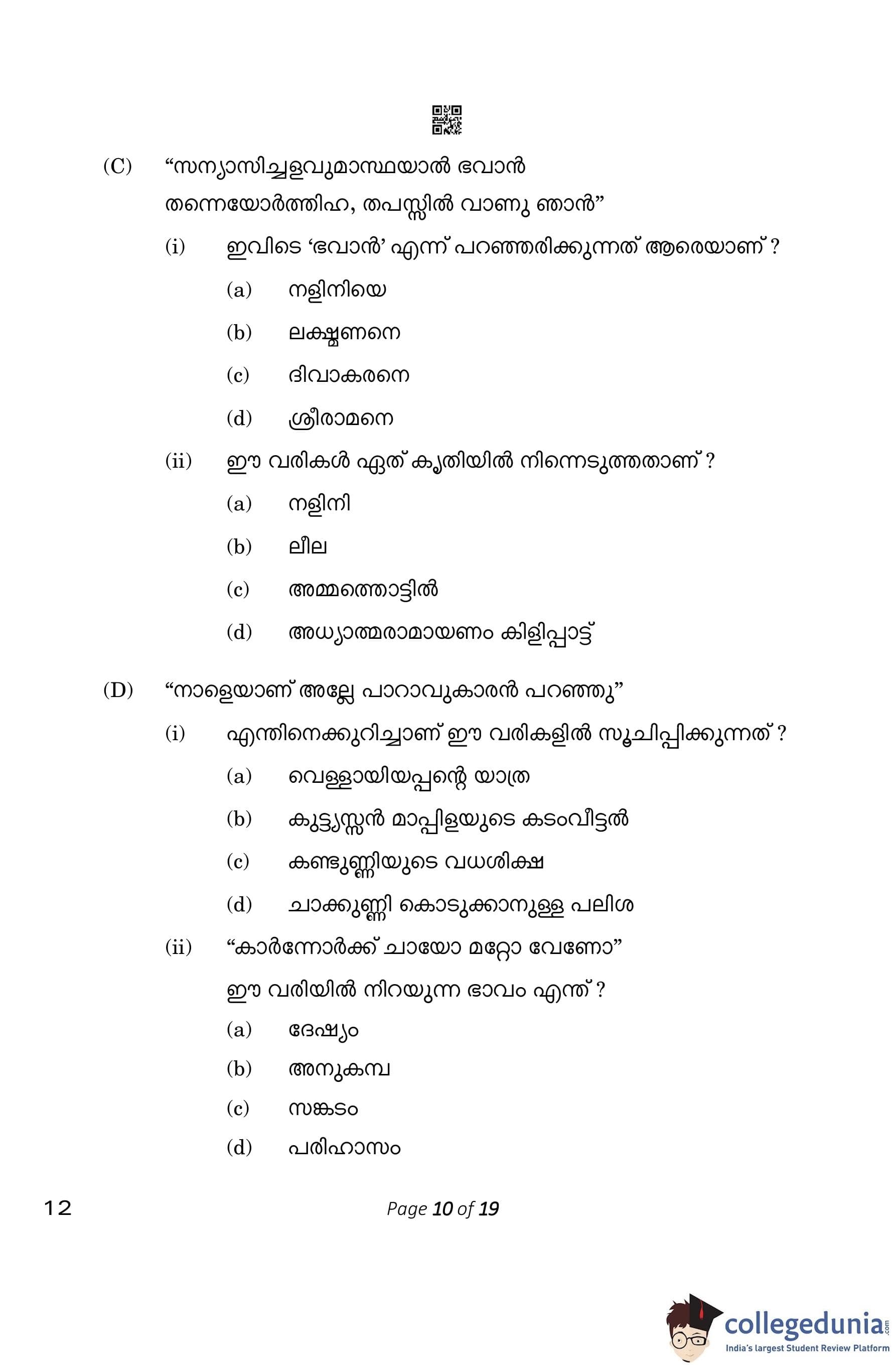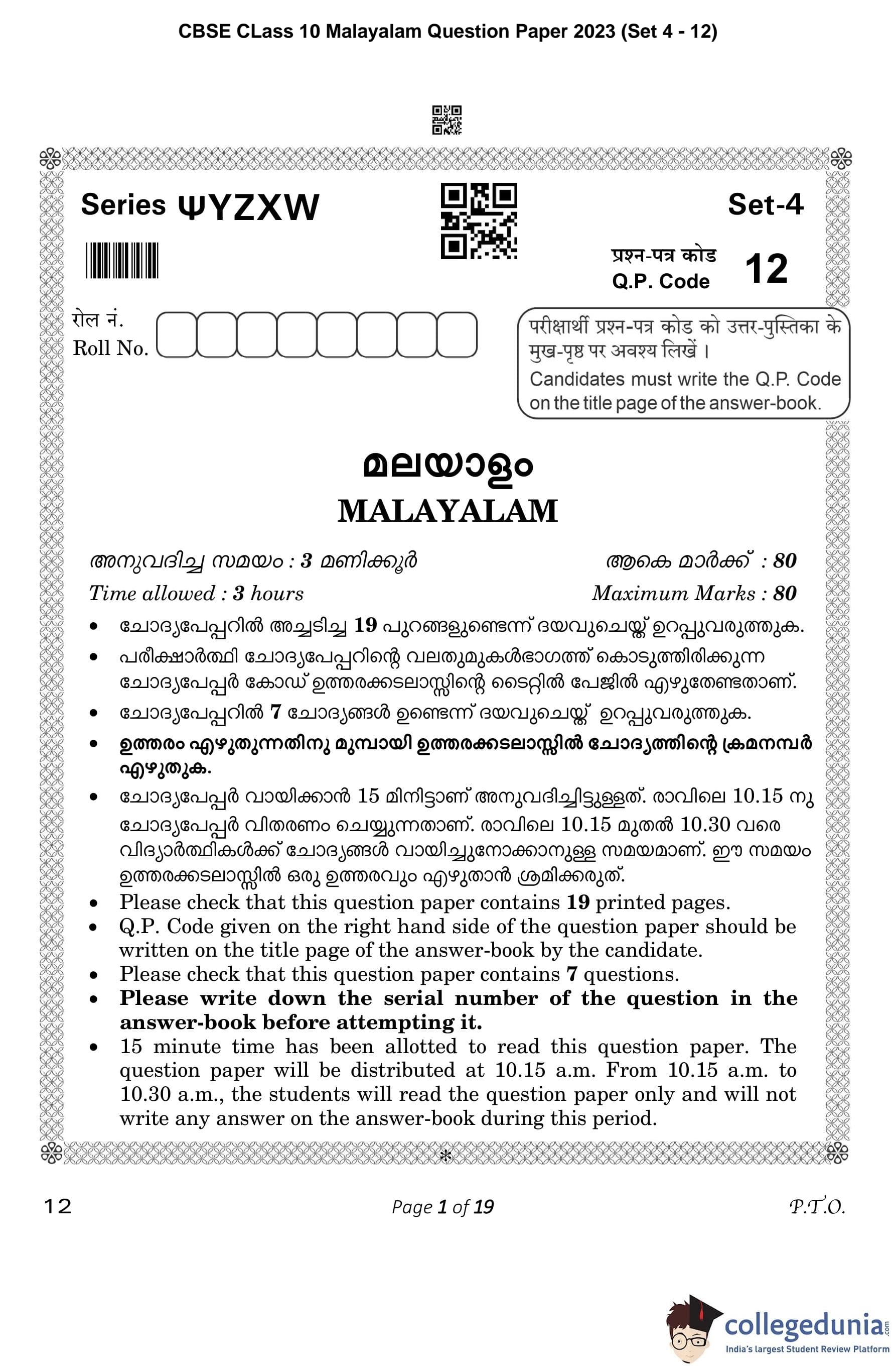 CBSE Class 10 Malayalam Question Paper 2023 (Set 4- 12) with Answer Key pdf is available for download here. The exam was conducted by Central Board of Secondary Education on March 1, 2023. The question paper comprised a total of 7 questions divided among 2 sections.