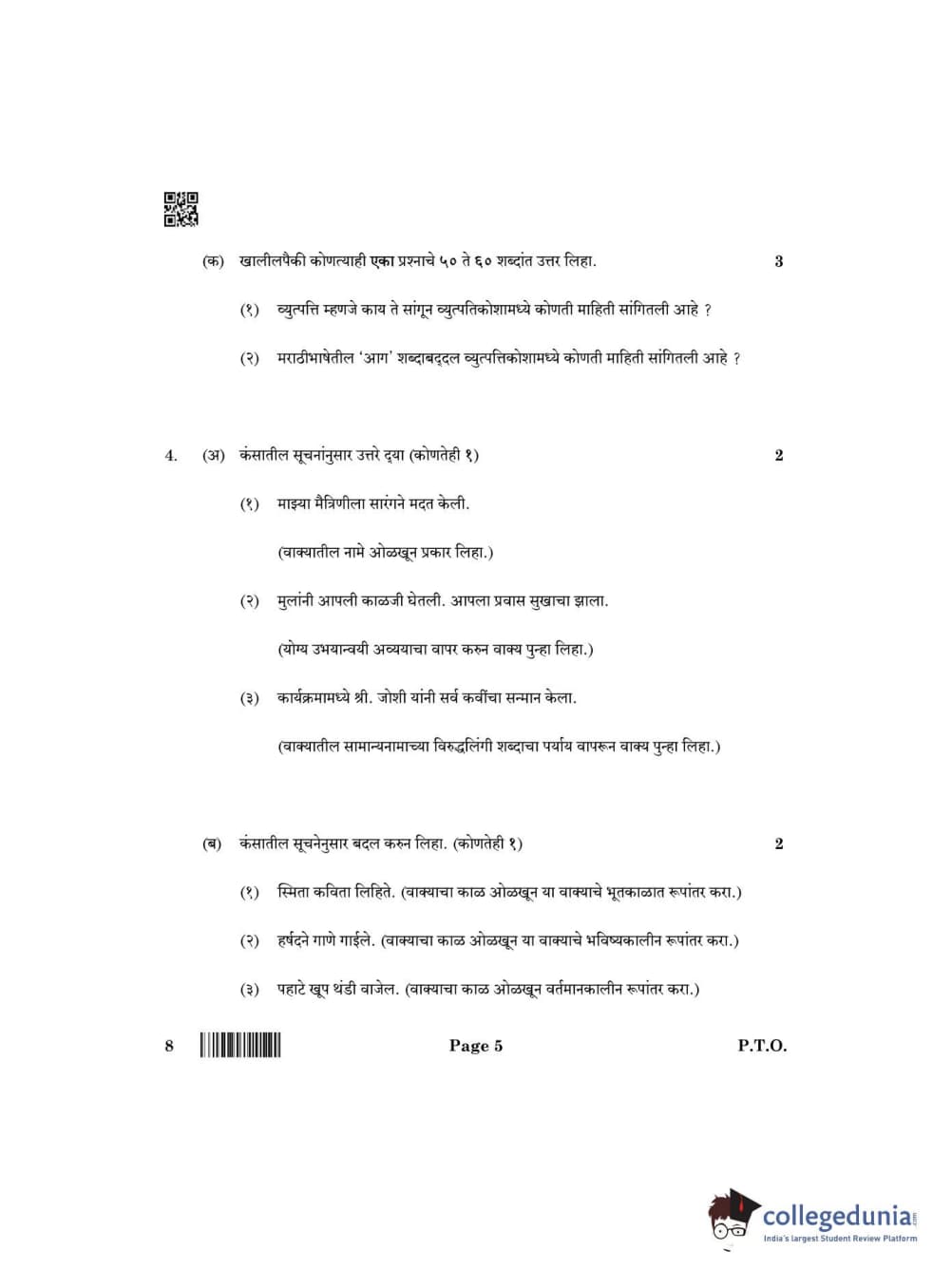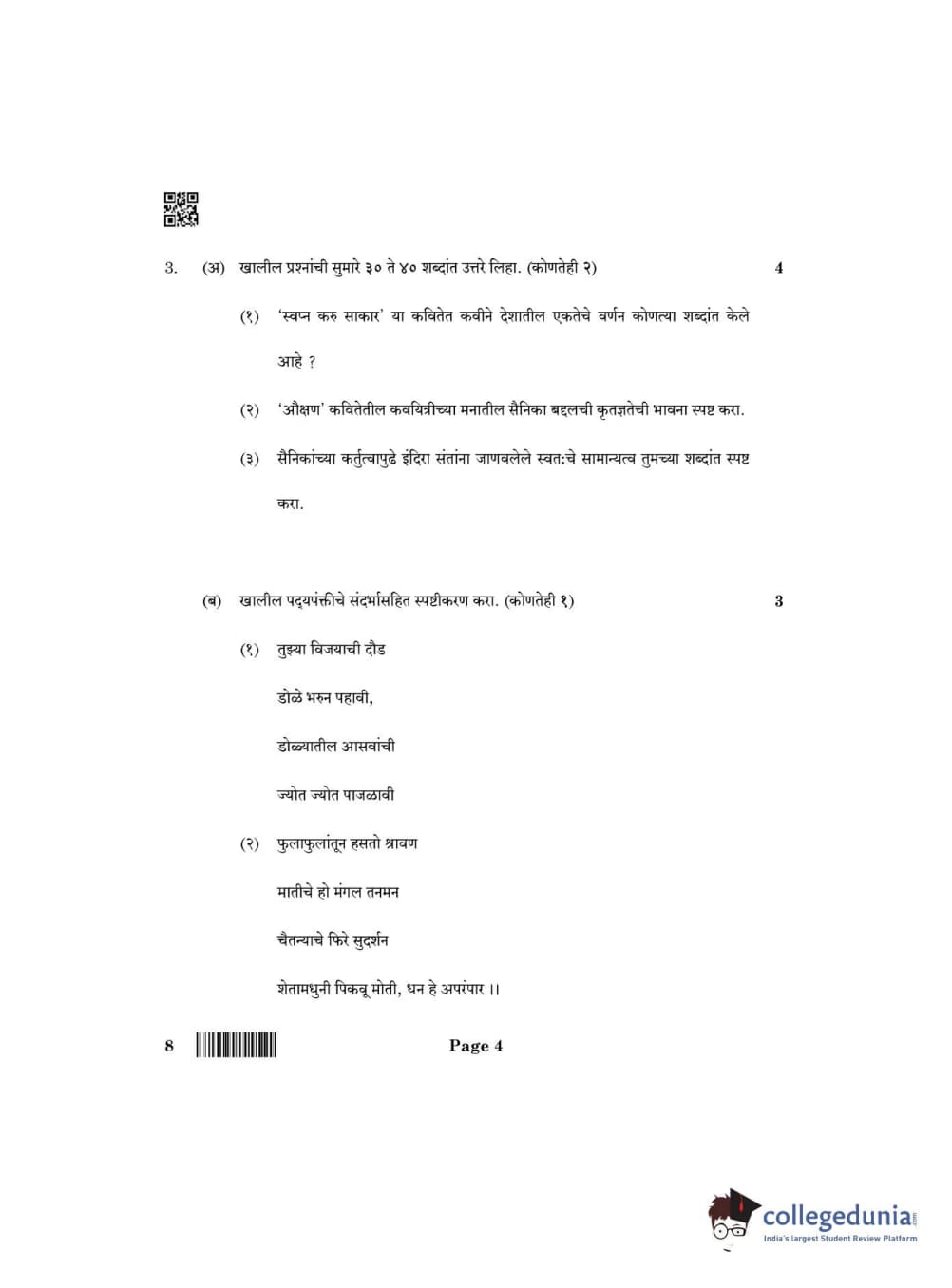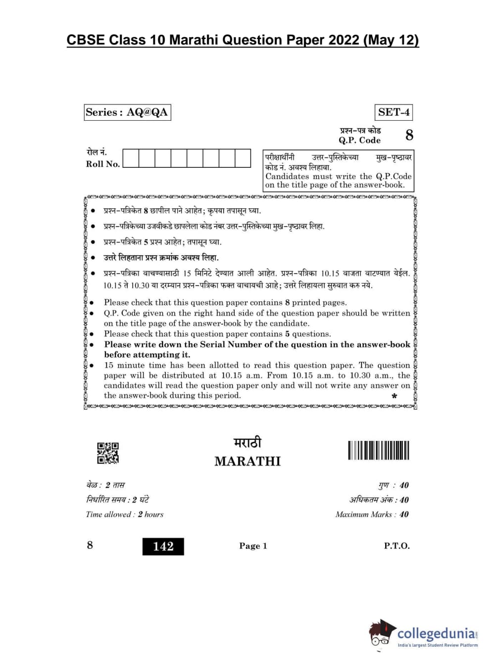 CBSE Class 10 Marathi Question Paper 2022 with Answer Key Set 4 is available for download. The exam was conducted by the Central Board of Secondary Education on May 12, 2022 in the Morning Session 10:30 AM to 12:30 PM. The medium of paper was Marathi. The question paper comprised a total of 5 questions.