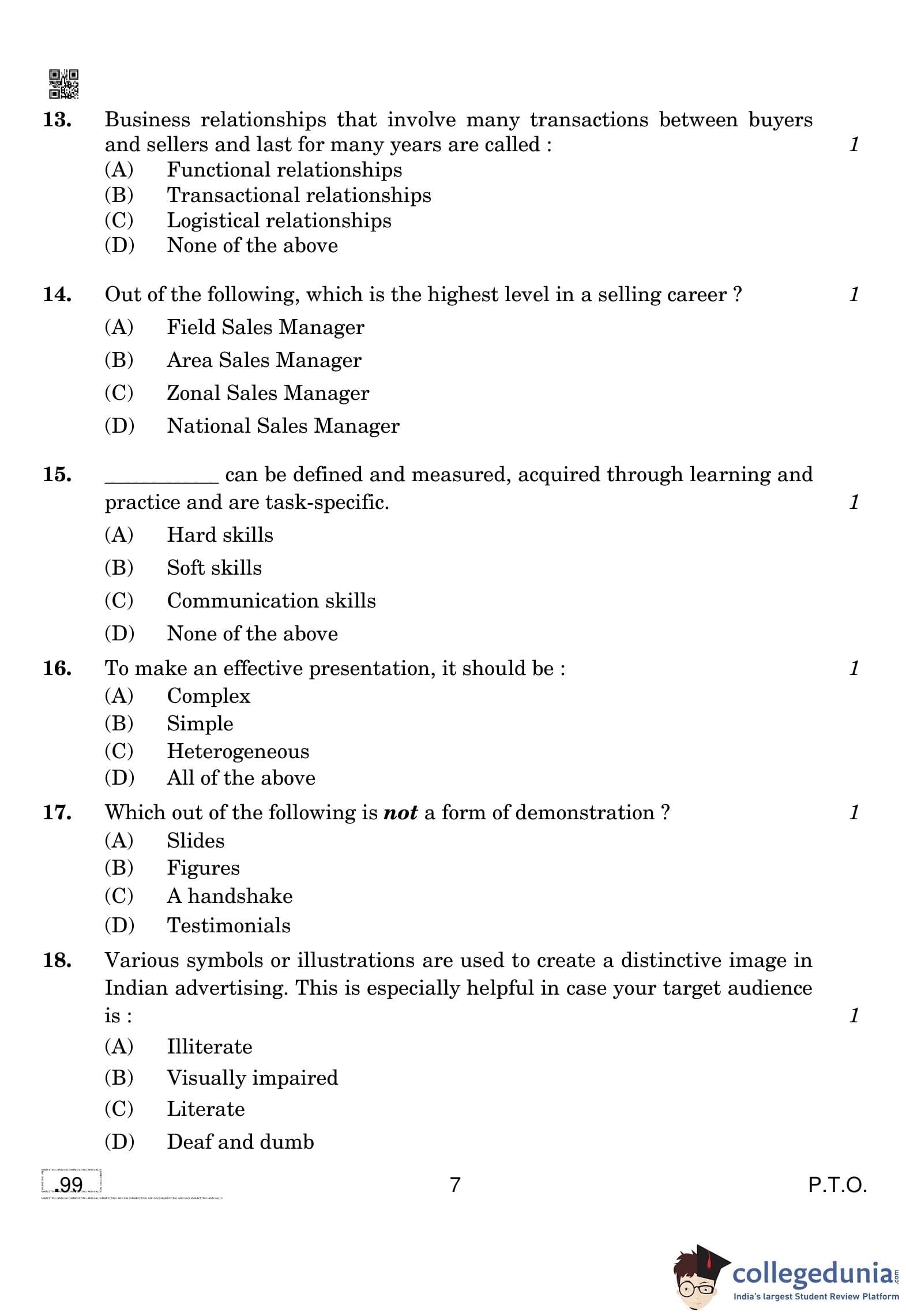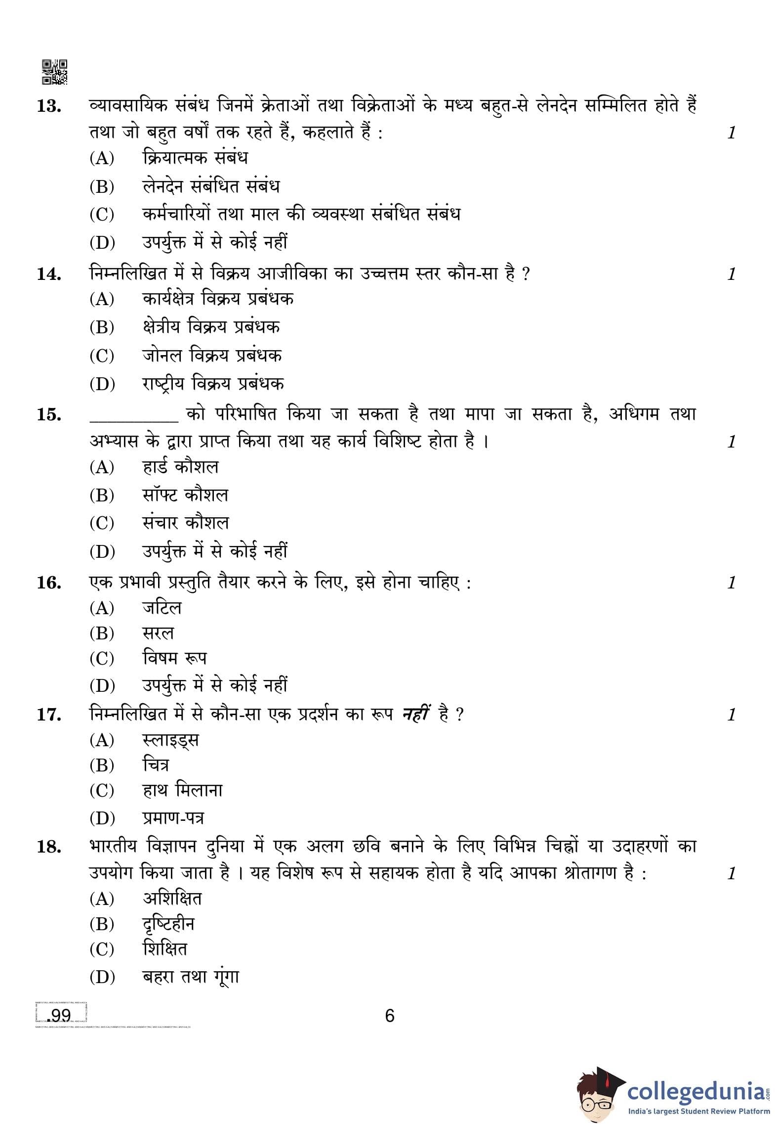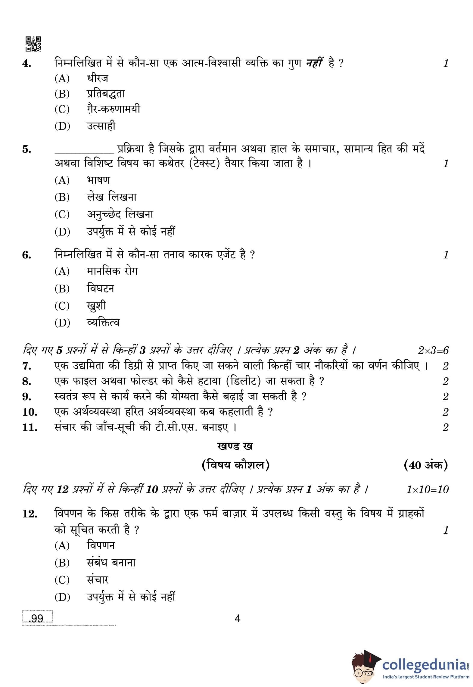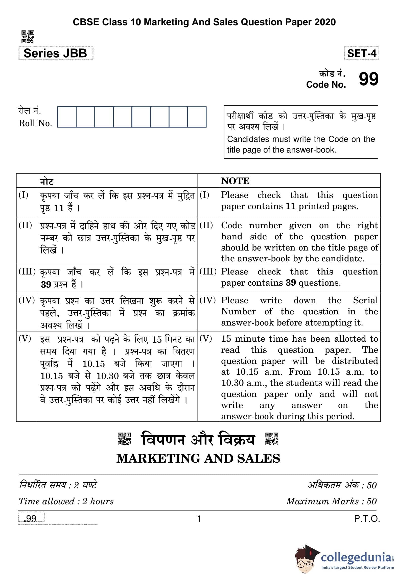 CBSE Class 10 Marketing And Sales Question Paper 2020 with Answer Key Set 4 is available for download. The exam was conducted by the Central Board of Secondary Education on February 20, 2020 in the Morning Session 10:30 AM to 12:30 PM. The medium of paper was English and Hindi. The question paper comprised a total of 39 questions divided among 2 sections.