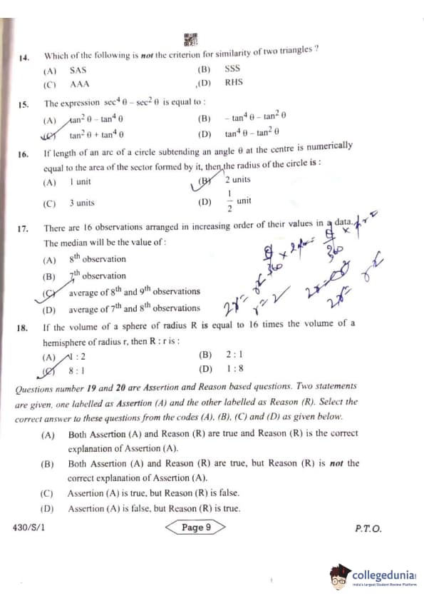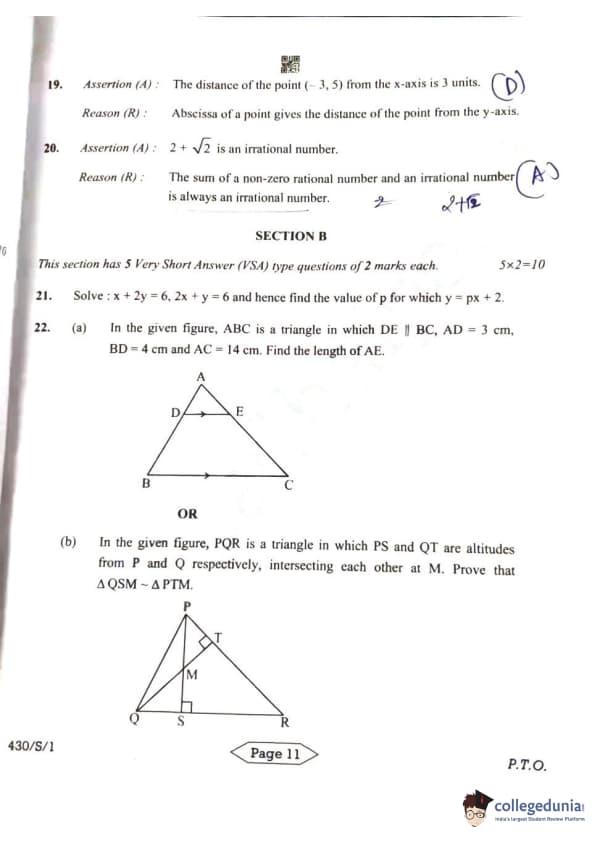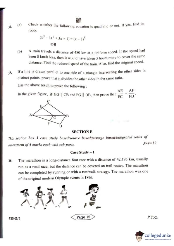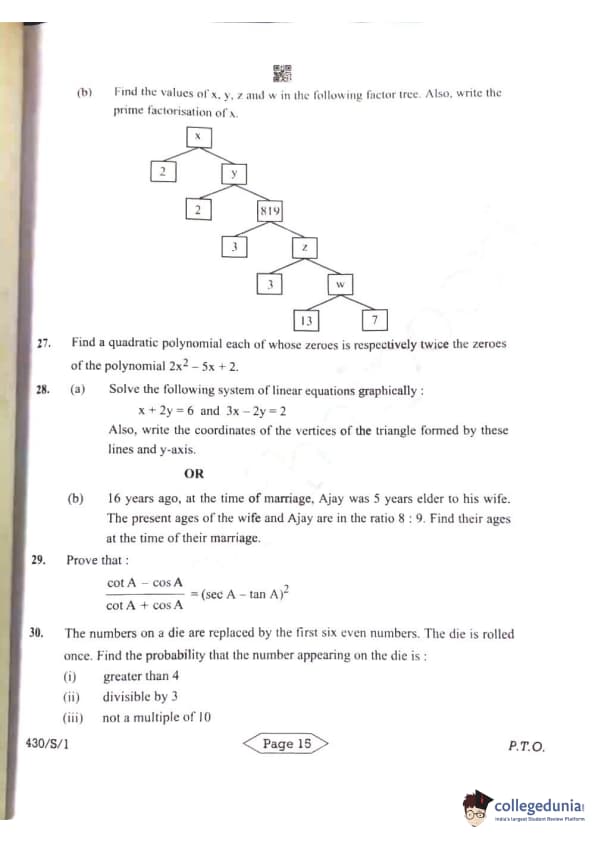 CBSE Class 10 Mathematics Basic (Set 1- 430/S/1) Compartment Question Paper 2024 with Answer Key