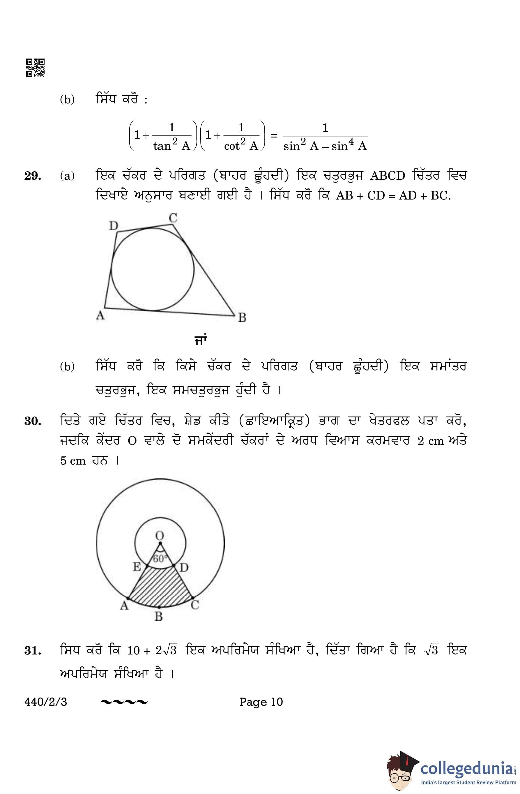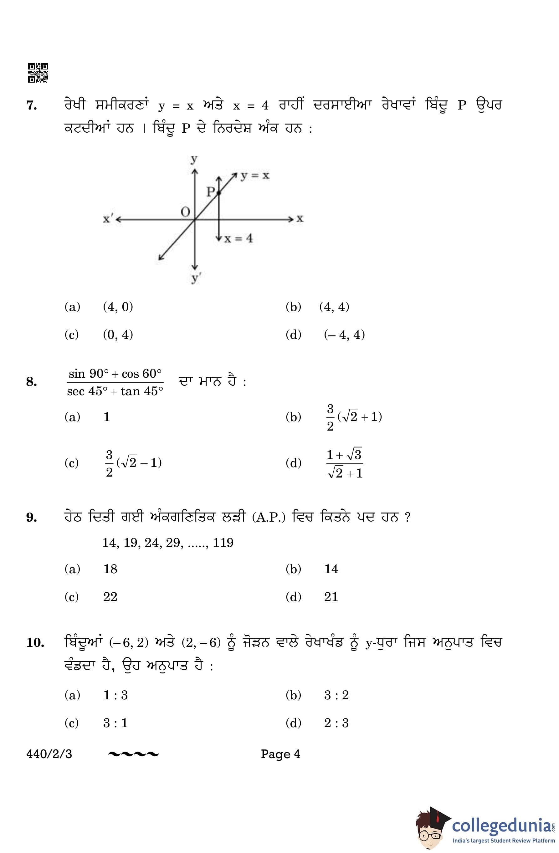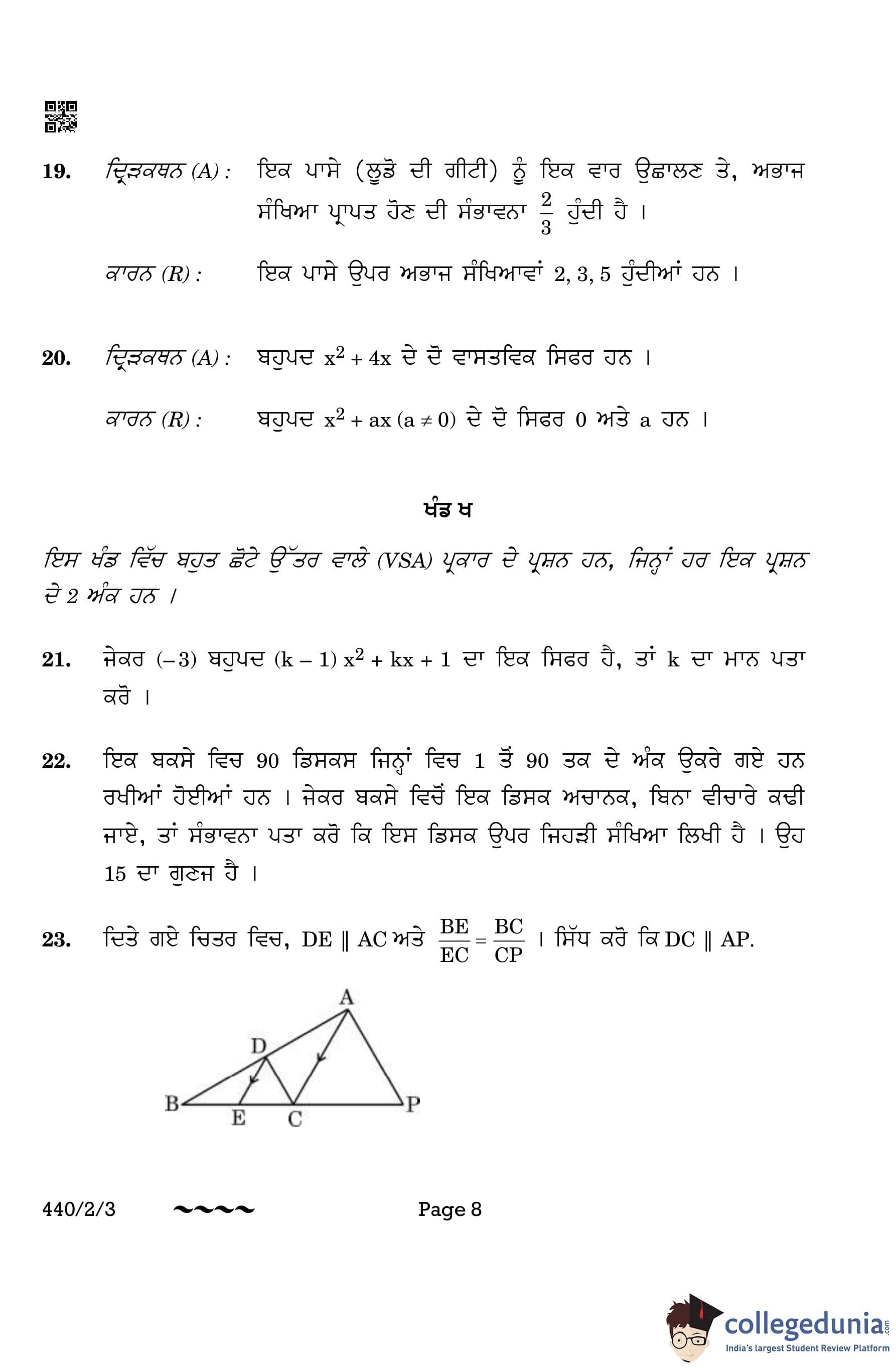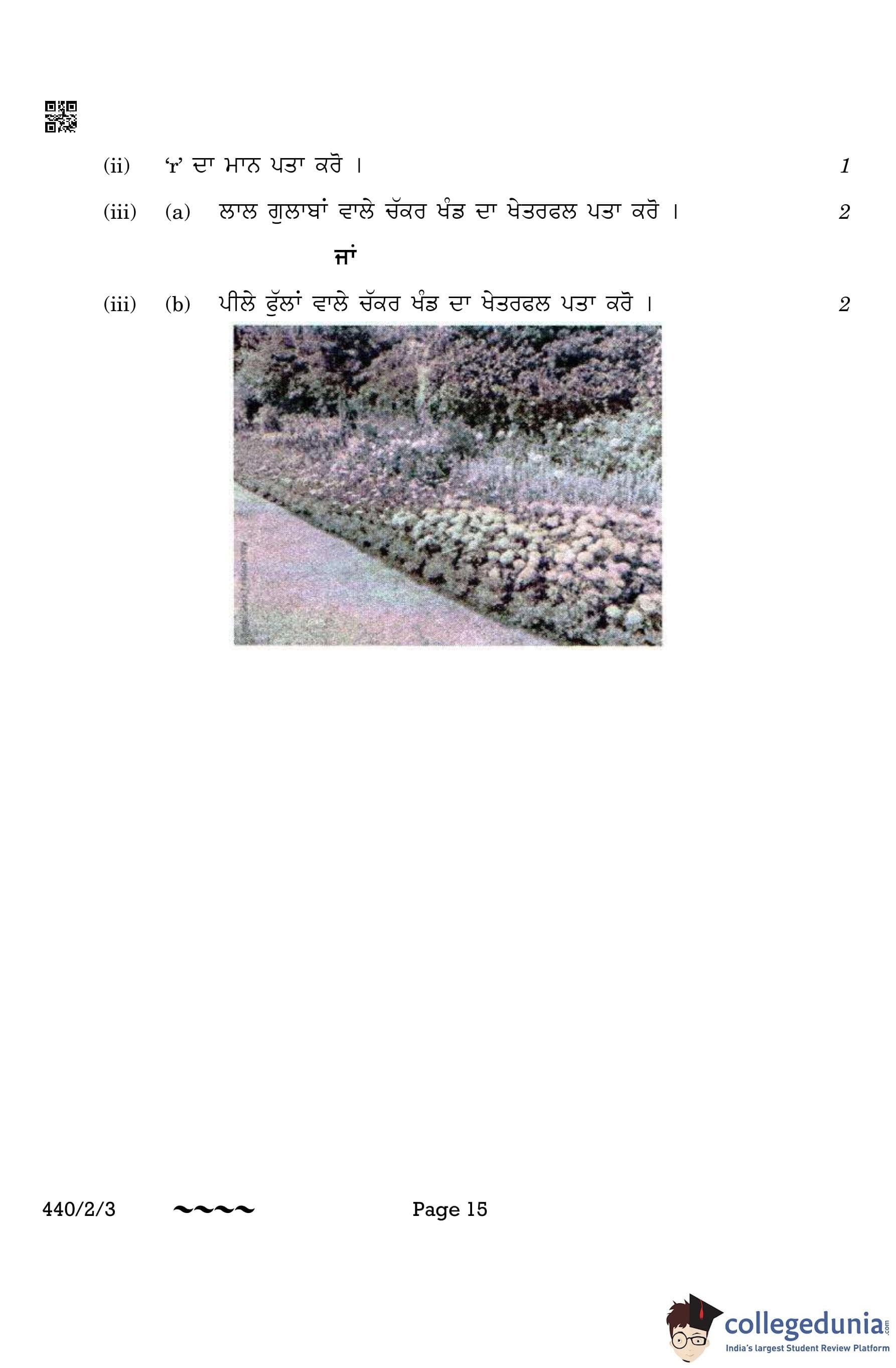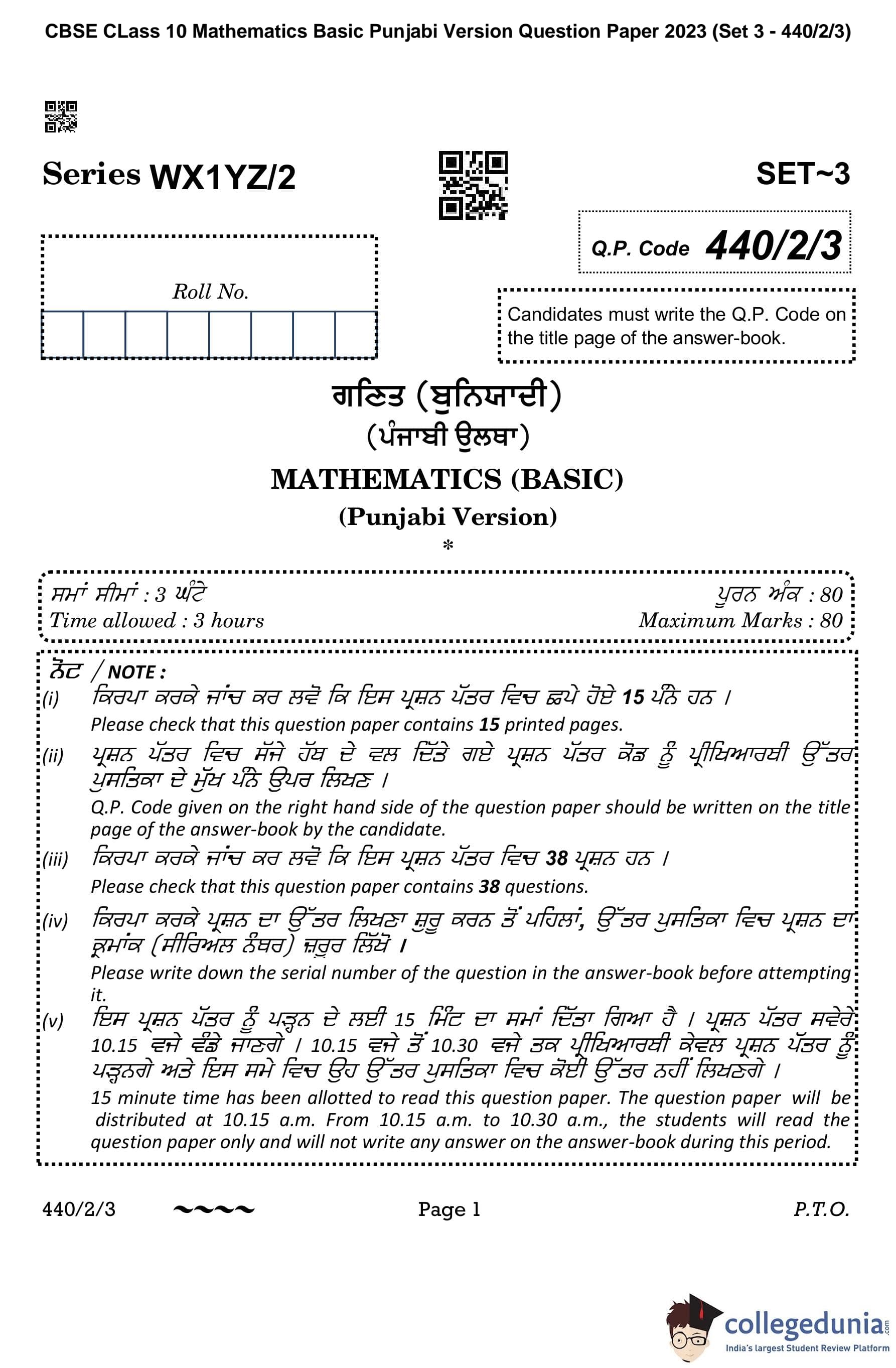 CBSE Class 10 Mathematics Basic (Punjabi Version) (Set 3) Question Paper 2023 with Answer Key