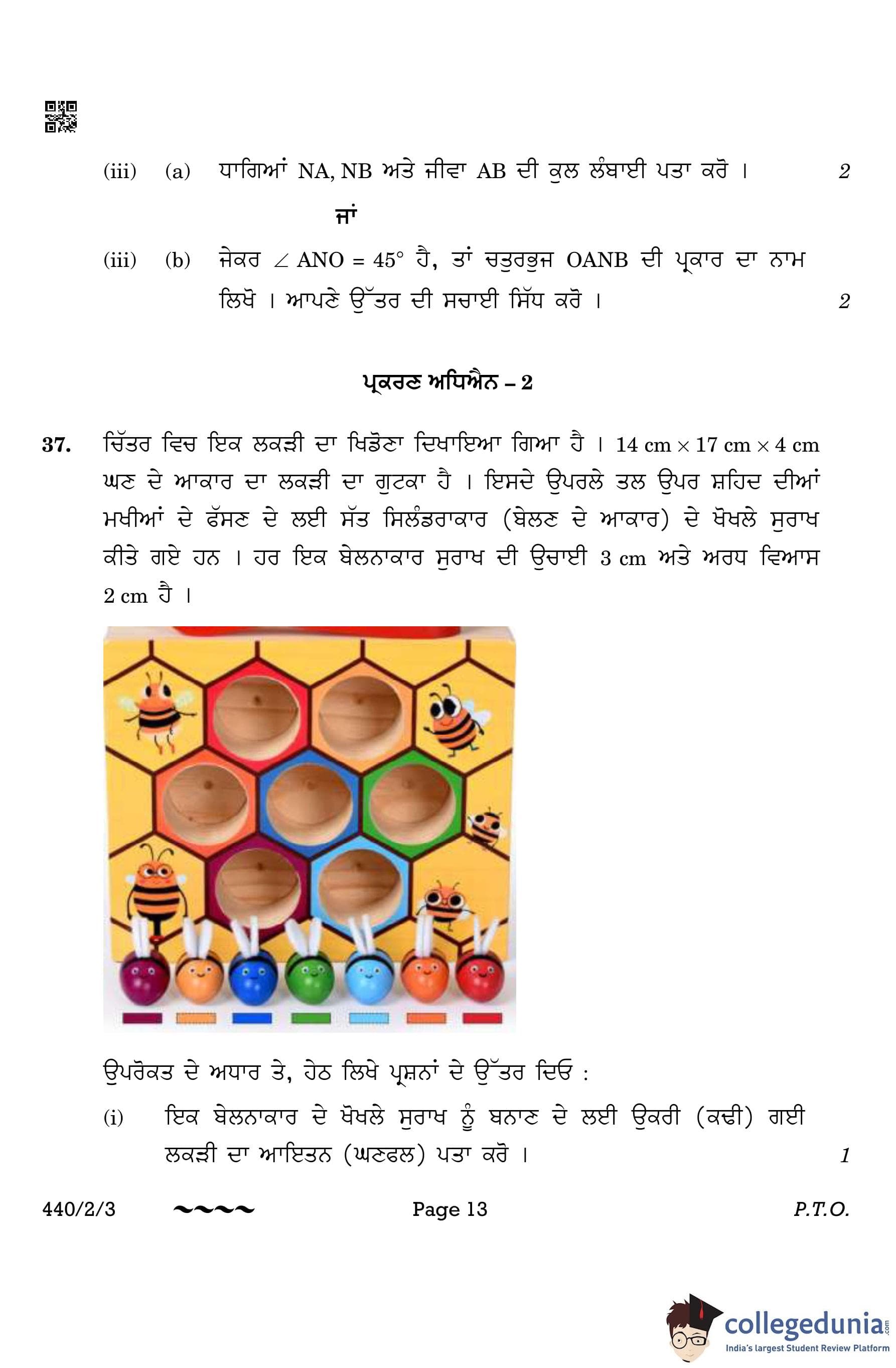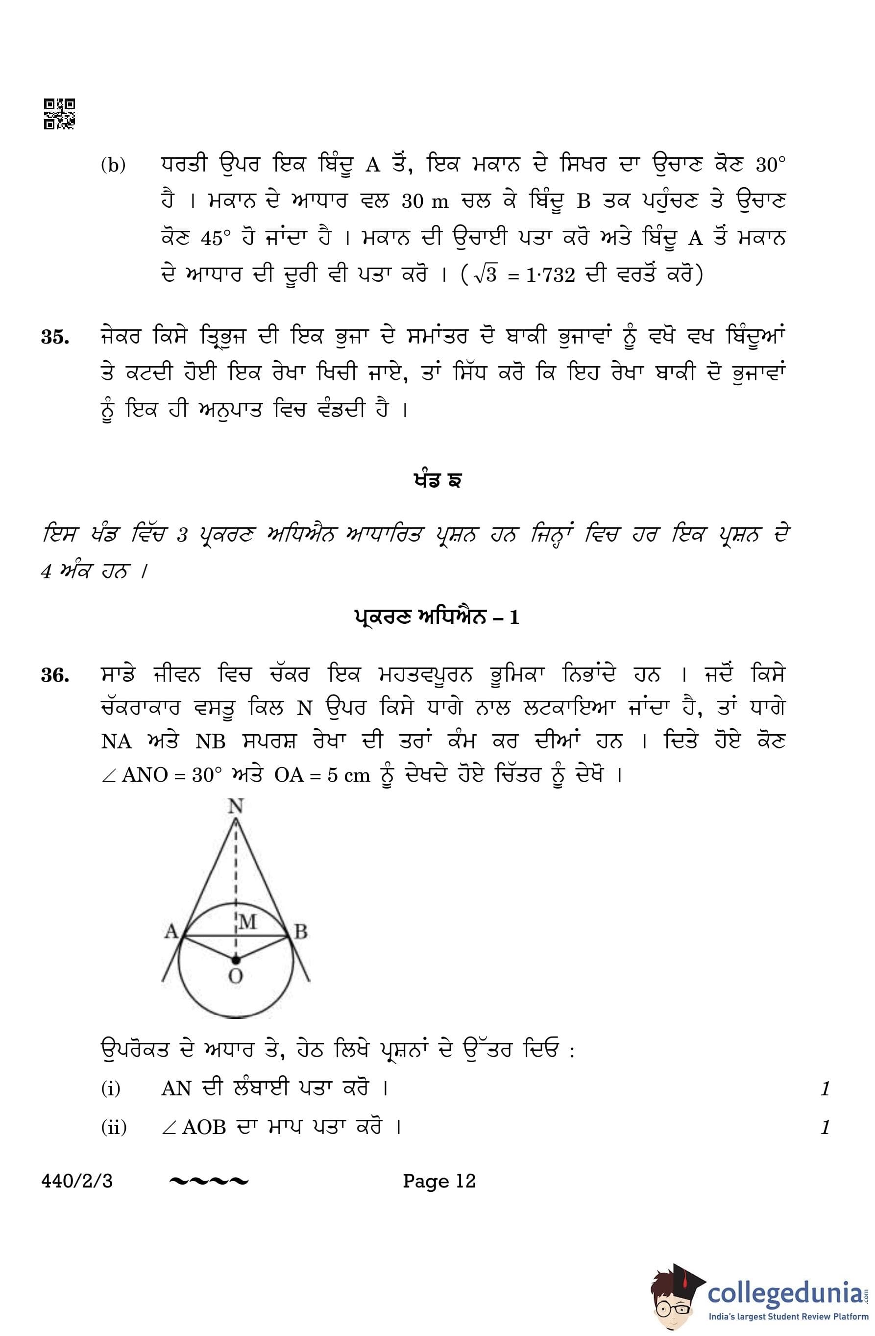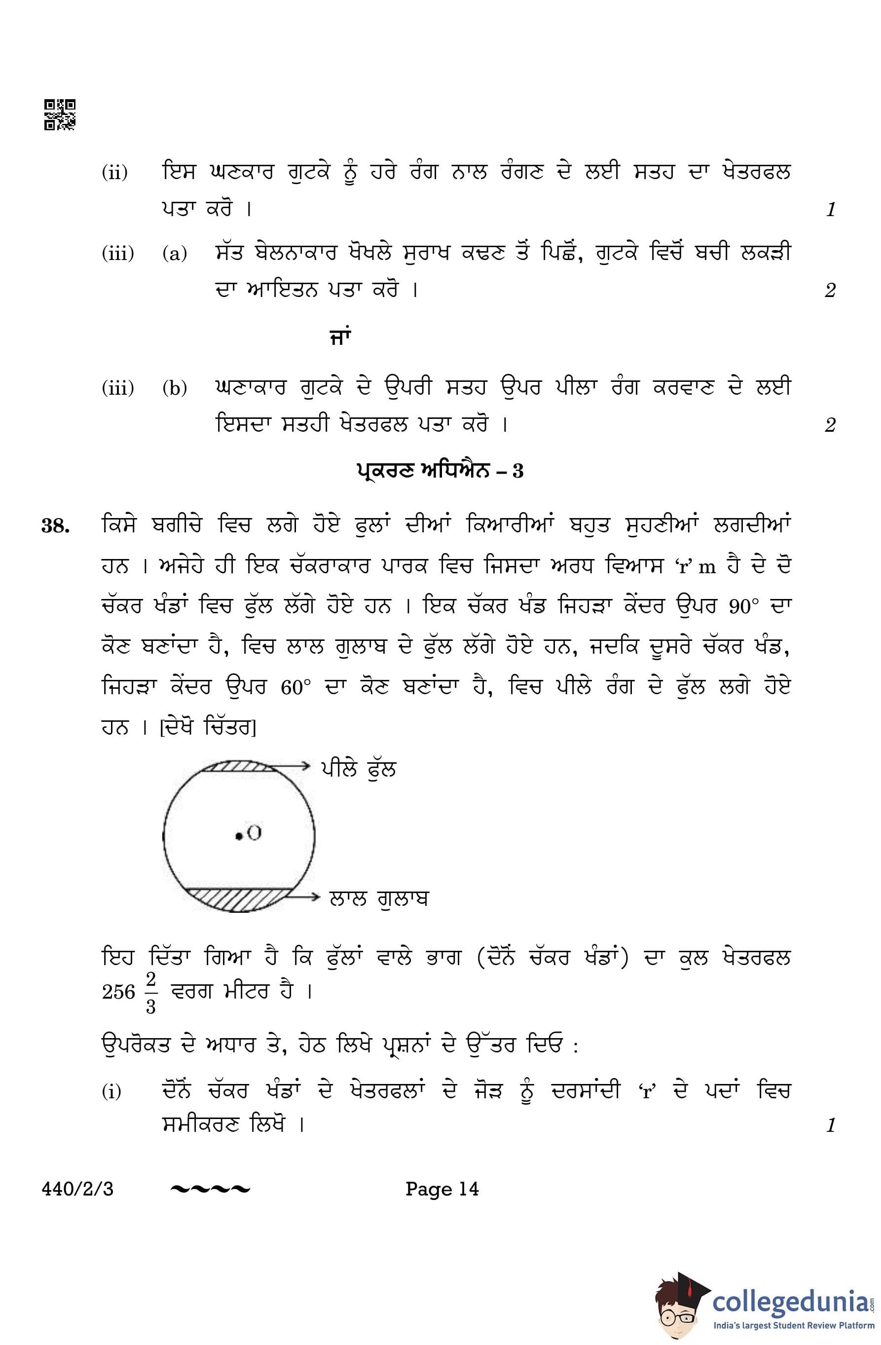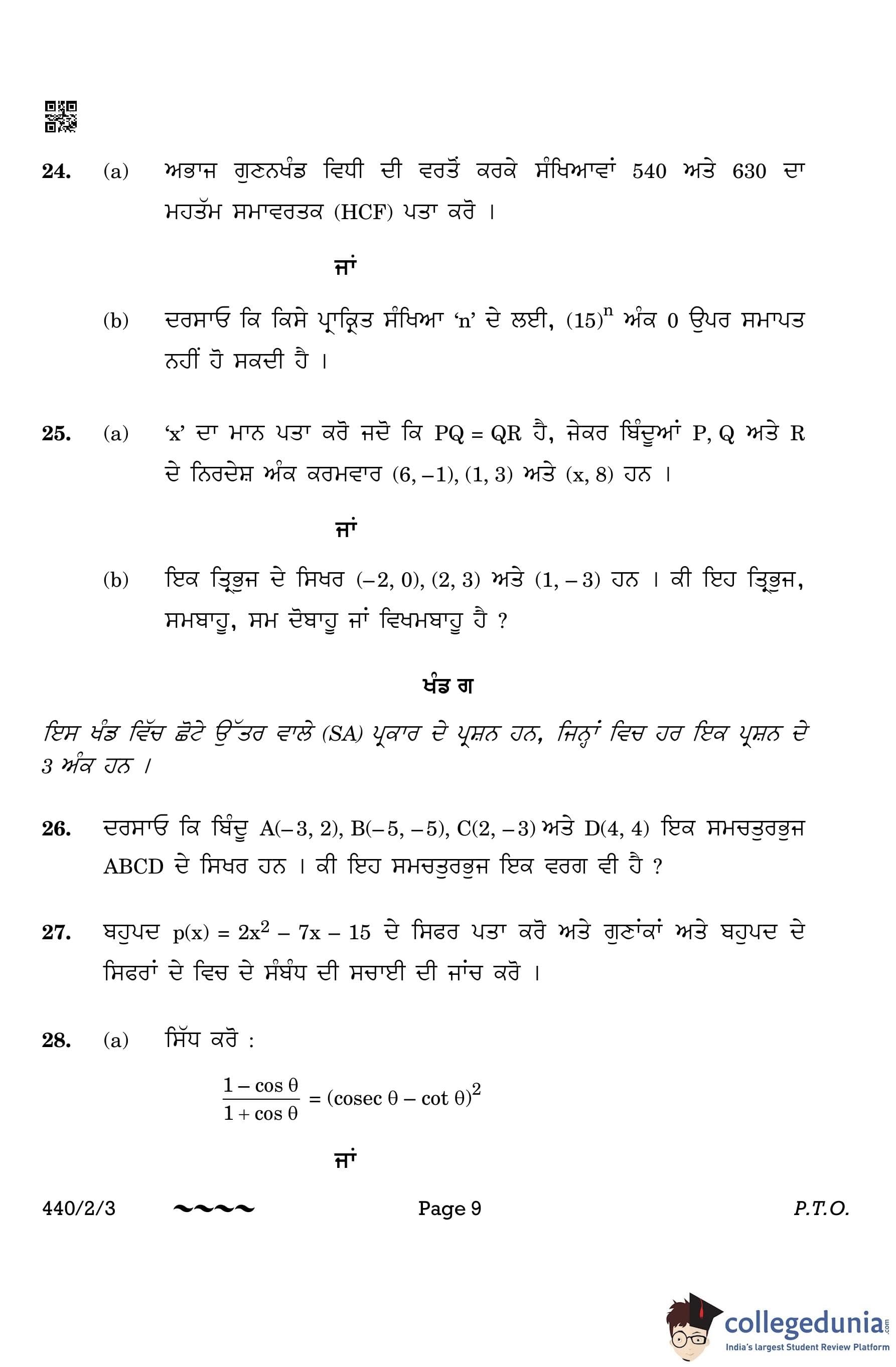 CBSE Class 10 Mathematics Basic (Punjabi Version) (Set 3) Question Paper 2023 with Answer Key