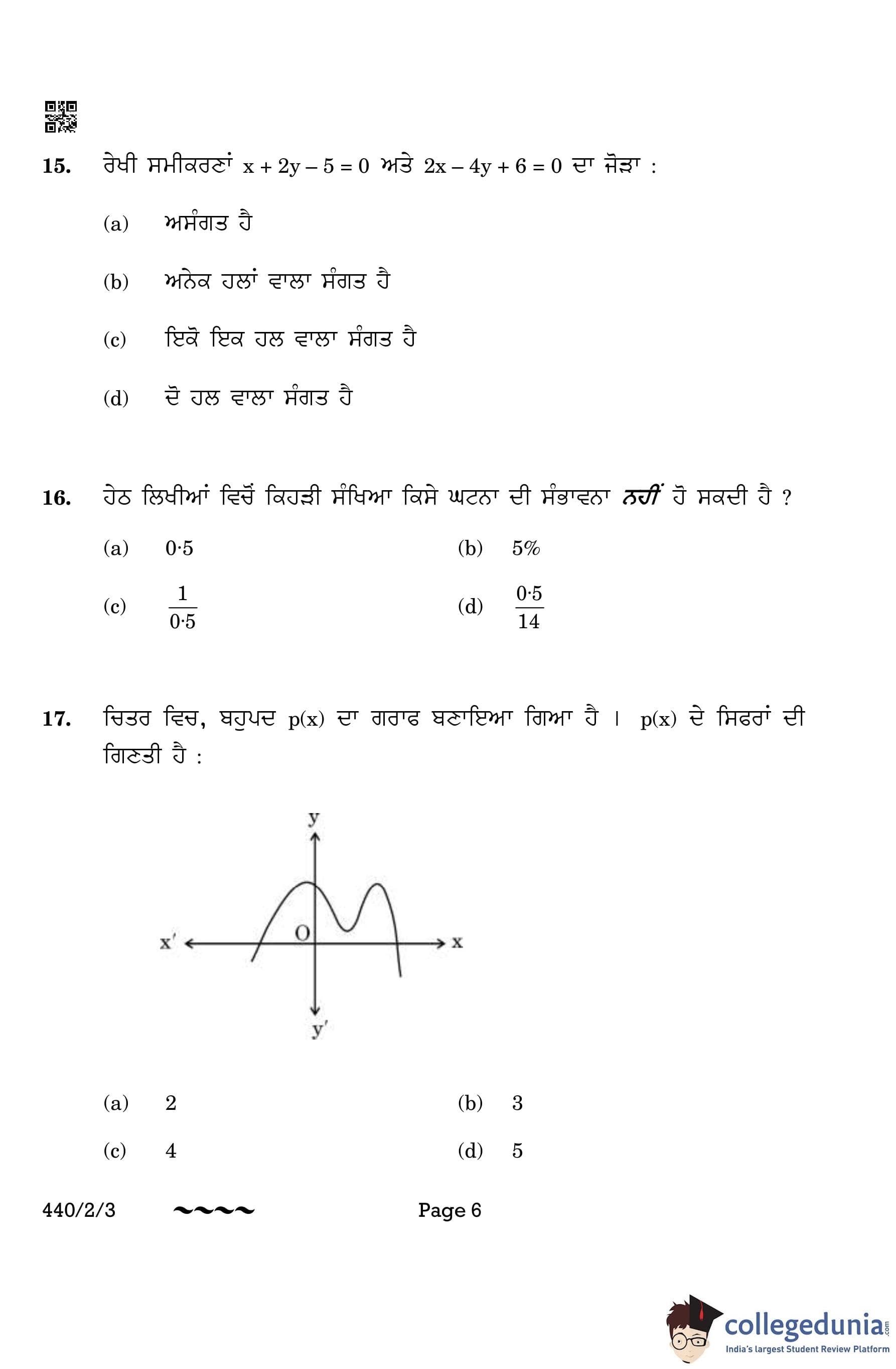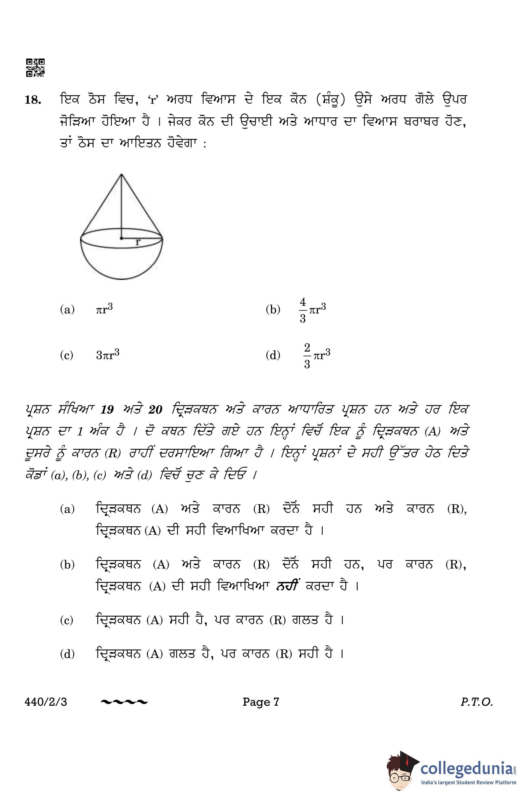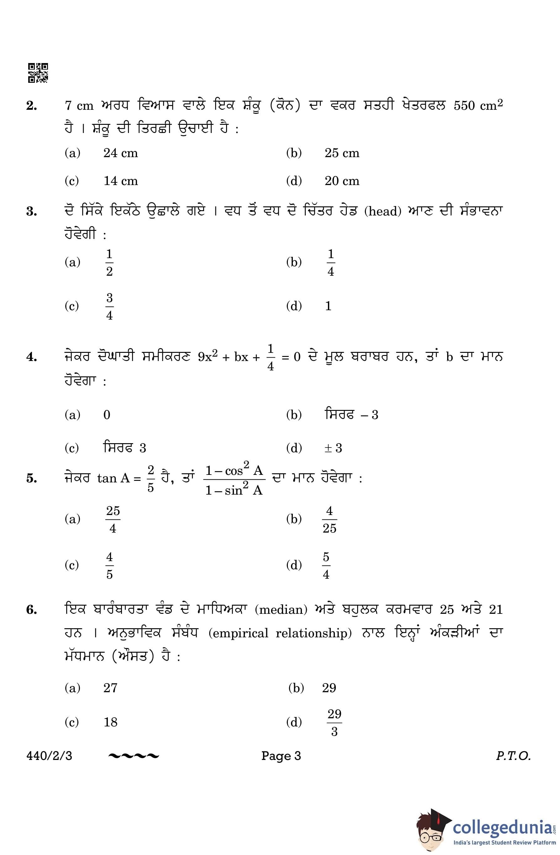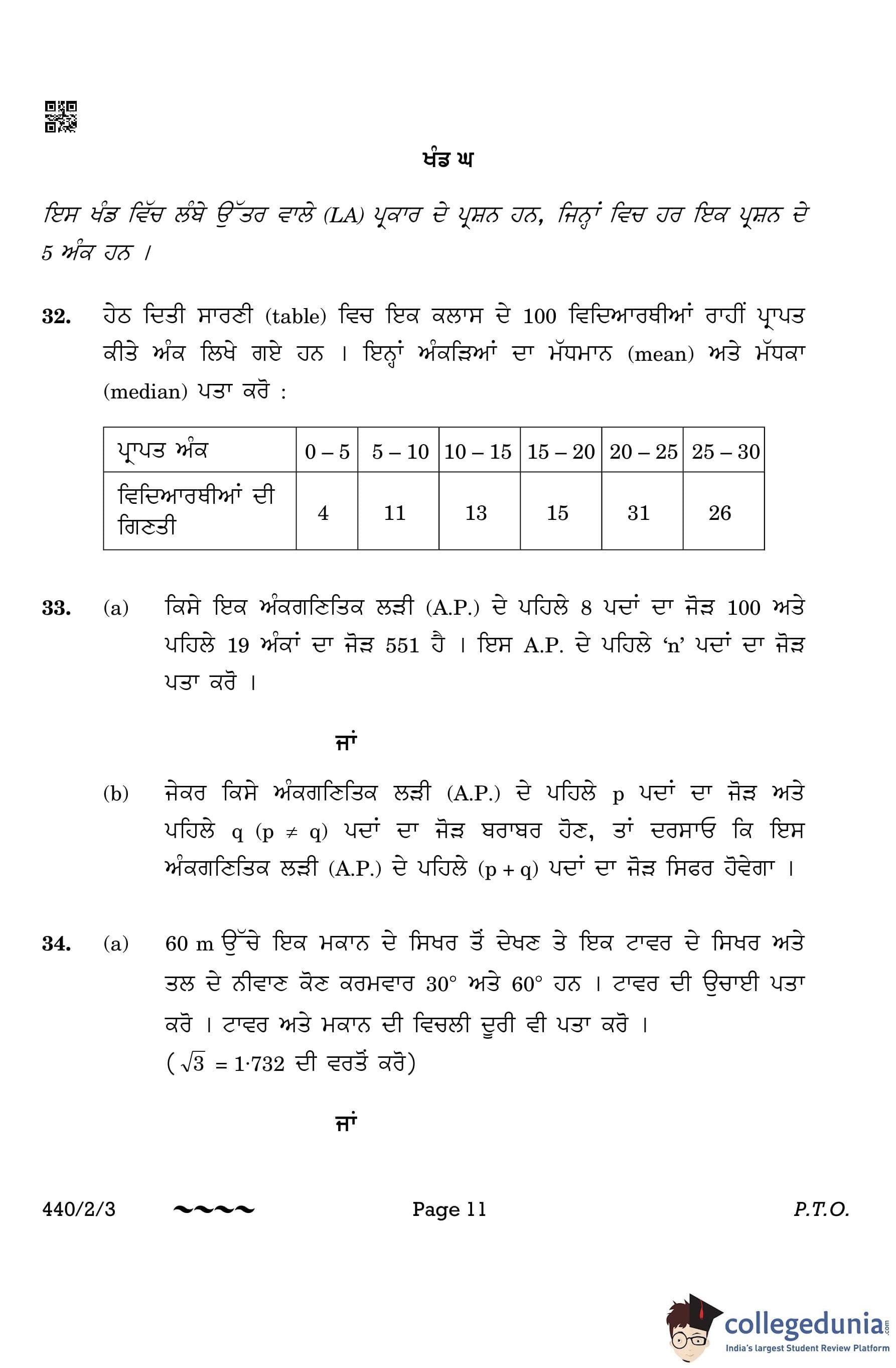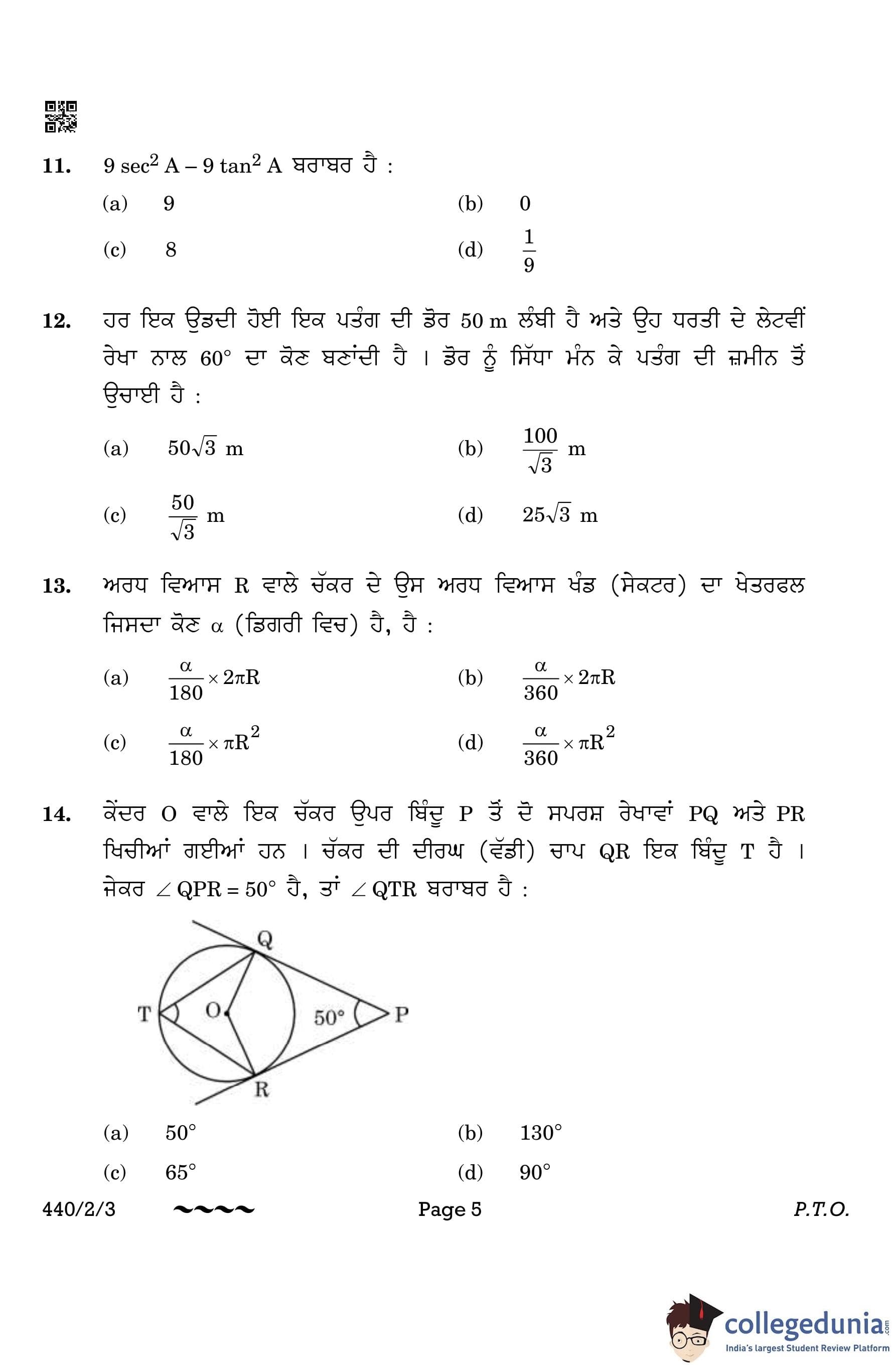 CBSE Class 10 Mathematics Basic (Punjabi Version) (Set 3) Question Paper 2023 with Answer Key