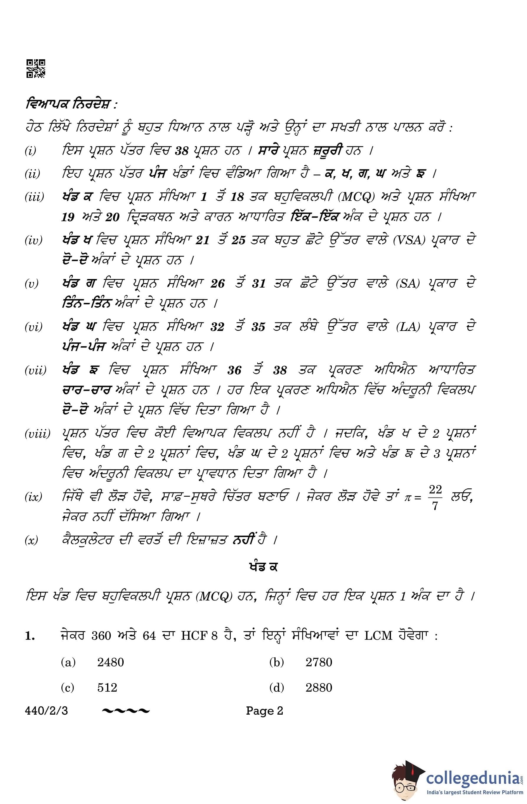 CBSE Class 10 Mathematics Basic Question Paper 2023 with Answer Key (Punjabi Version) (Set 3) is available for download here. The exam was conducted by the Central Board of Secondary Education on March 21, 2023 in the Morning Session 10:30 AM to 1:30 PM. The medium of paper was Punjabi. According to initial student reaction, the CBSE Class 10 Mathematics Basic paper was rated as Moderate in difficulty level. The question paper comprised a total of 38 questions divided among 5 sections.