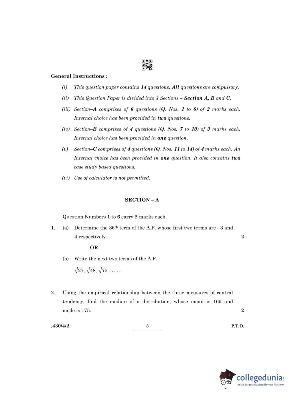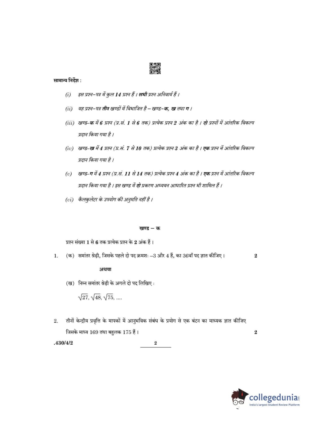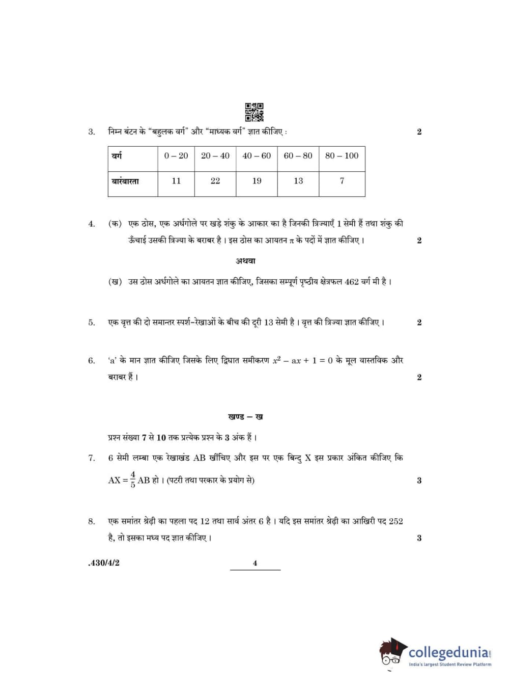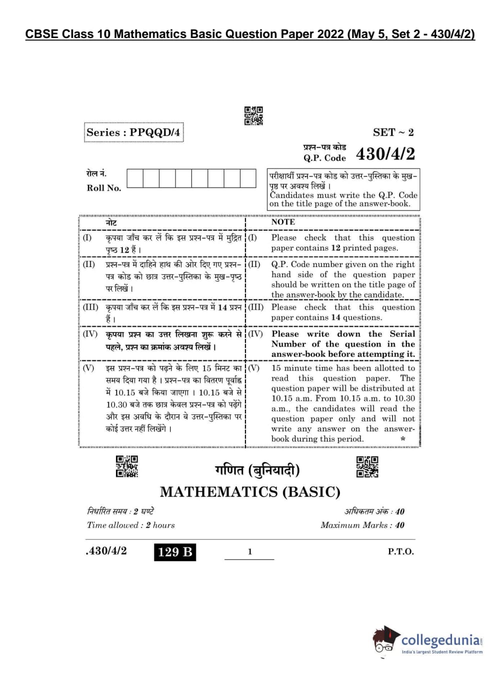 CBSE Class 10 Mathematics Basic Question Paper 2022 with Answer Key Set 2 - 430/4/2 is available for download. The exam was conducted by the Central Board of Secondary Education on May 5, 2022 in the Morning Session 10:30 AM to 12:30 PM. The medium of paper was English & Hindi. The question paper comprised a total of 14 questions divided among 3 sections.