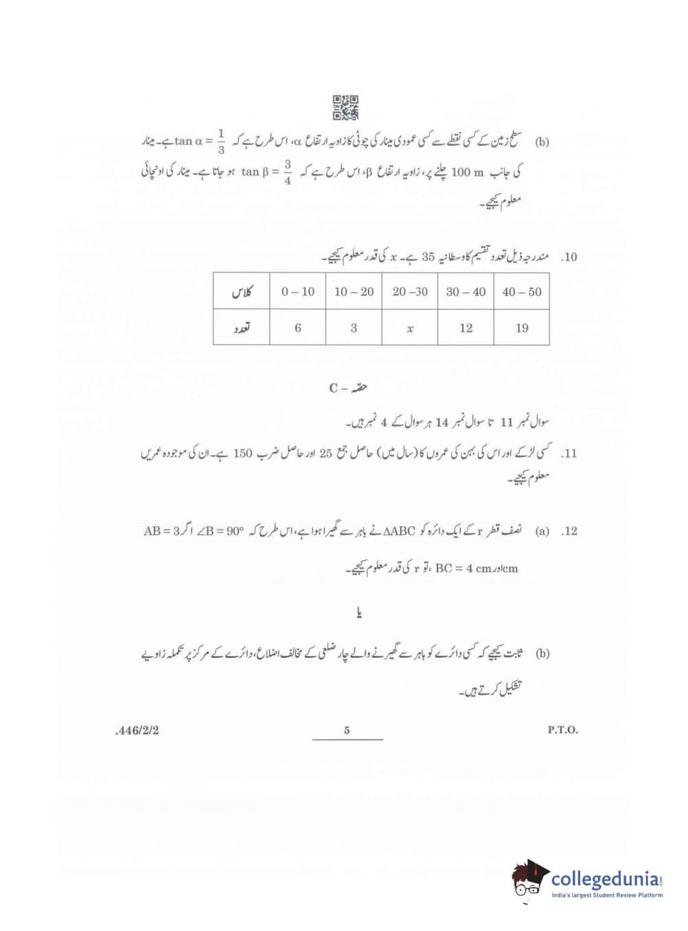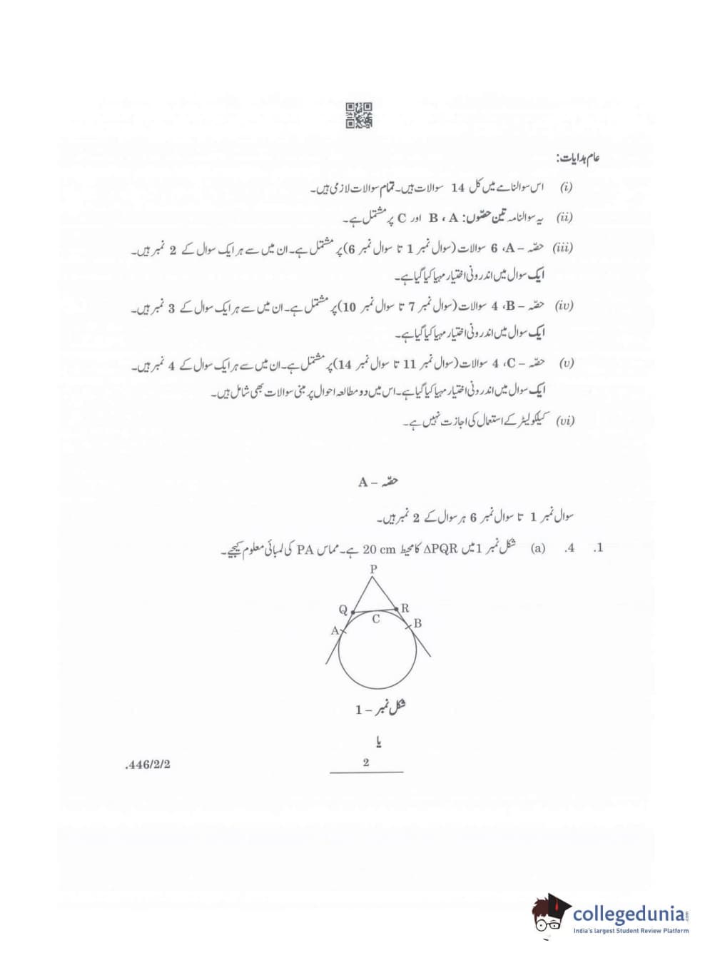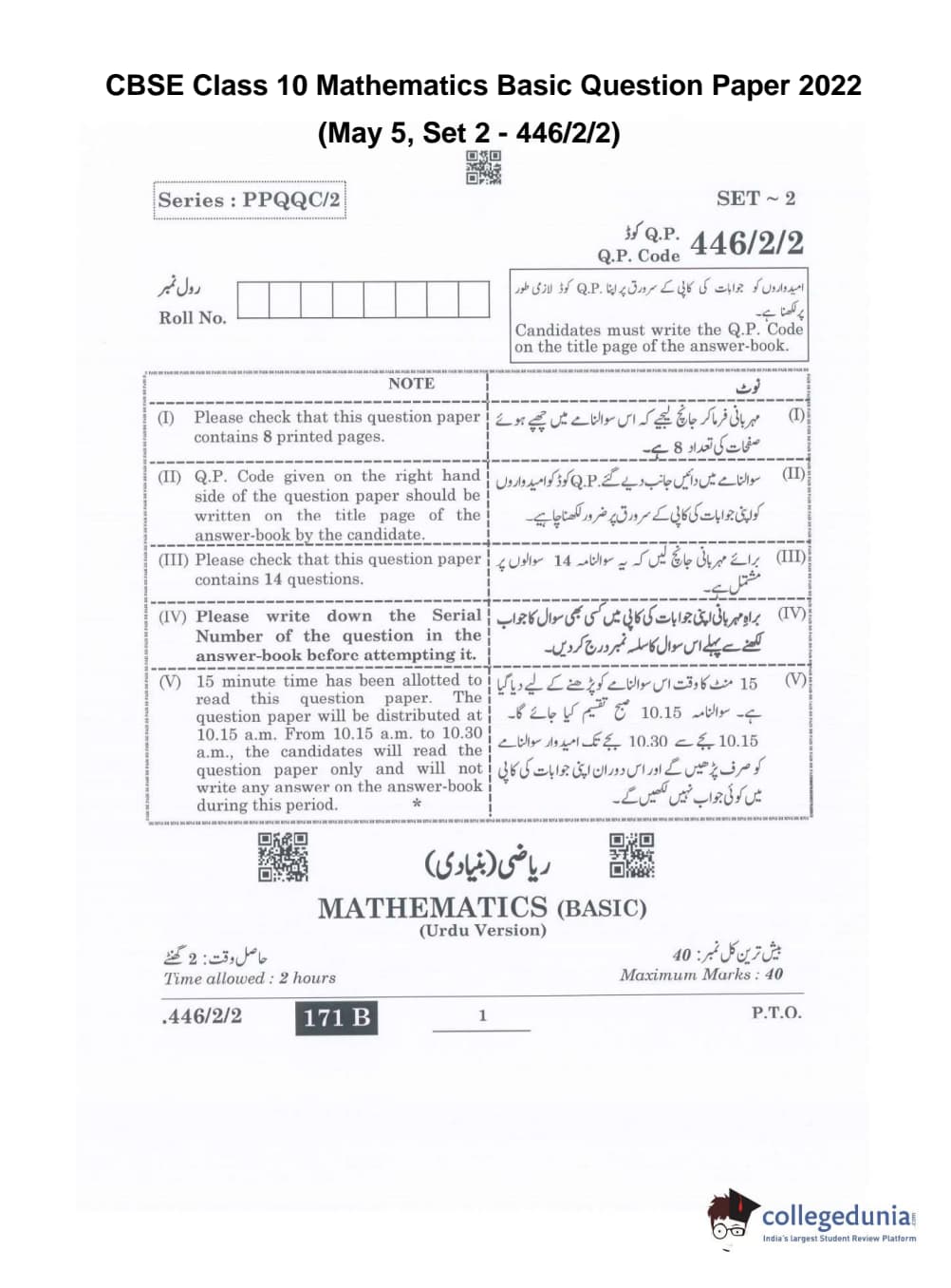 CBSE Class 10 Mathematics Basic Question Paper 2022 with Answer Key Set 2 - 446/2/2 is available for download. The exam was conducted by the Central Board of Secondary Education on May 5, 2022 in the Morning Session 10:30 AM to 12:30 PM. The medium of paper was Urdu. The question paper comprised a total of 14 questions divided among 3 sections.