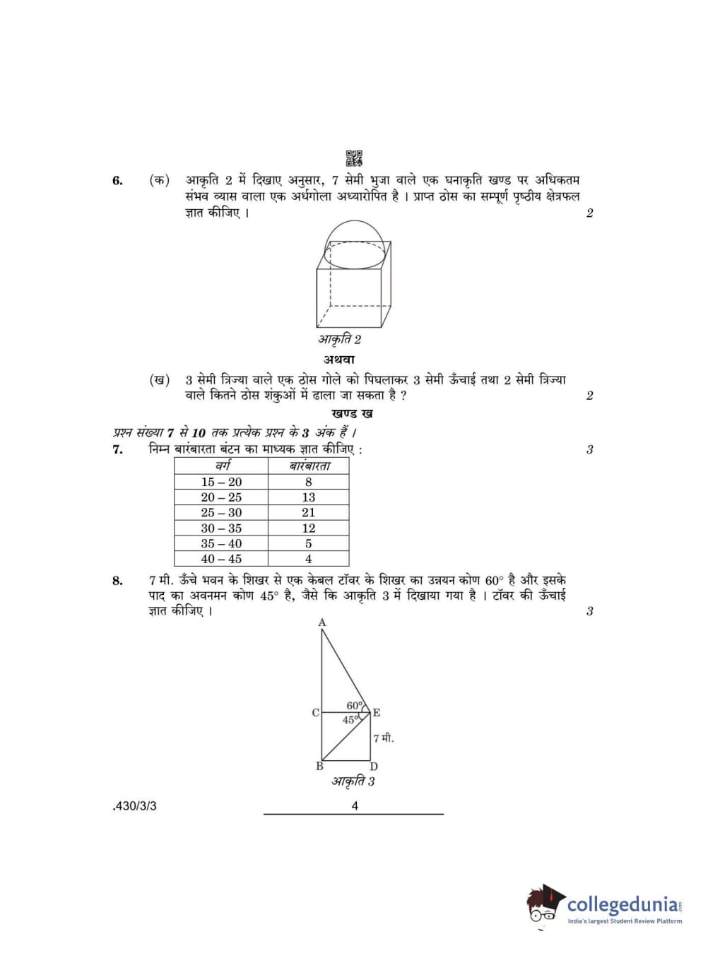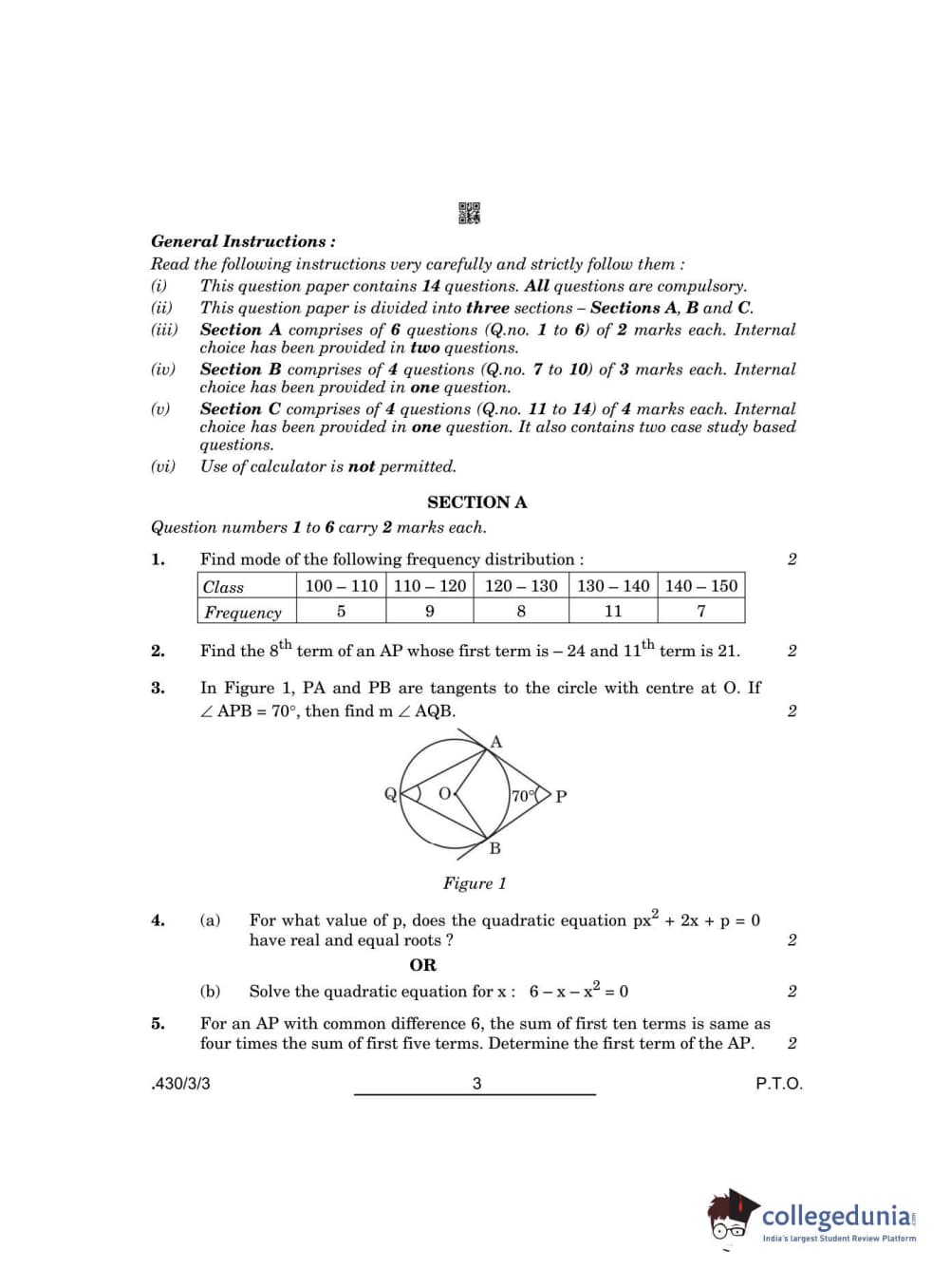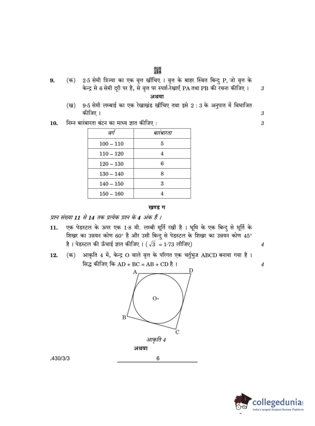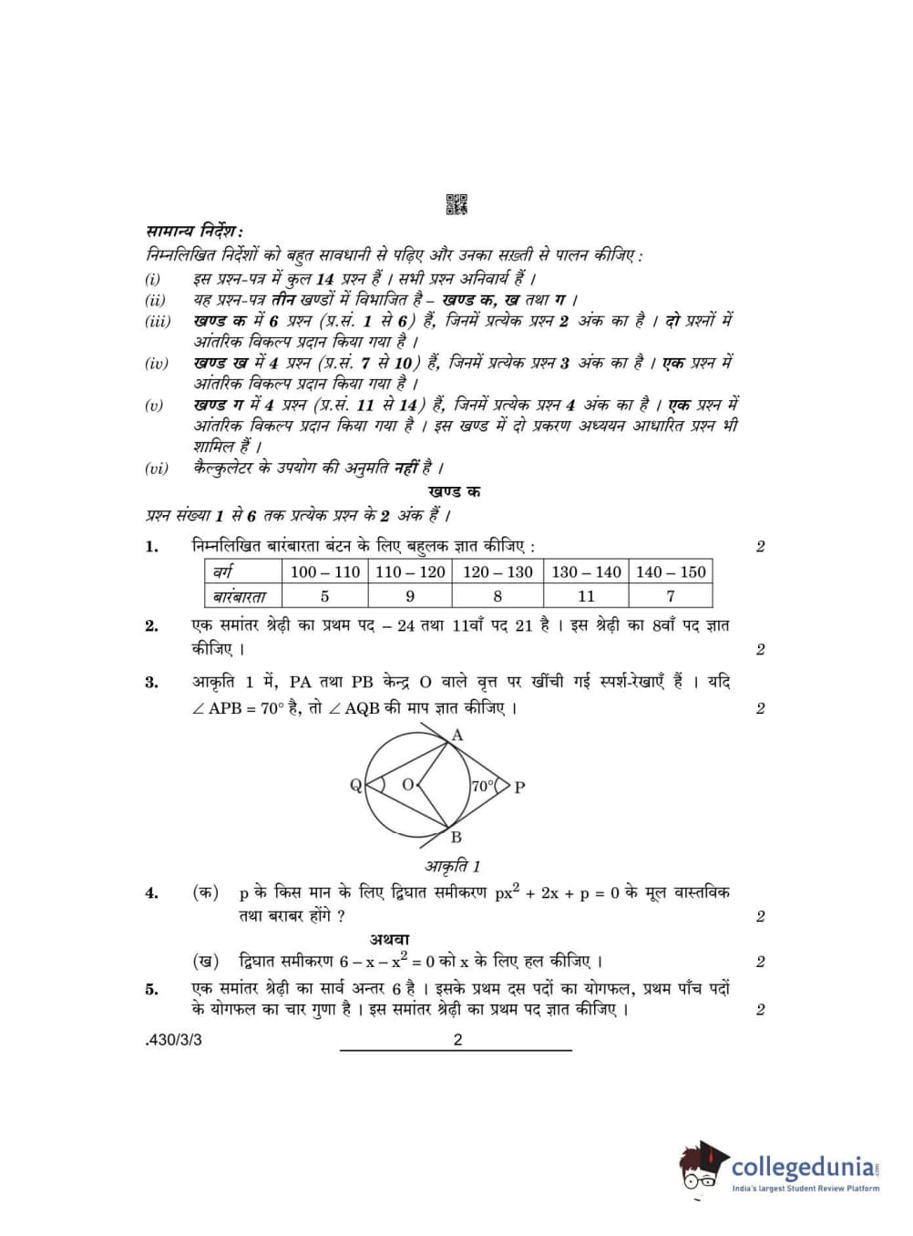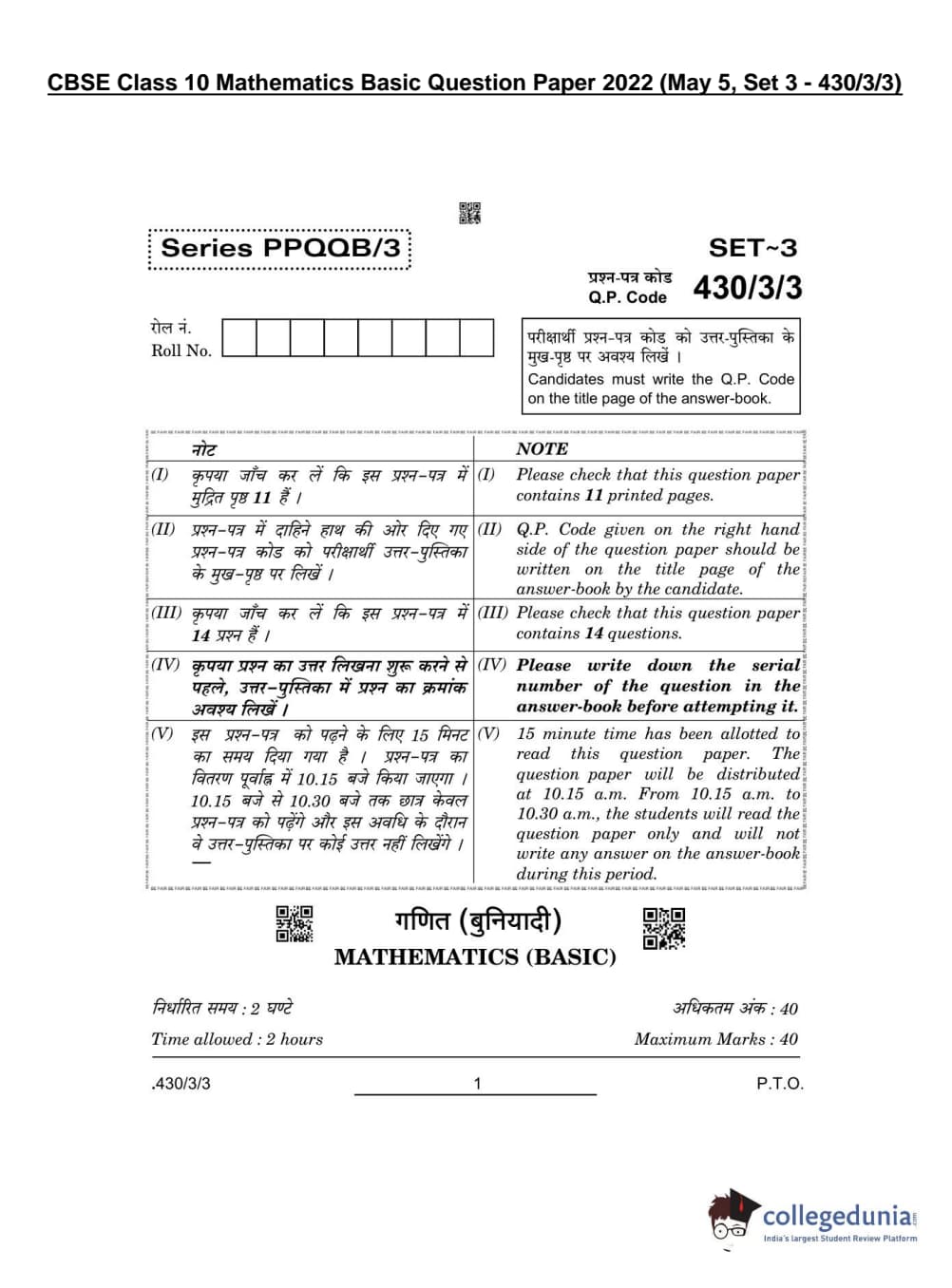 CBSE Class 10 Mathematics Basic Question Paper 2022 with Answer Key Set 3 - 430/3/3 is available for download. The exam was conducted by the Central Board of Secondary Education on May 5, 2022 in the Morning Session 10:30 AM to 12:30 PM. The medium of paper was English & Hindi. The question paper comprised a total of 14 questions divided among 3 sections.