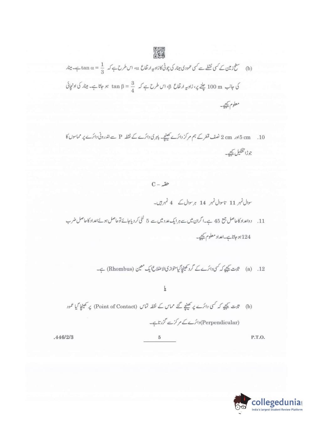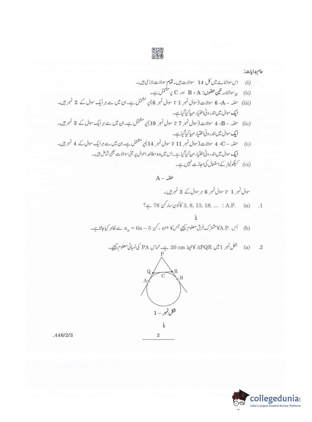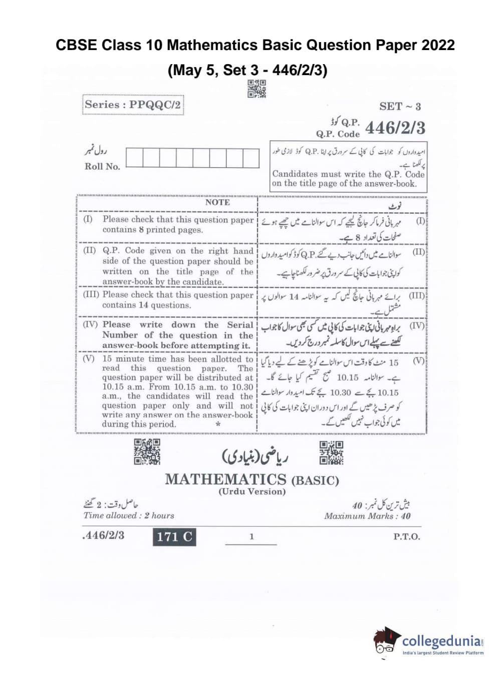 CBSE Class 10 Mathematics Basic Question Paper 2022 with Answer Key Set 3 - 446/2/3 is available for download. The exam was conducted by the Central Board of Secondary Education on May 5, 2022 in the Morning Session 10:30 AM to 12:30 PM. The medium of paper was Urdu. The question paper comprised a total of 14 questions divided among 3 sections.