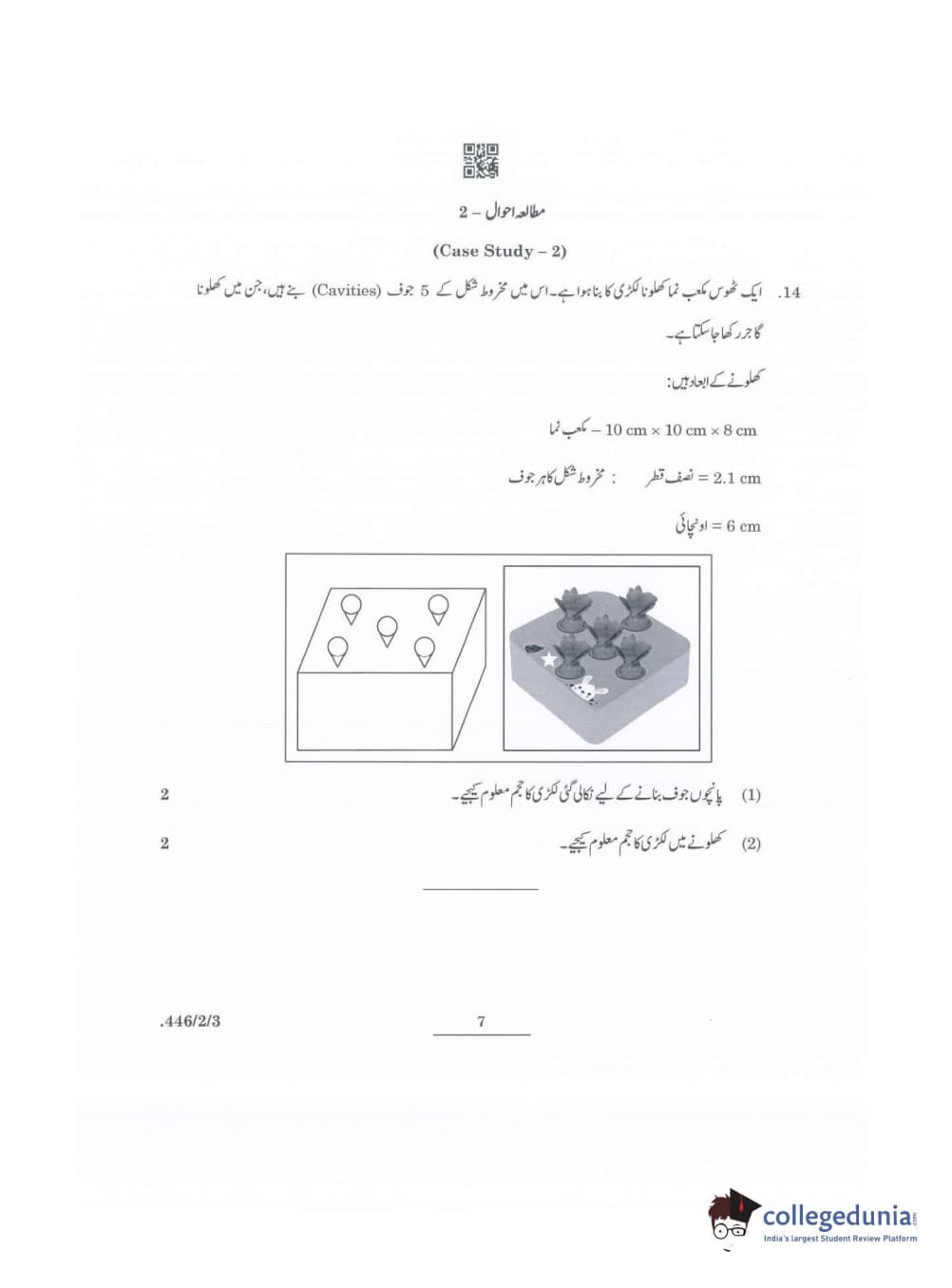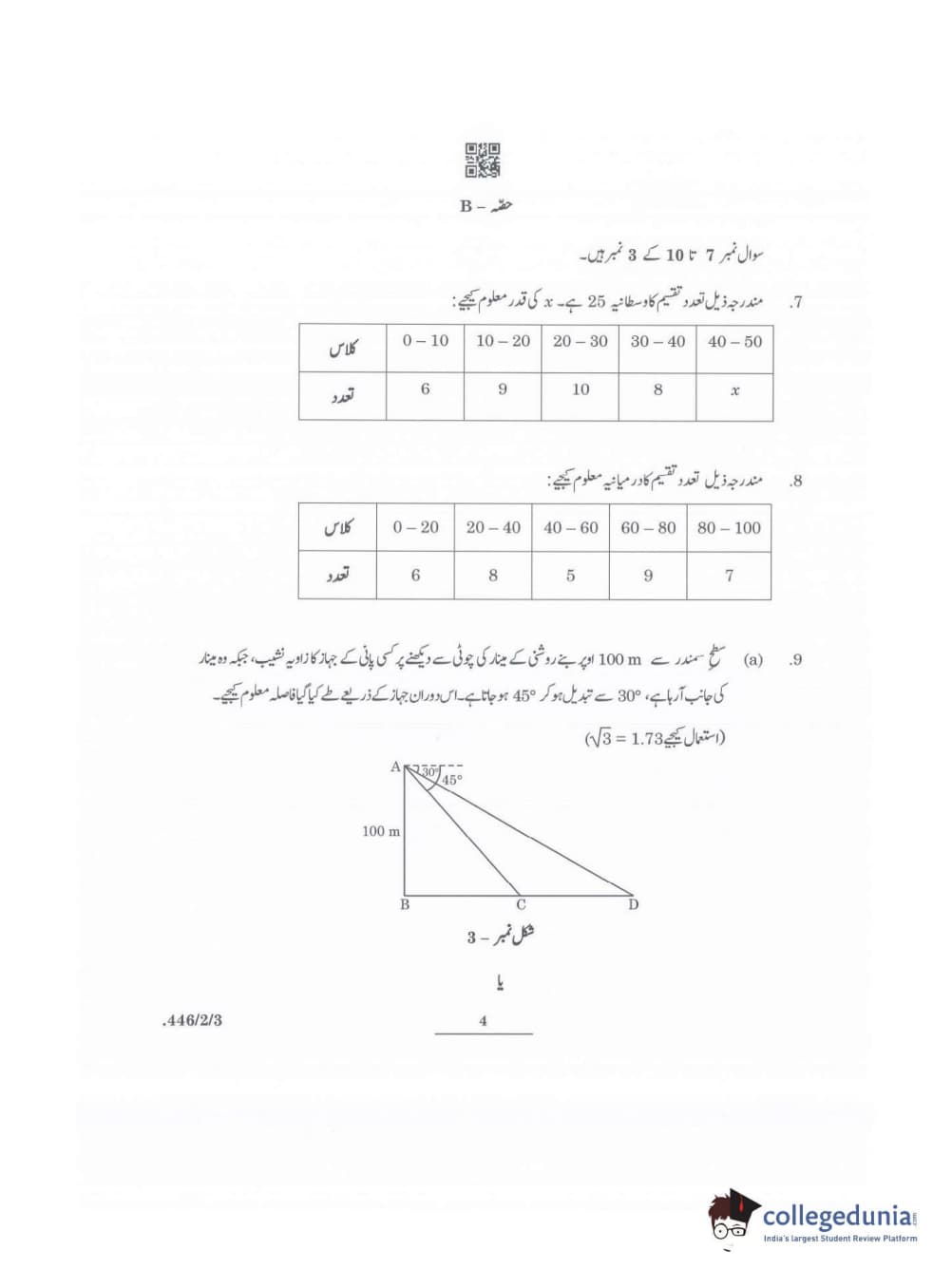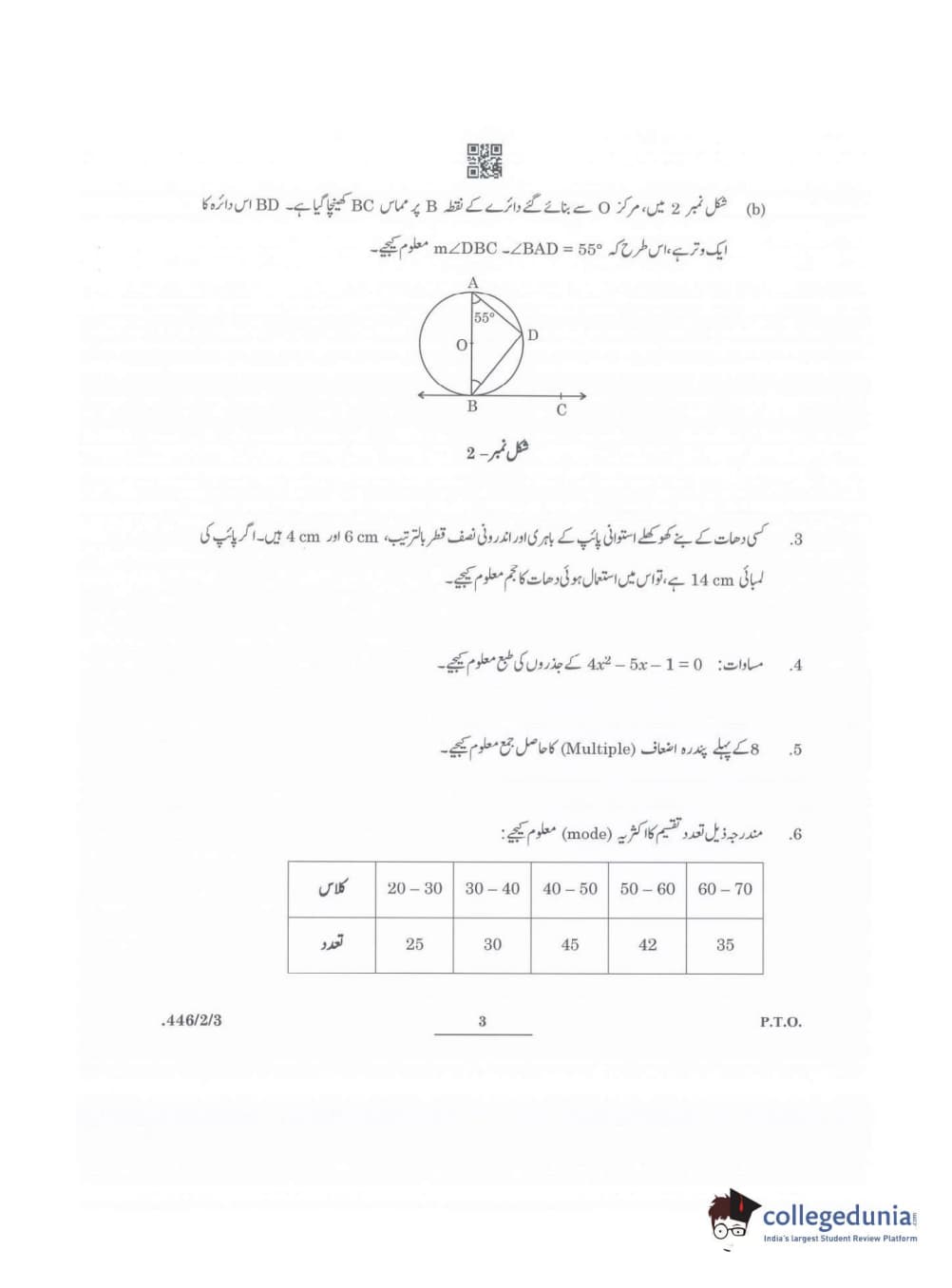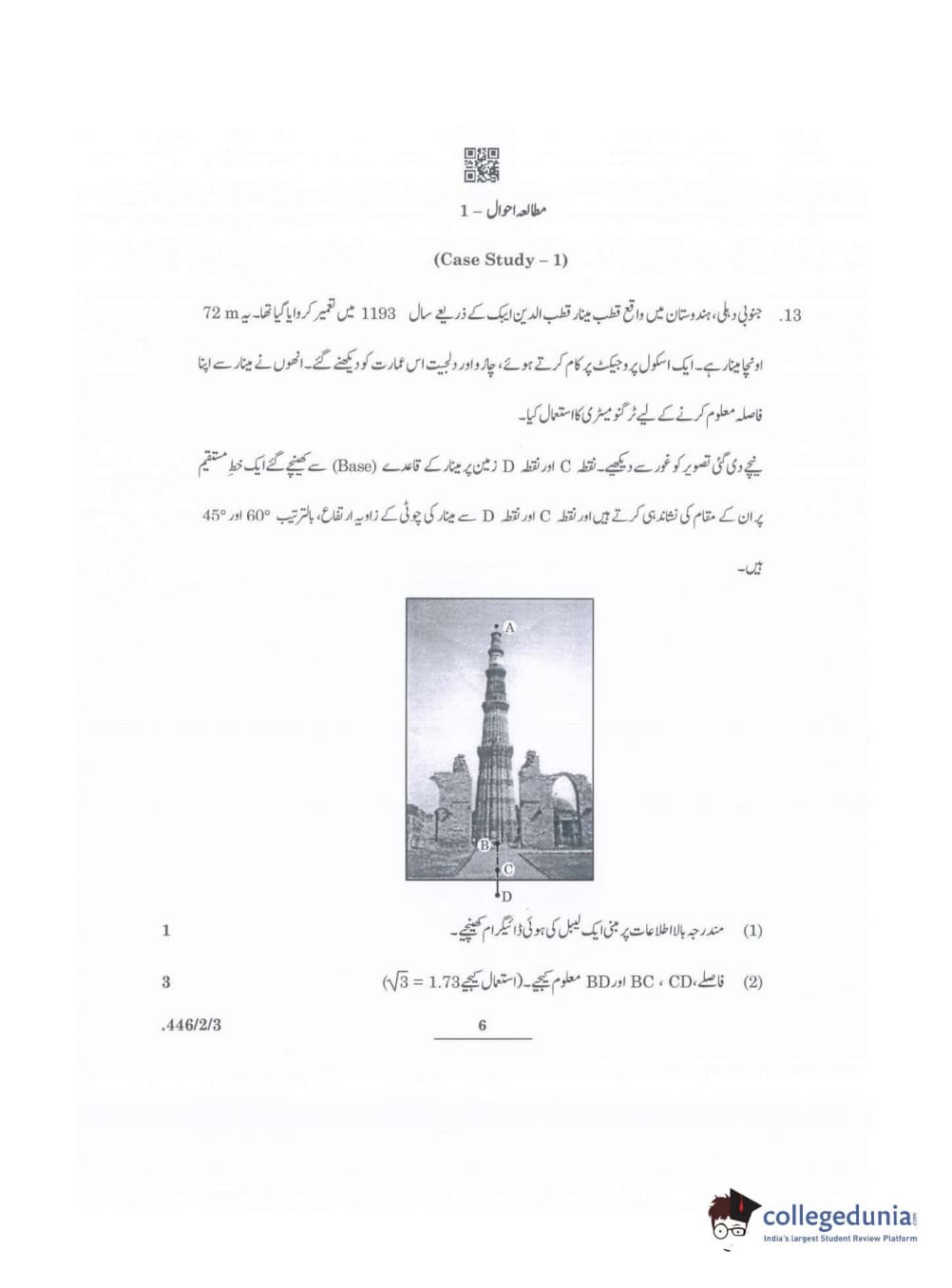 CBSE Class 10 Mathematics Basic Question Paper 2022 with Answer Key Set 3 - 446/2/3 is available for download. The exam was conducted by the Central Board of Secondary Education on May 5, 2022 in the Morning Session 10:30 AM to 12:30 PM. The medium of paper was Urdu. The question paper comprised a total of 14 questions divided among 3 sections.