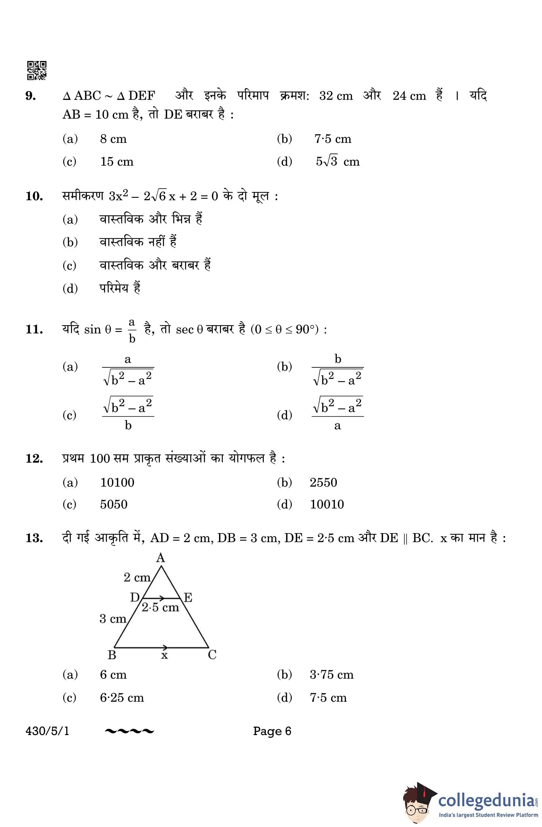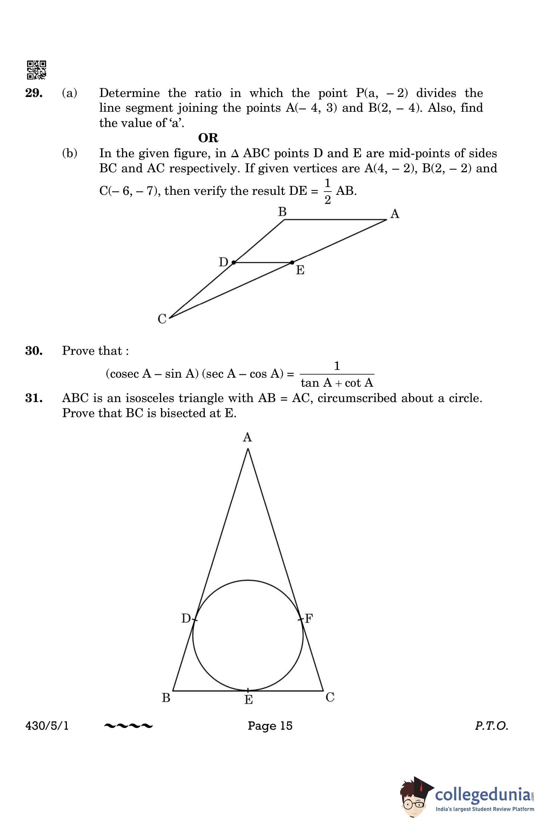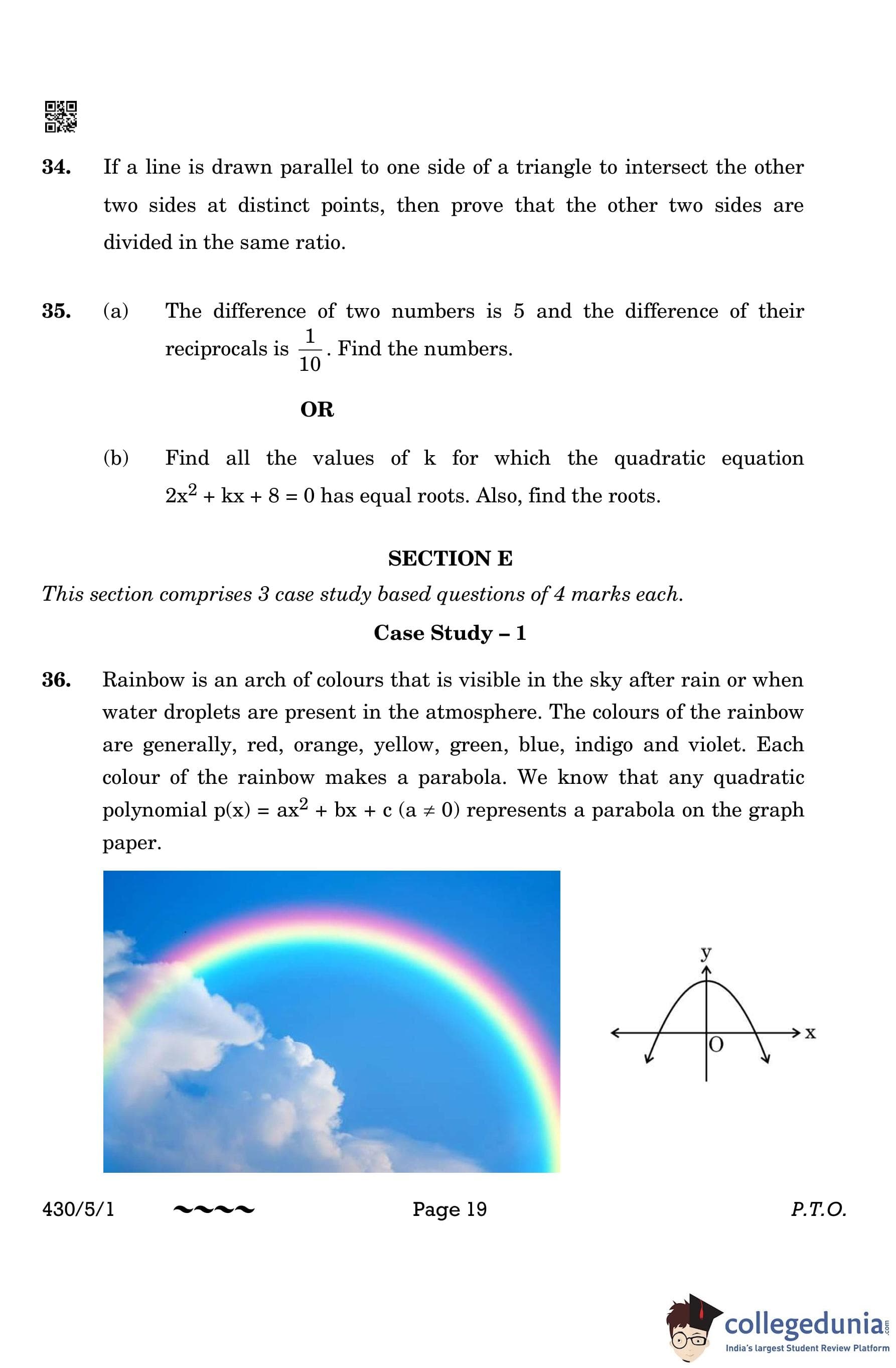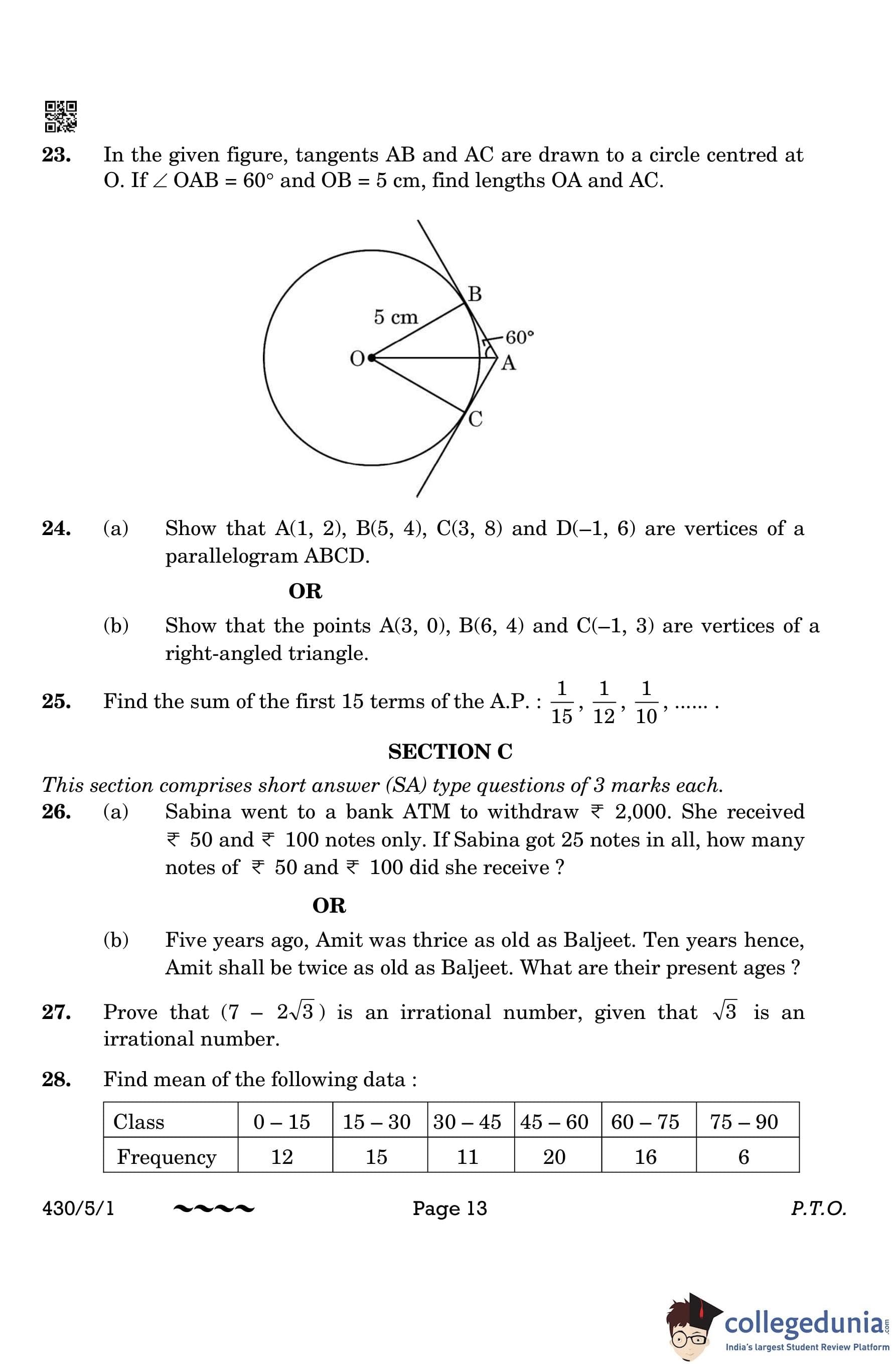 CBSE Class 10 Mathematics Basic (Set 1- 430/5/1) Question Paper 2023 with Answer Key